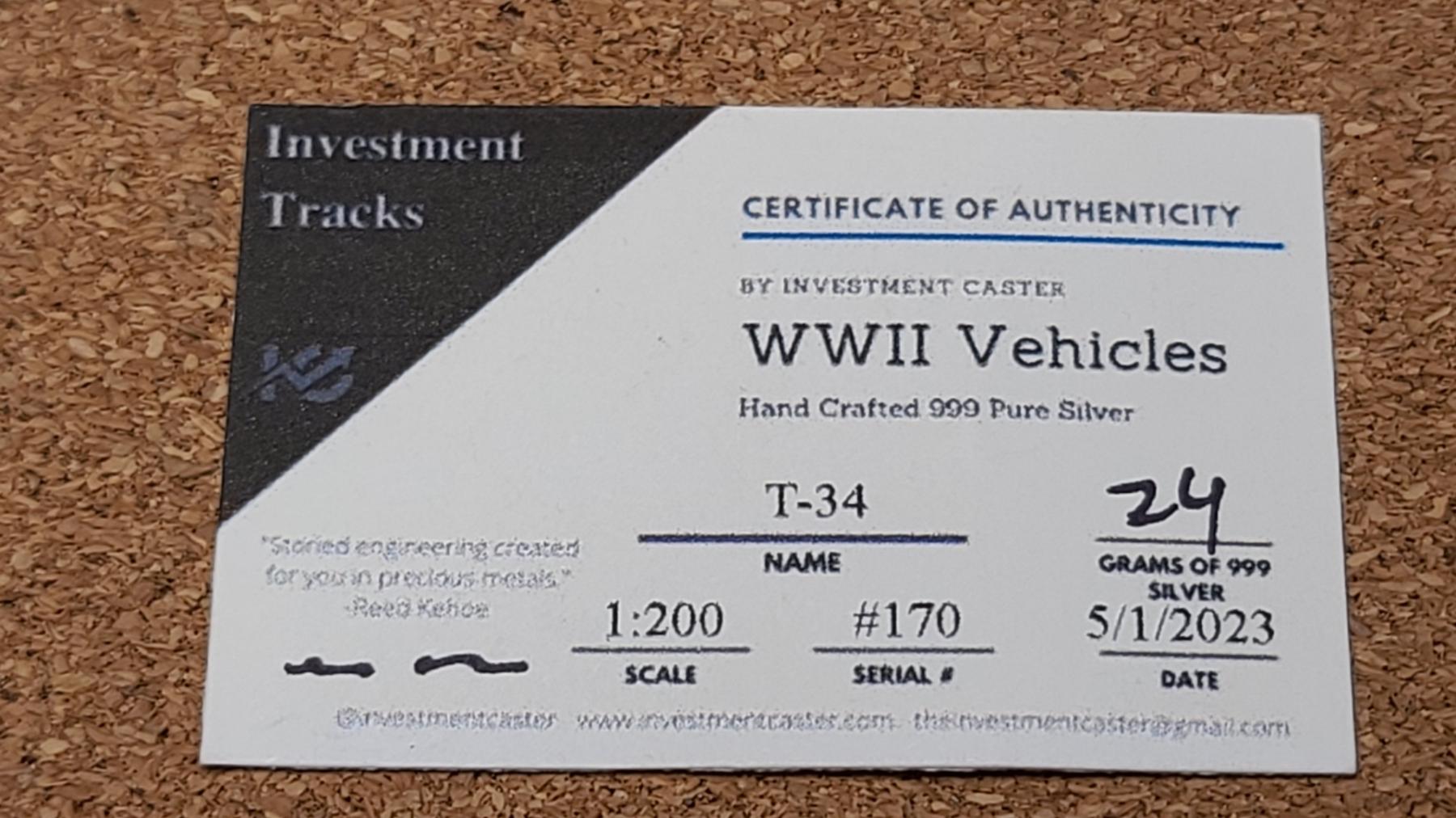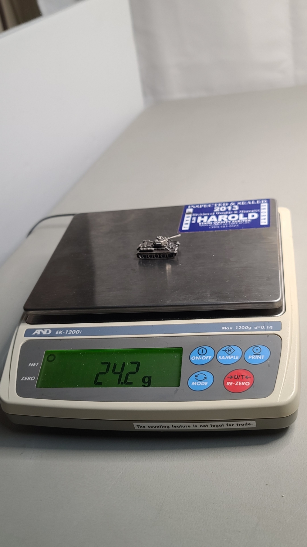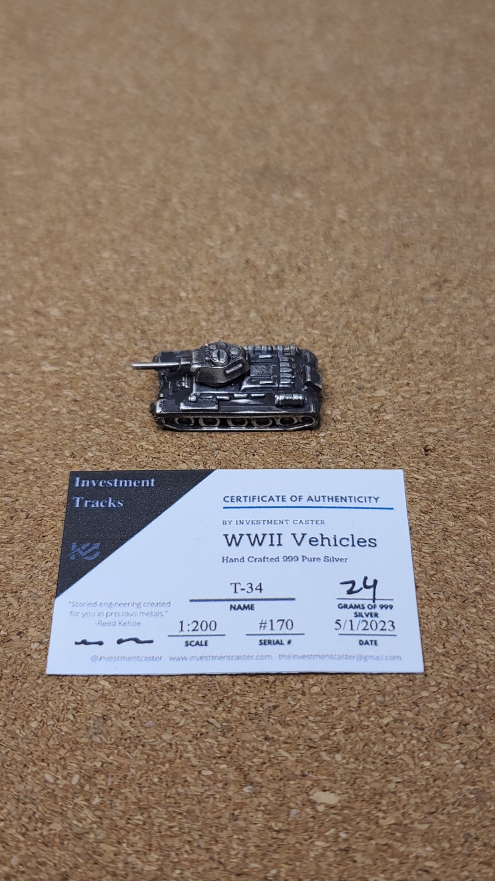 Hand Crafted 1:200 Scale 999 Pure Silver WWII T-34 Vehicle By Investment Caster -Weight: 24.2g