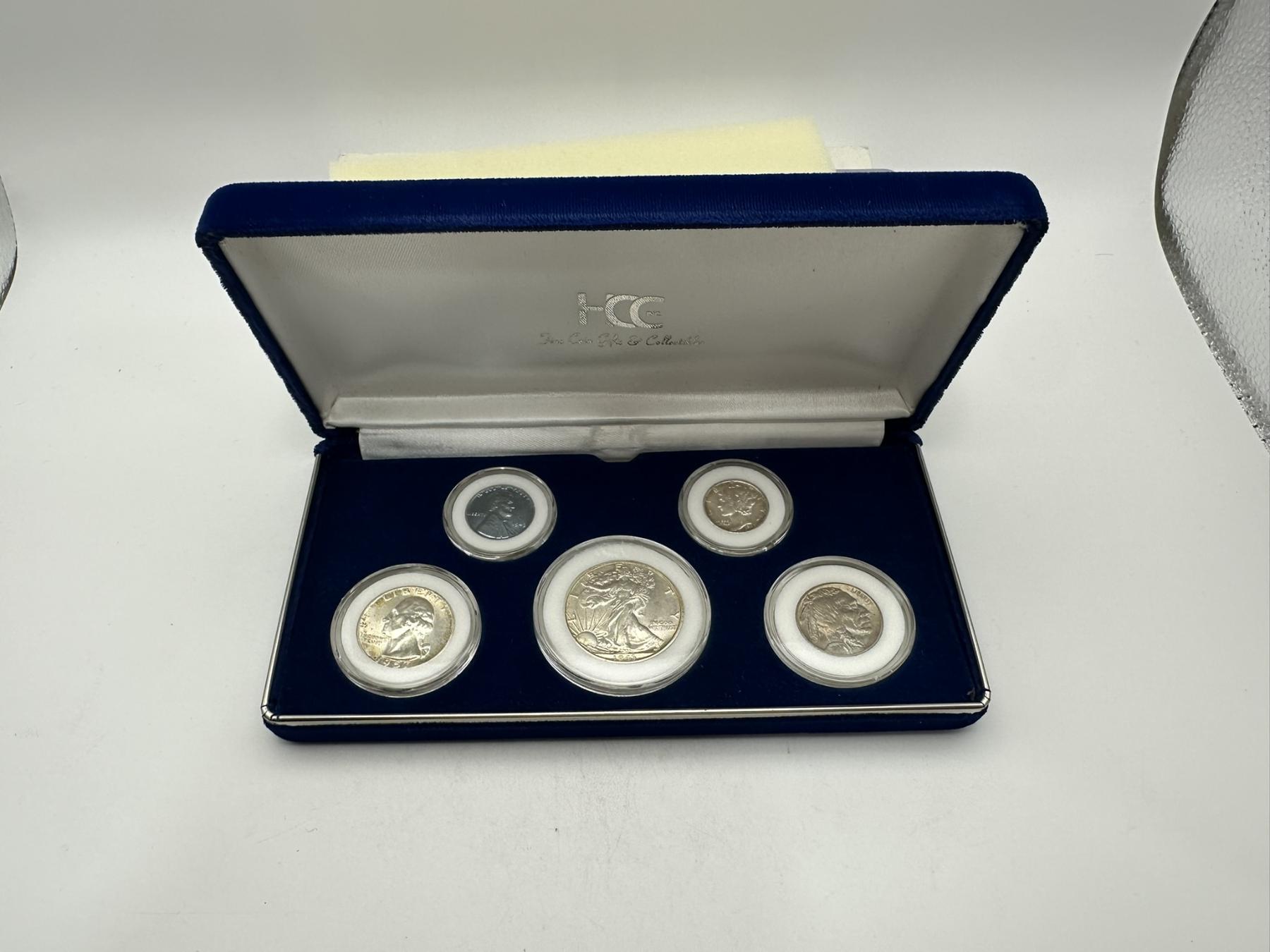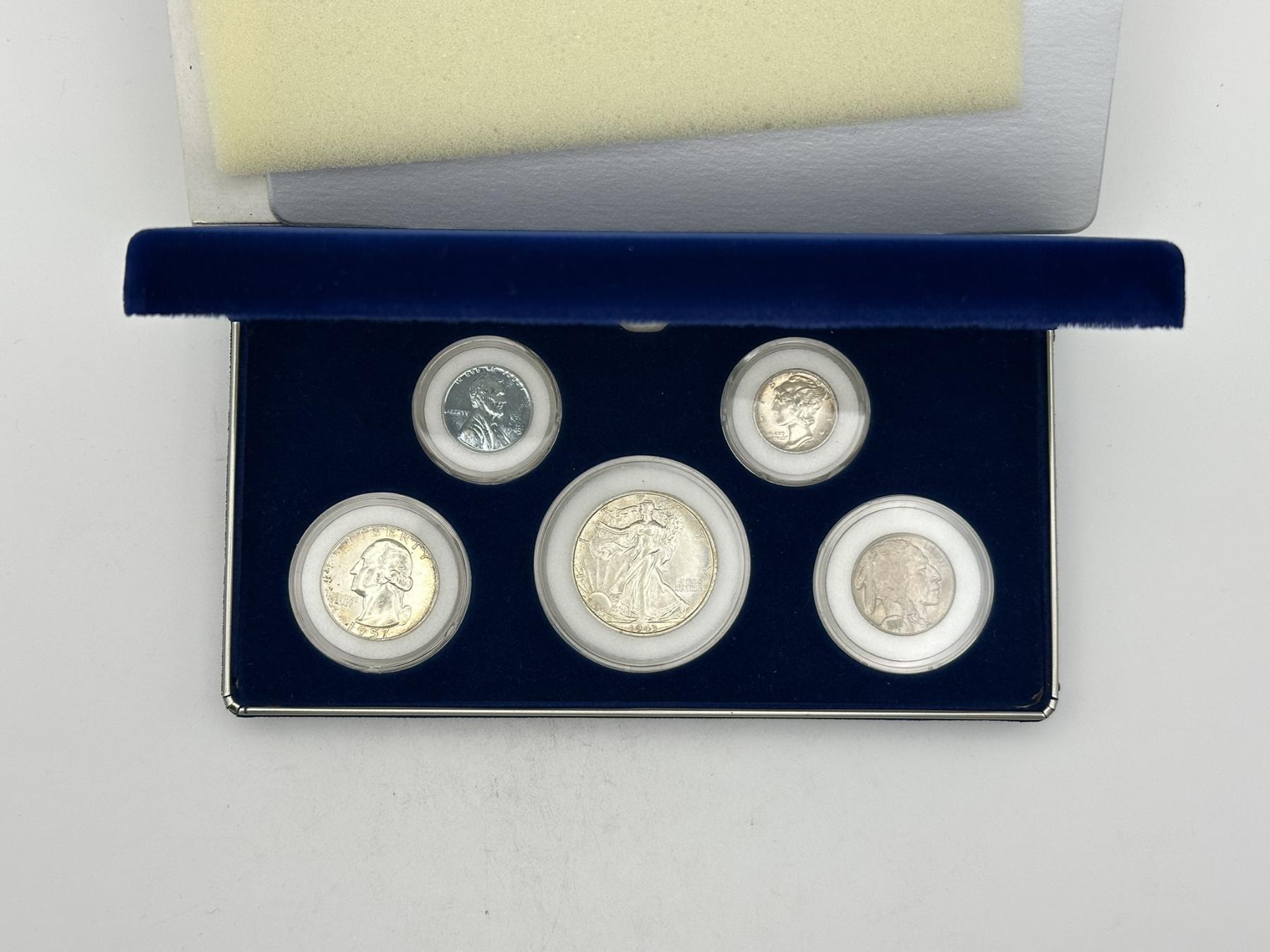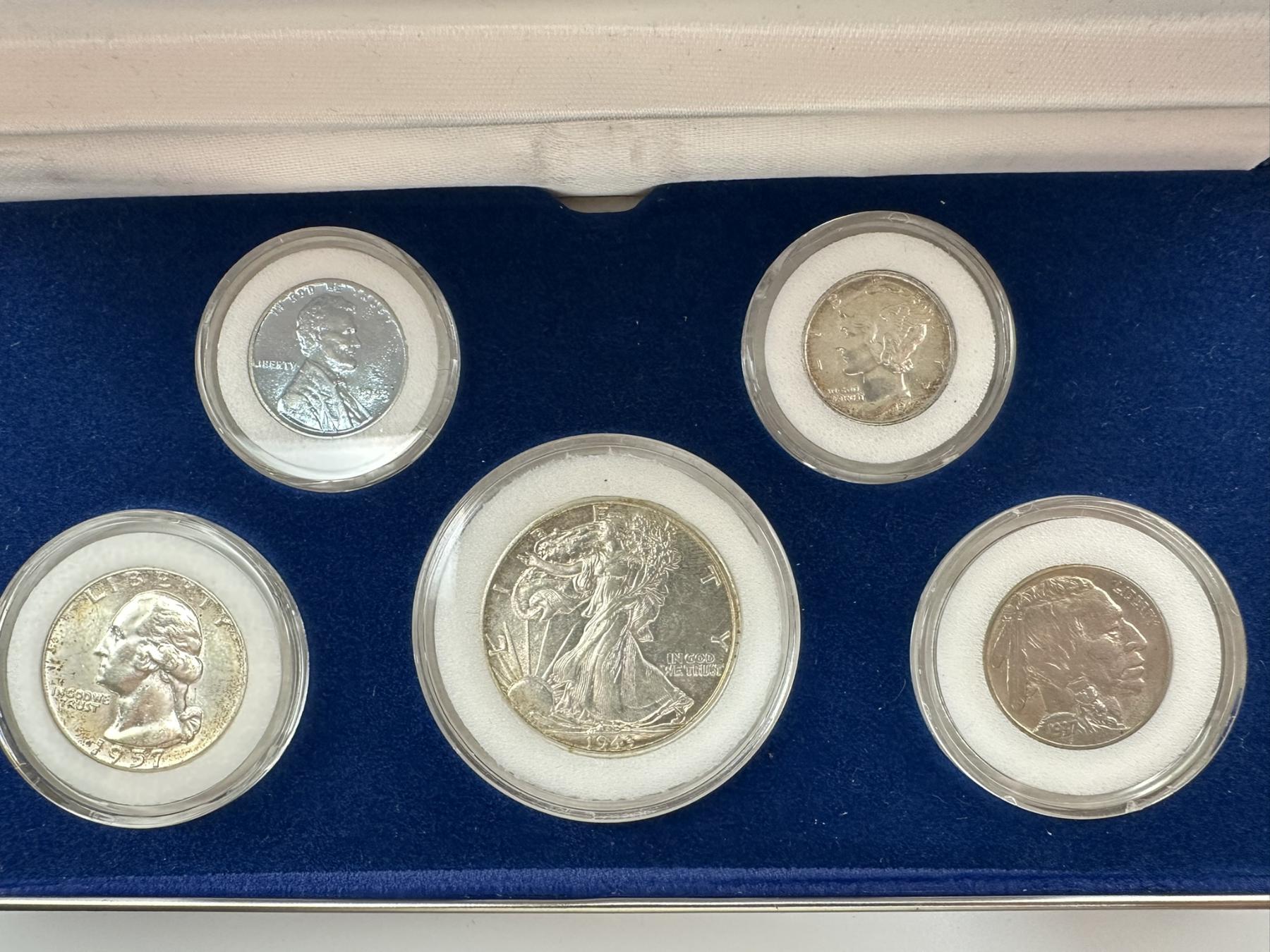Historical United States Coin Display including 90% Silver Walking Half, Silver Washington Quarter, Mercury Dime, Buffalo Nickel, Steel Penny