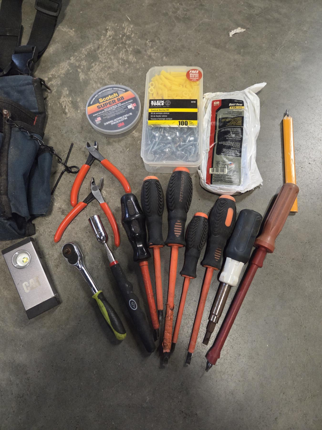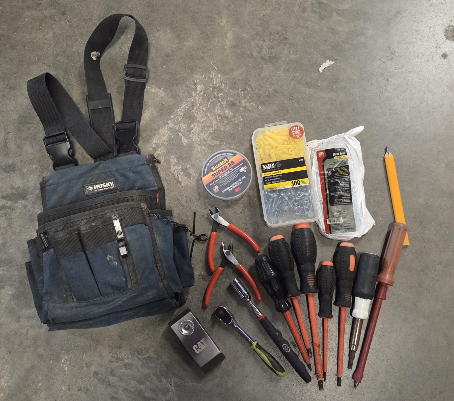 Husky Tool Pouch With Screwdrivers, Snips, Cat Light, Magnet Pick Up Tool, And More!