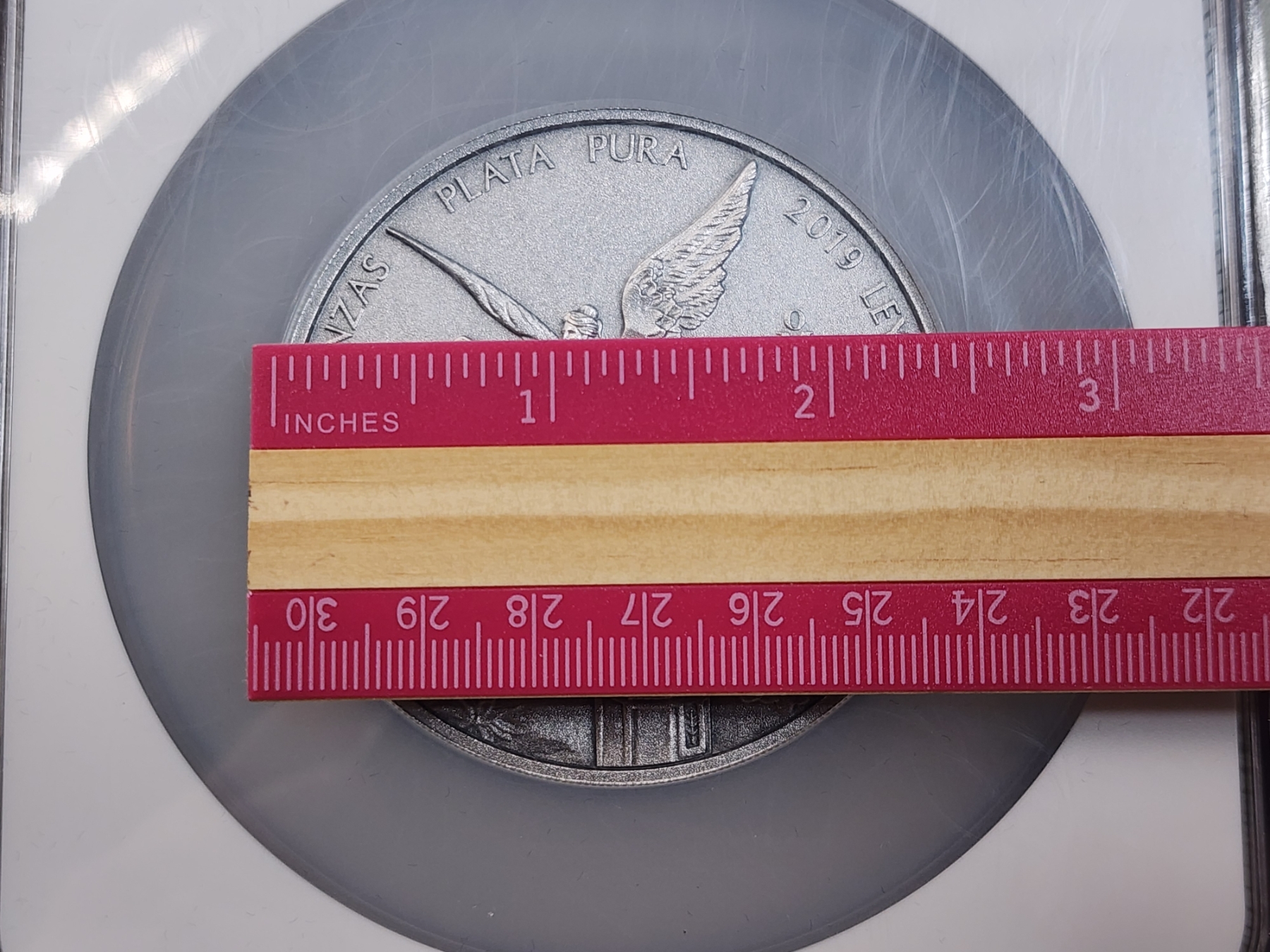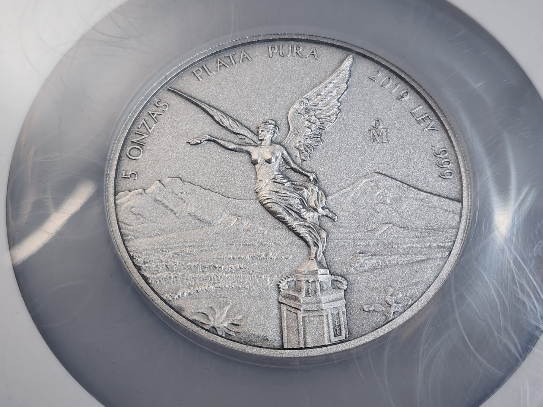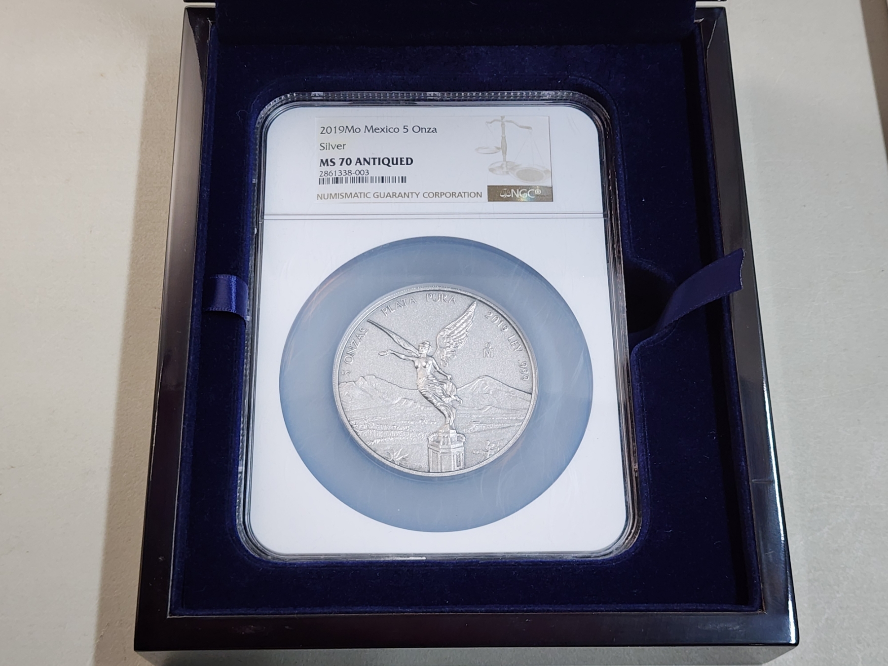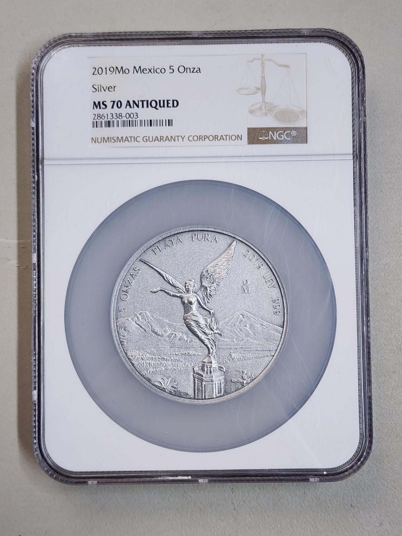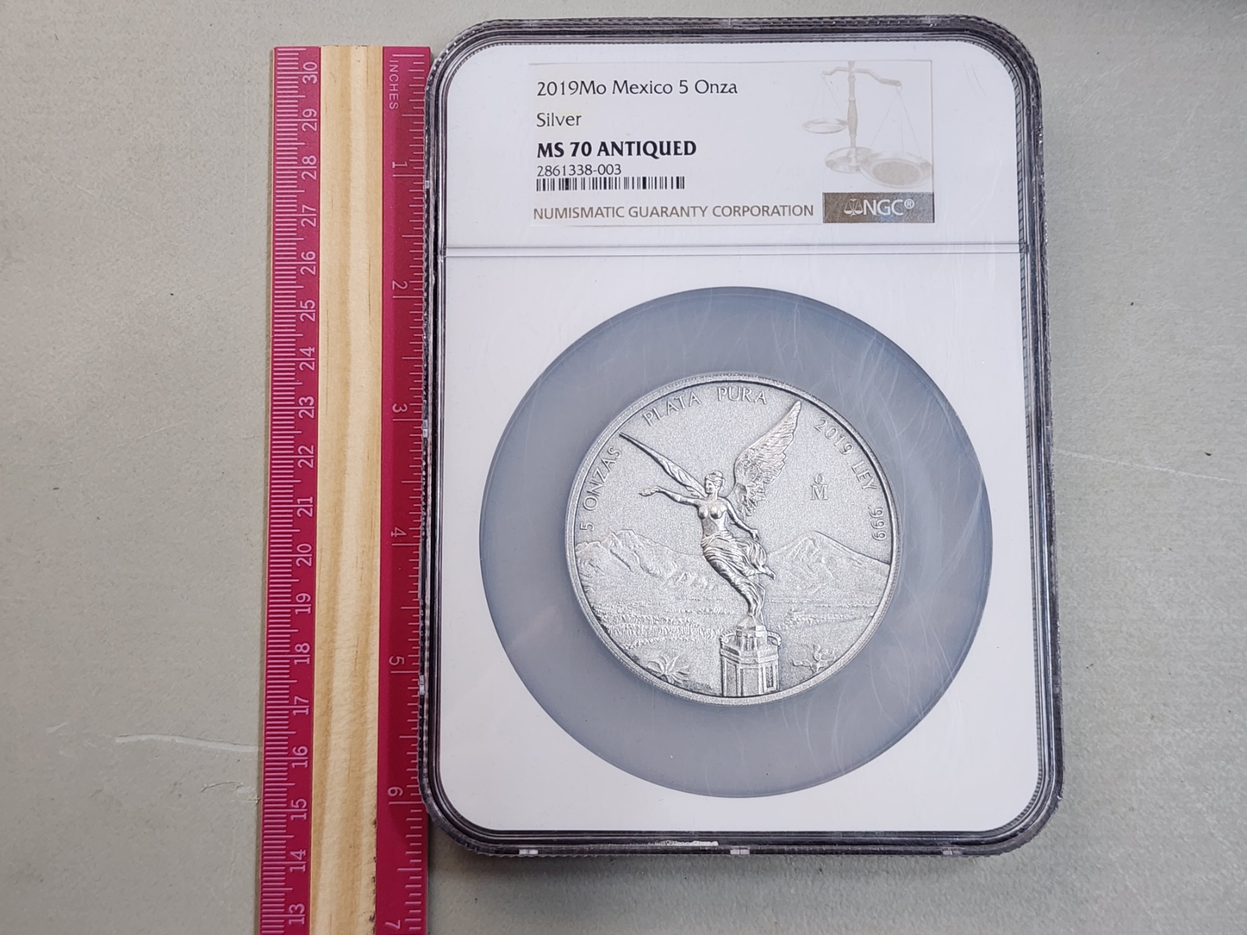 Incredible 2019 Mo Mexico 5 Onzas .999 Fine Silver Large Coin Graded by NGC MS 70 Antiqued in Nice Display Box