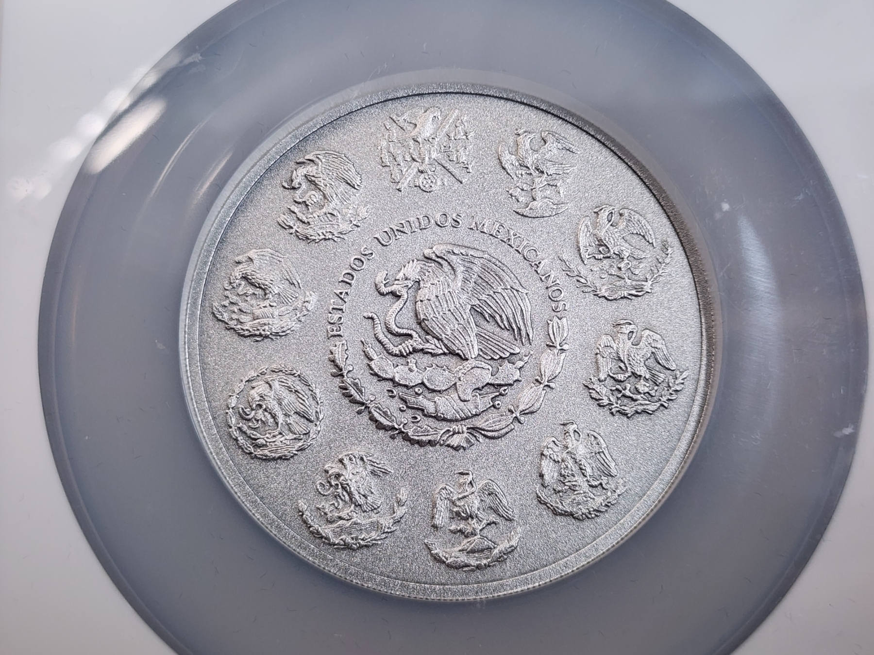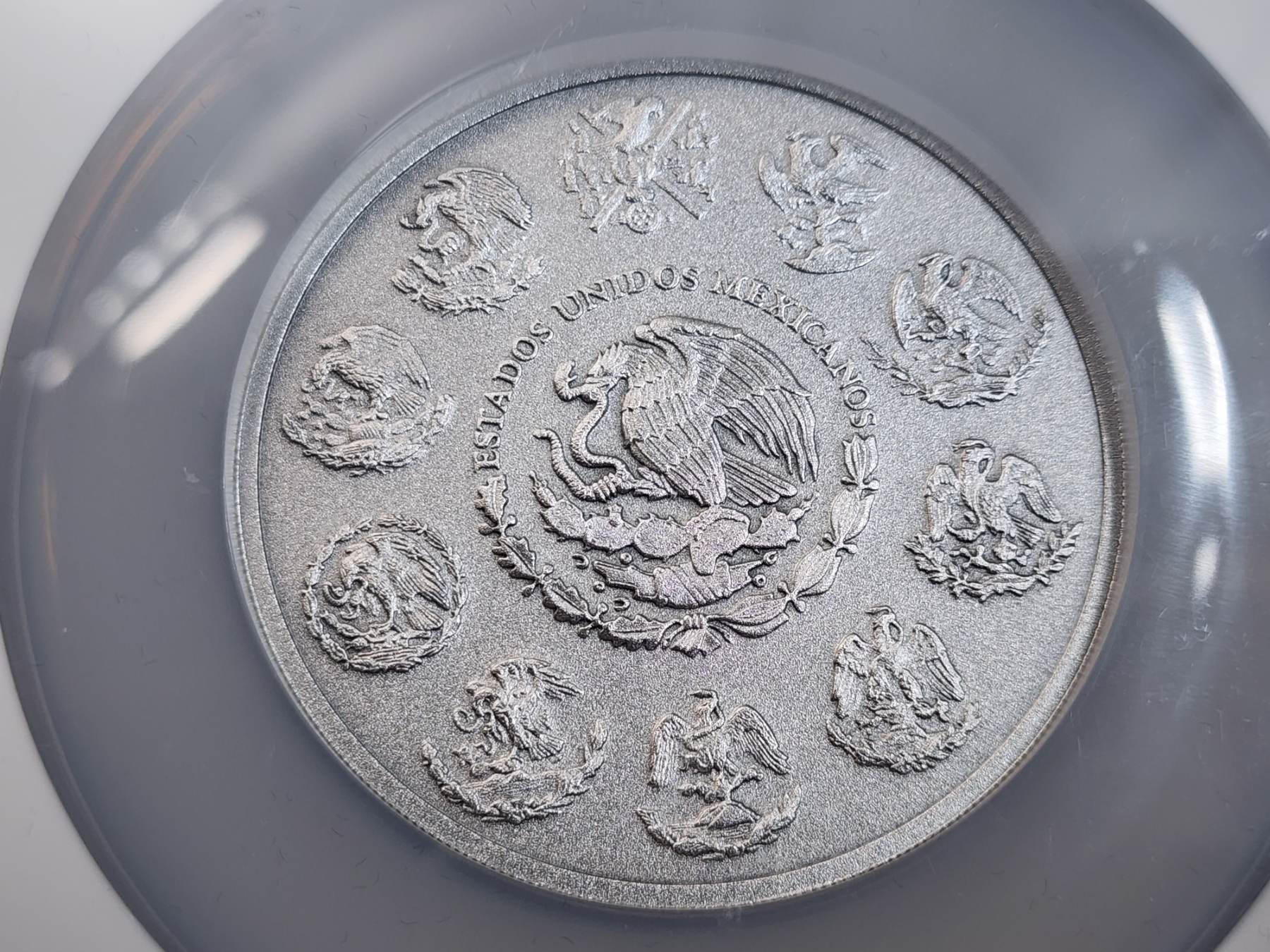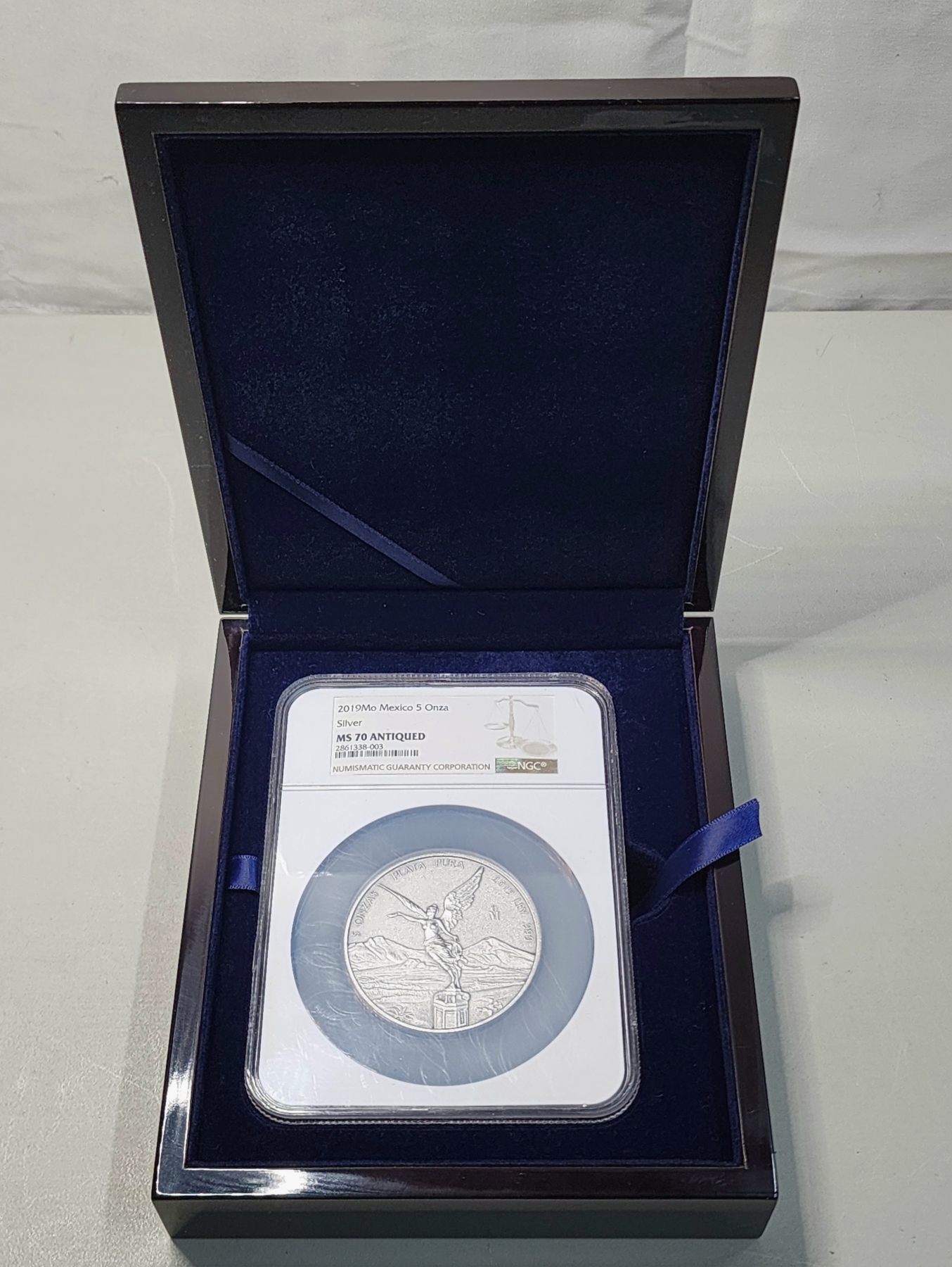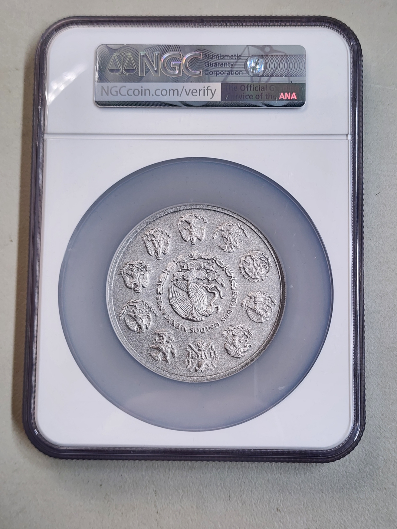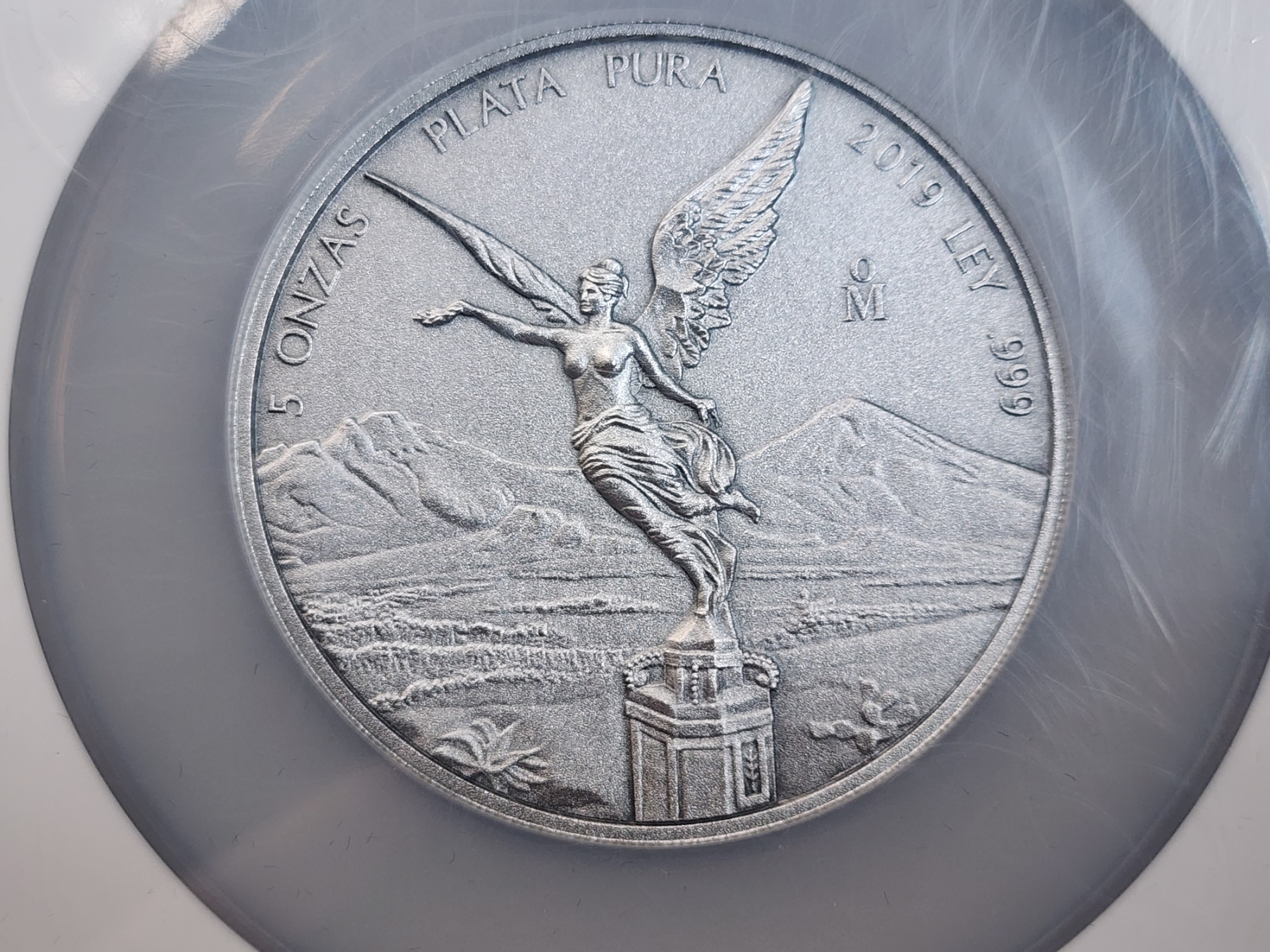Incredible 2019 Mo Mexico 5 Onzas .999 Fine Silver Large Coin Graded by NGC MS 70 Antiqued in Nice Display Box