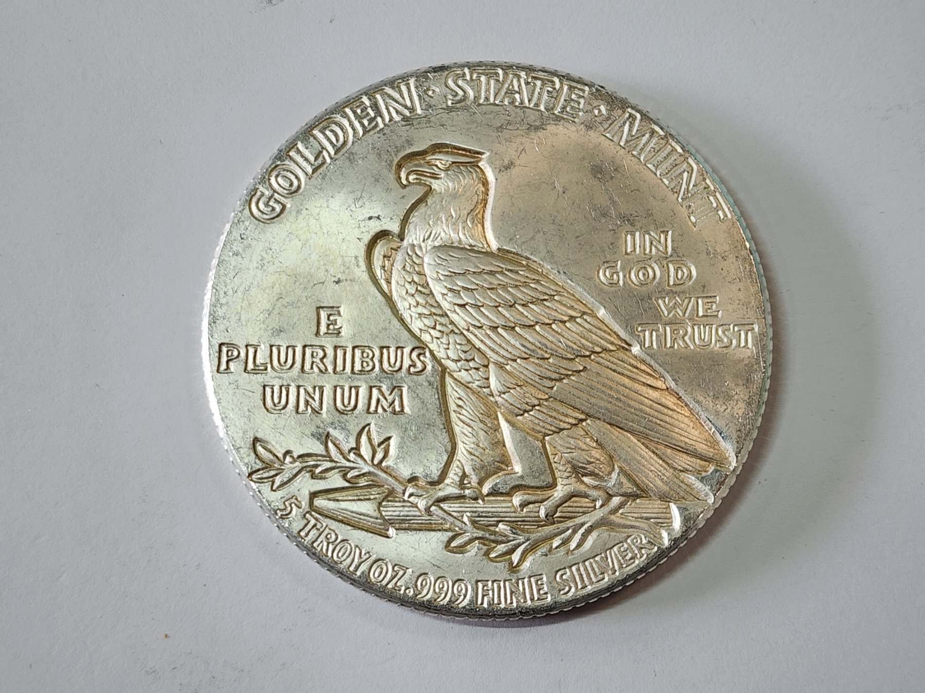 Incredible Golden State Mint Indian Design 5 Troy Ounce .999 Fine Silver Round