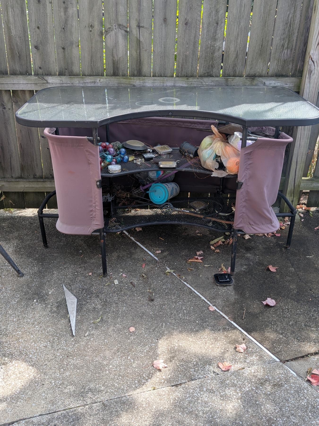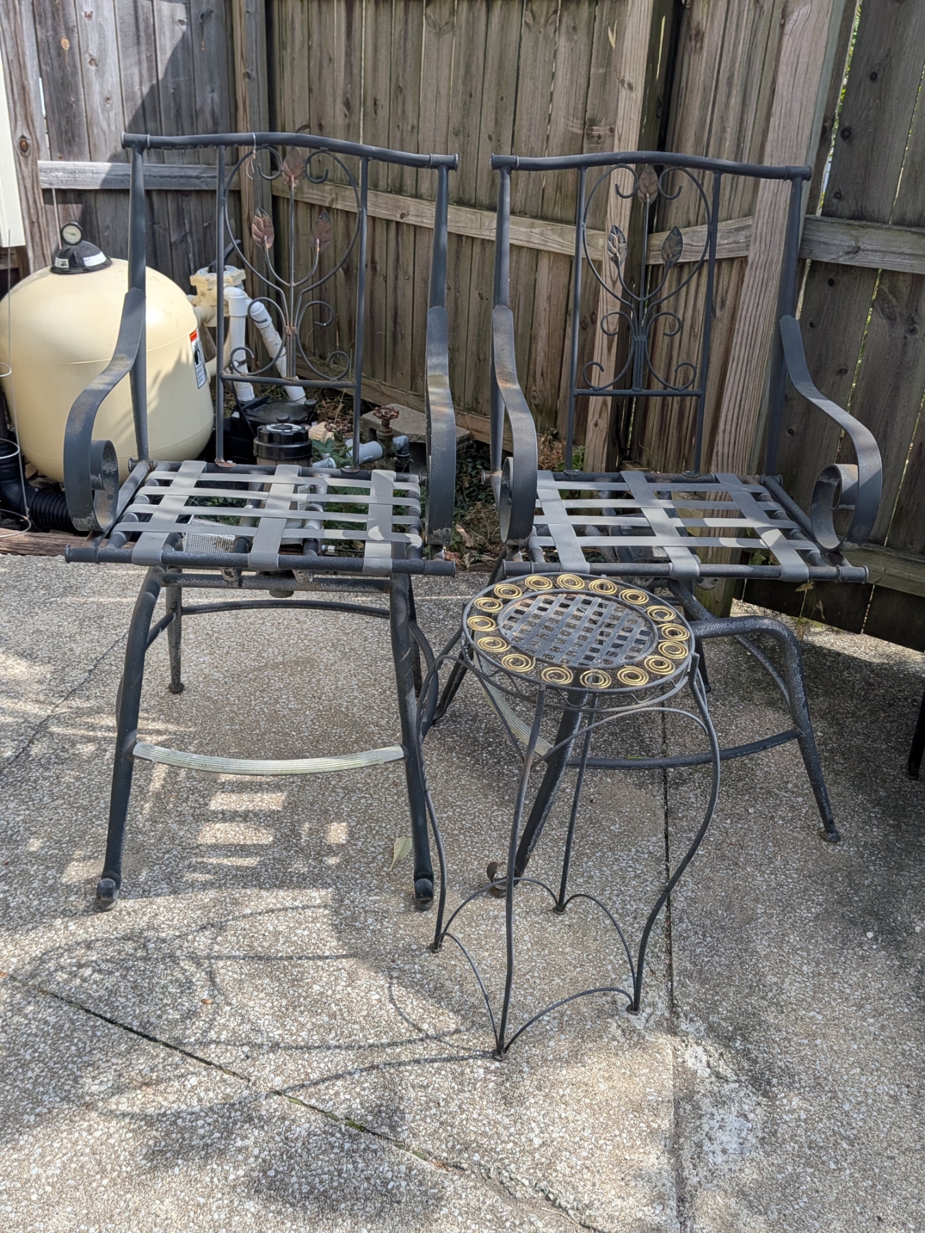 Iron Bar w/ Contents, Two Stools, & Side Table
