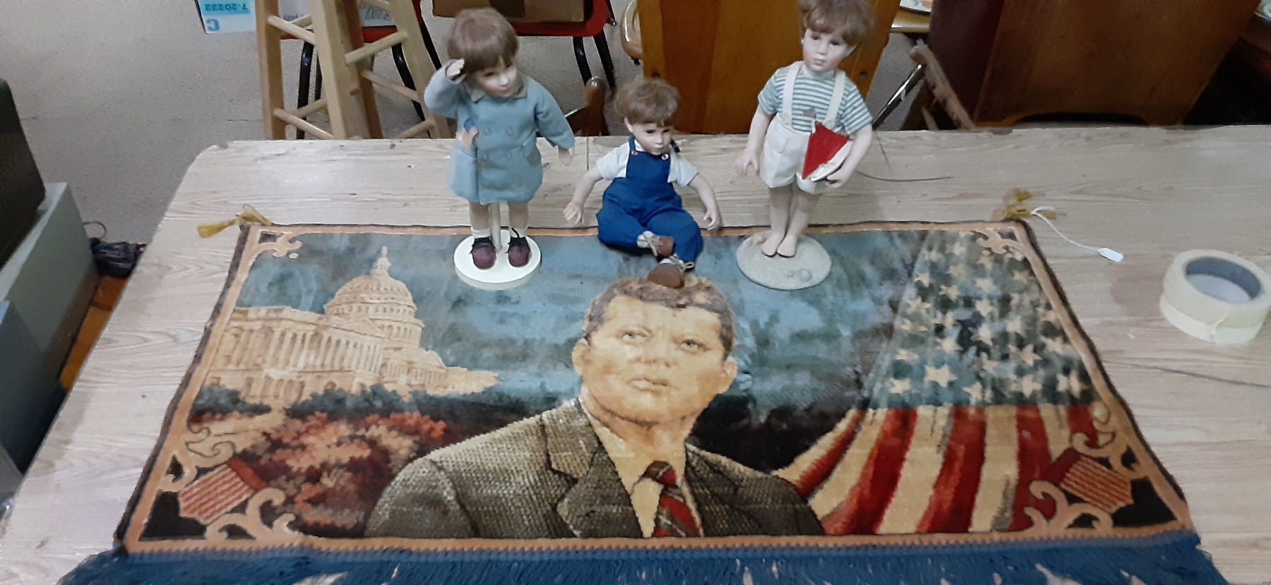 JFK - Vintage Kennedy Historical Lot As Shown Including JFK Jr Dolls - RARE Velvet Hanging Measures 38 x 20