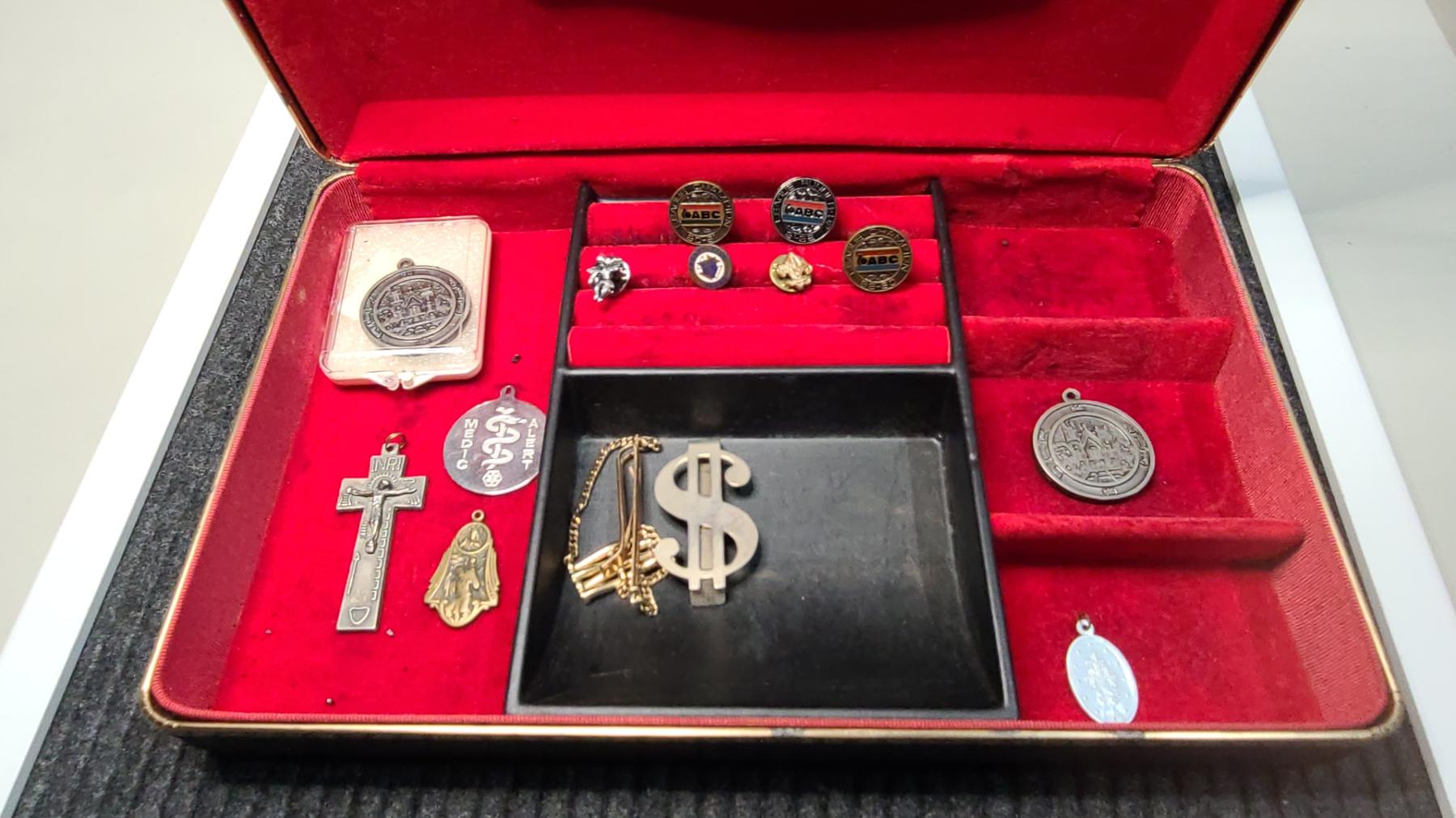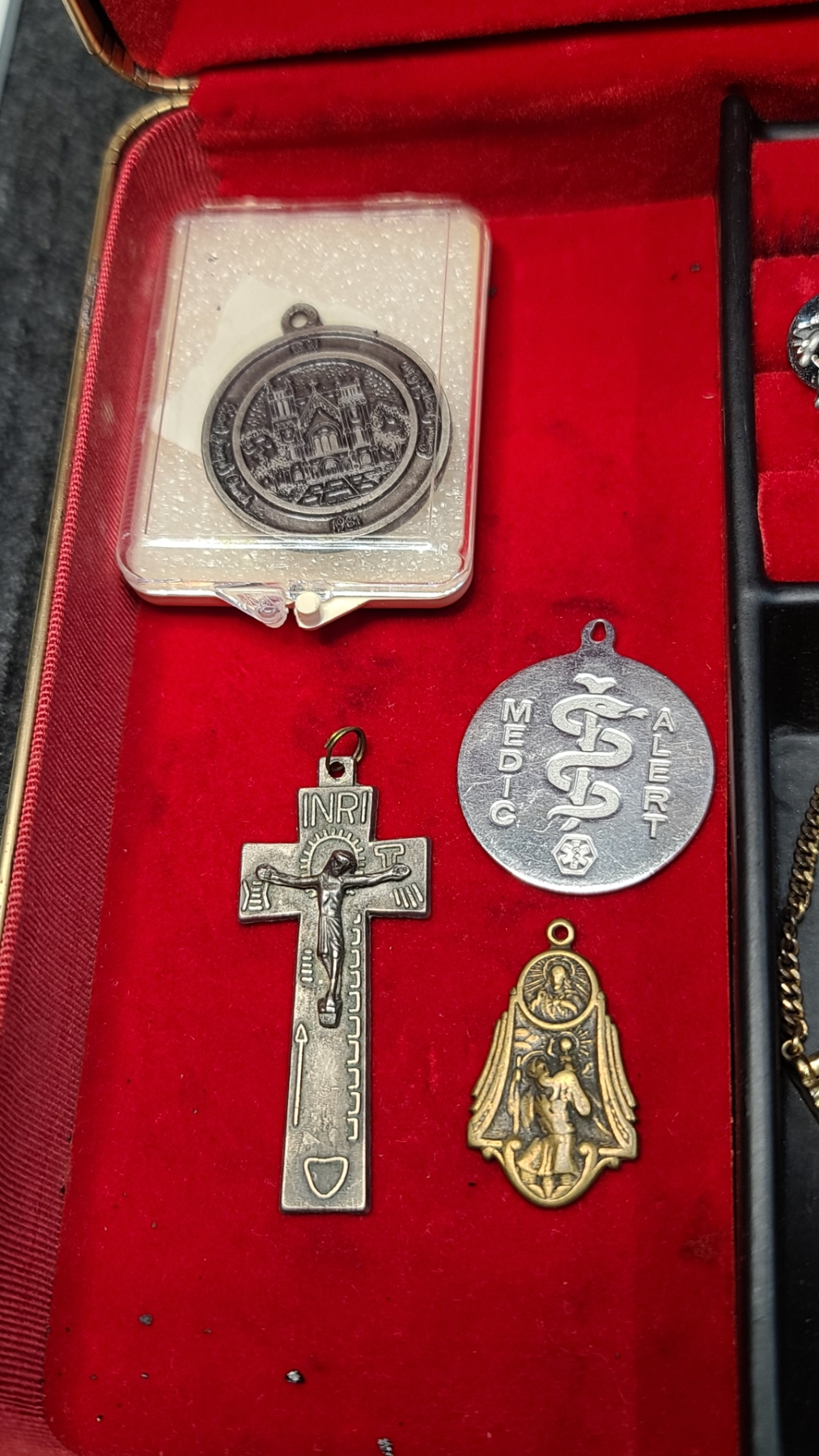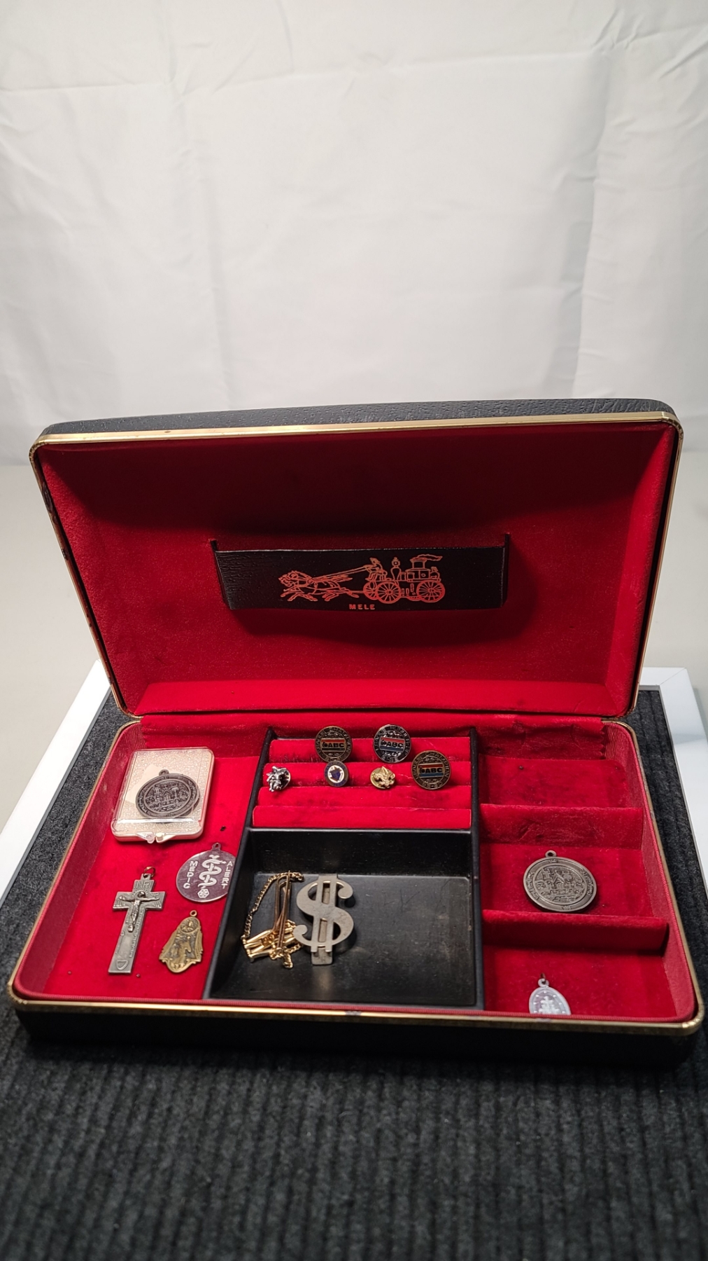 Jewelry Box With Assorted Necklace Pendants, Pins, Money Clips & Saint Joseph Medals