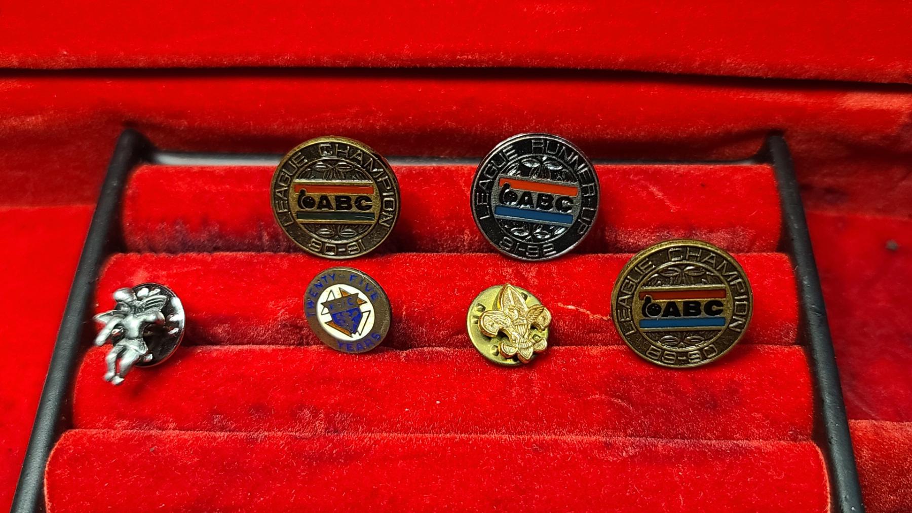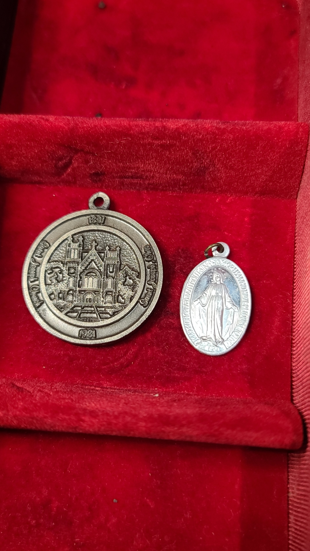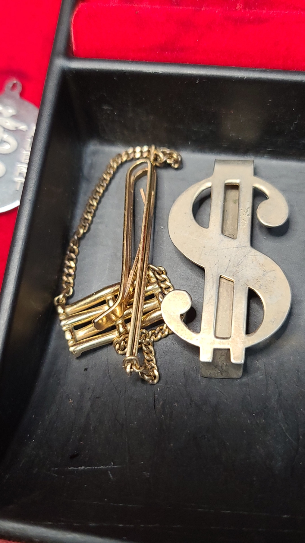 Jewelry Box With Assorted Necklace Pendants, Pins, Money Clips & Saint Joseph Medals