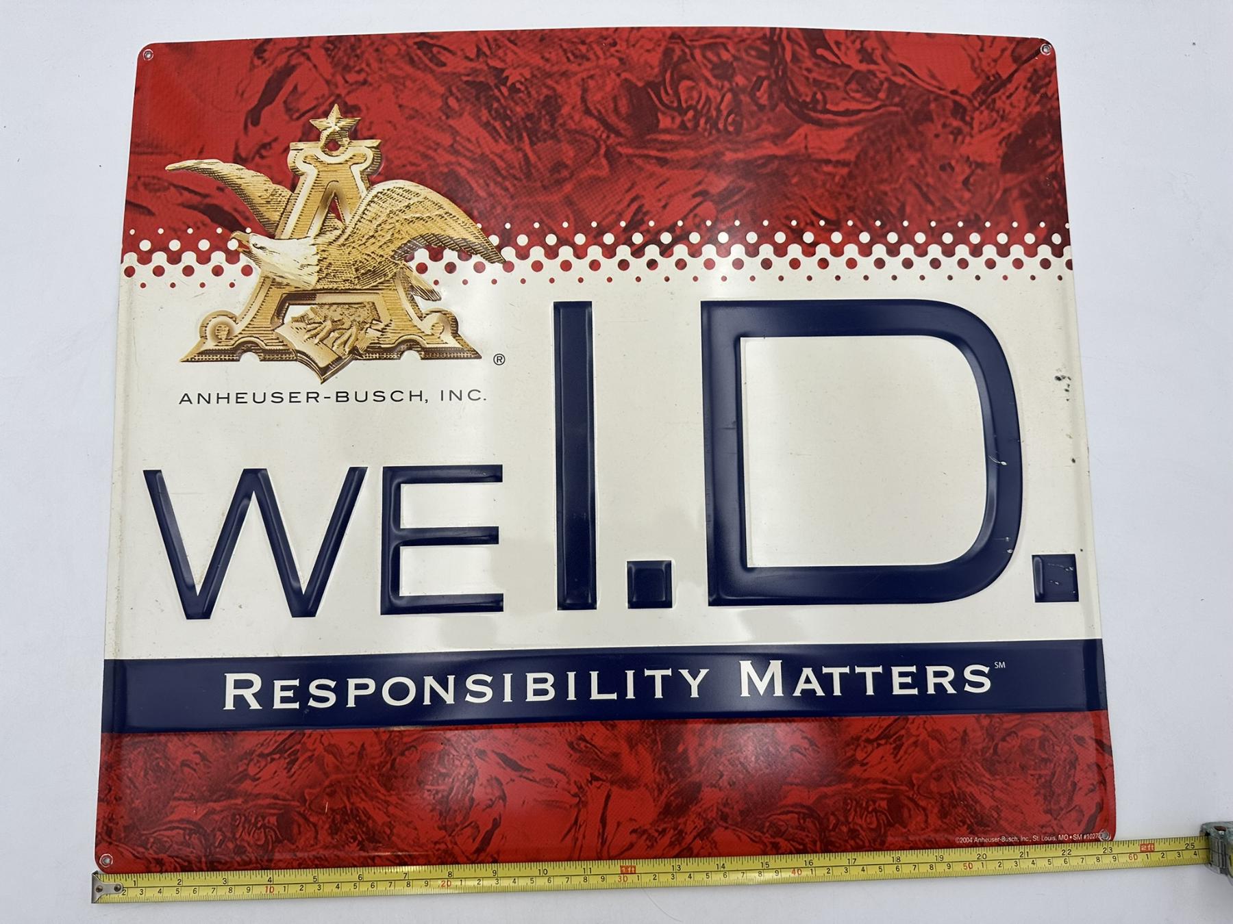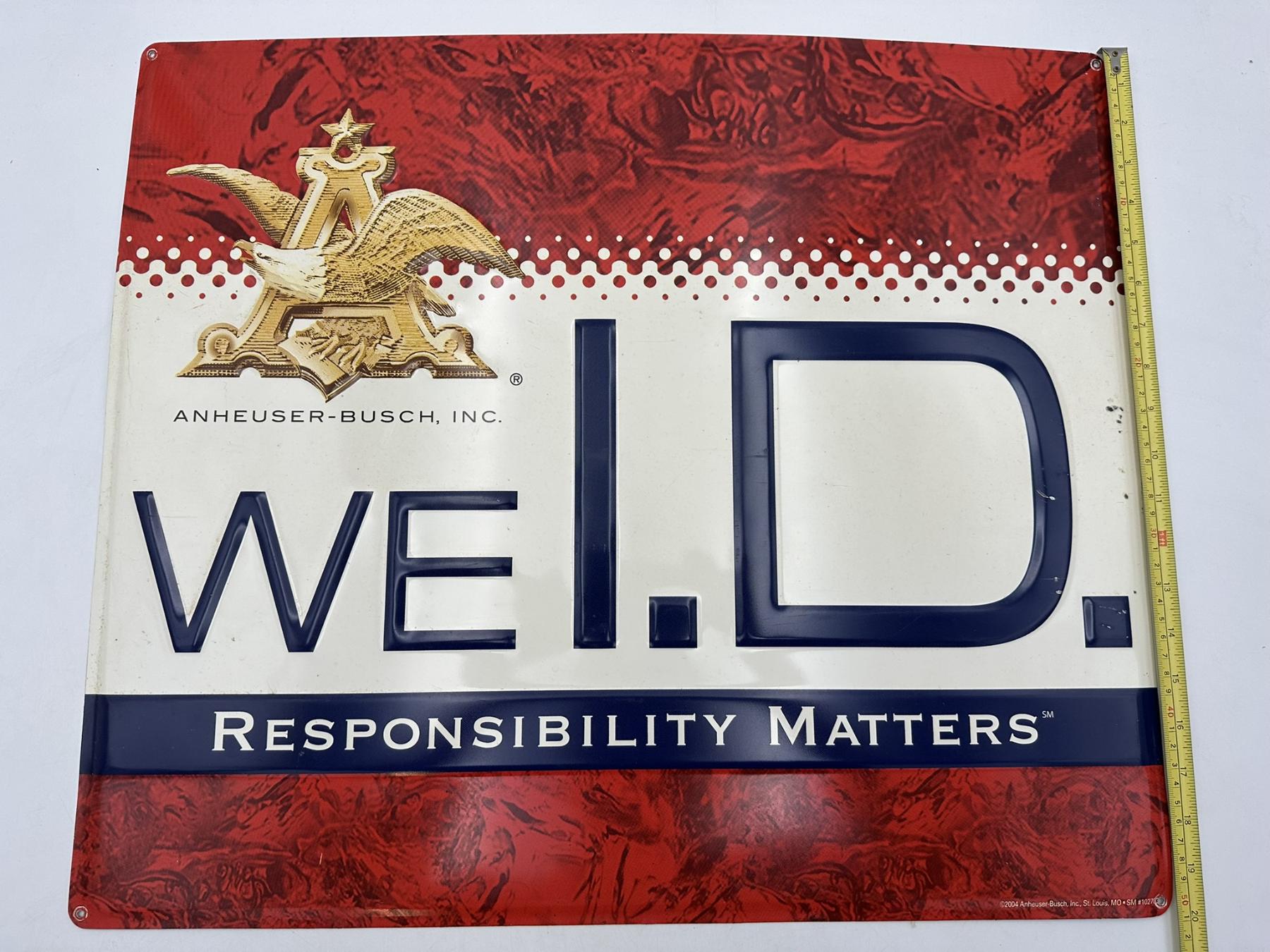 Large Anheuser Busch 'We ID' Metal Advertising Sign Approx. 23"x20"