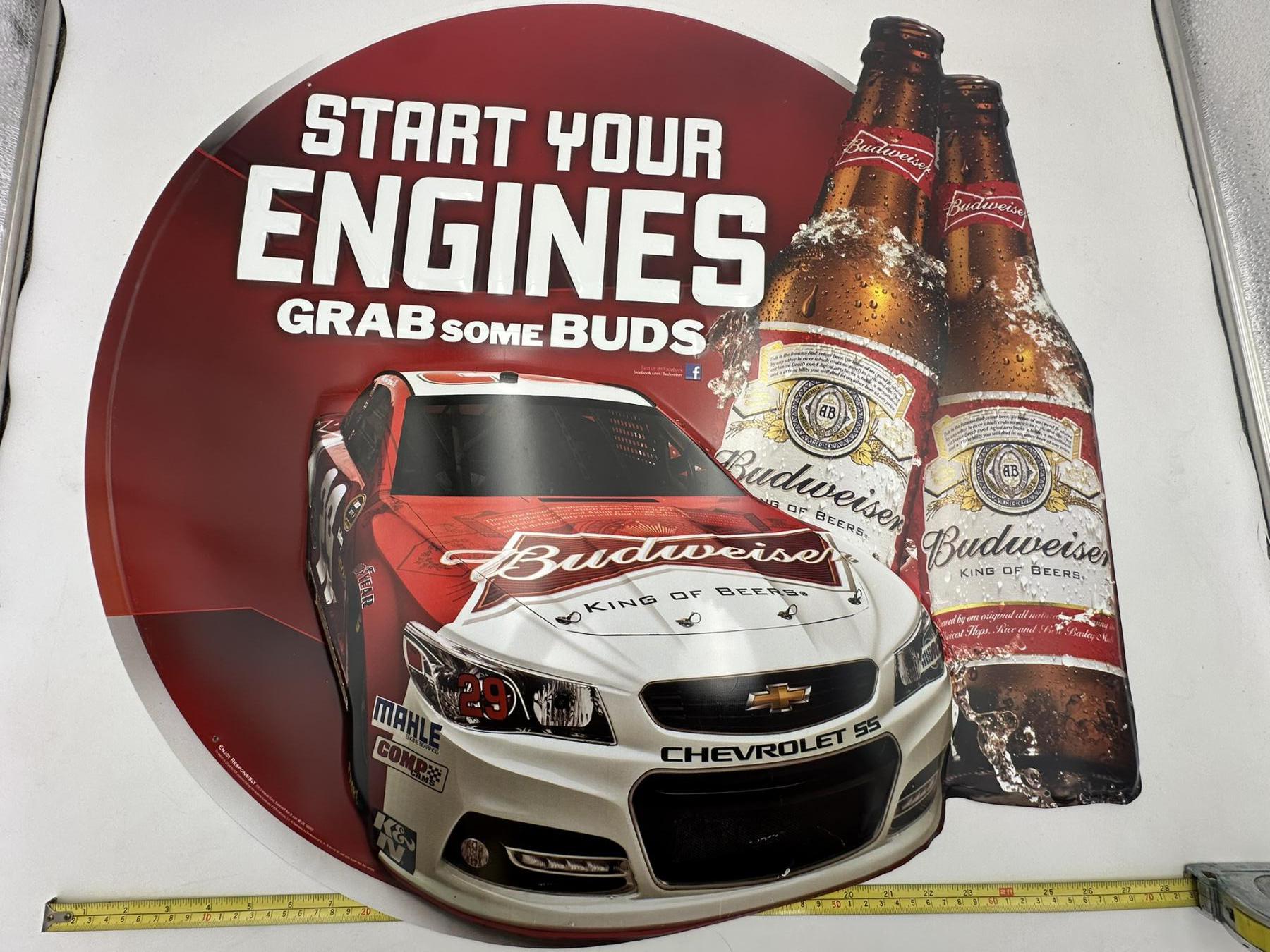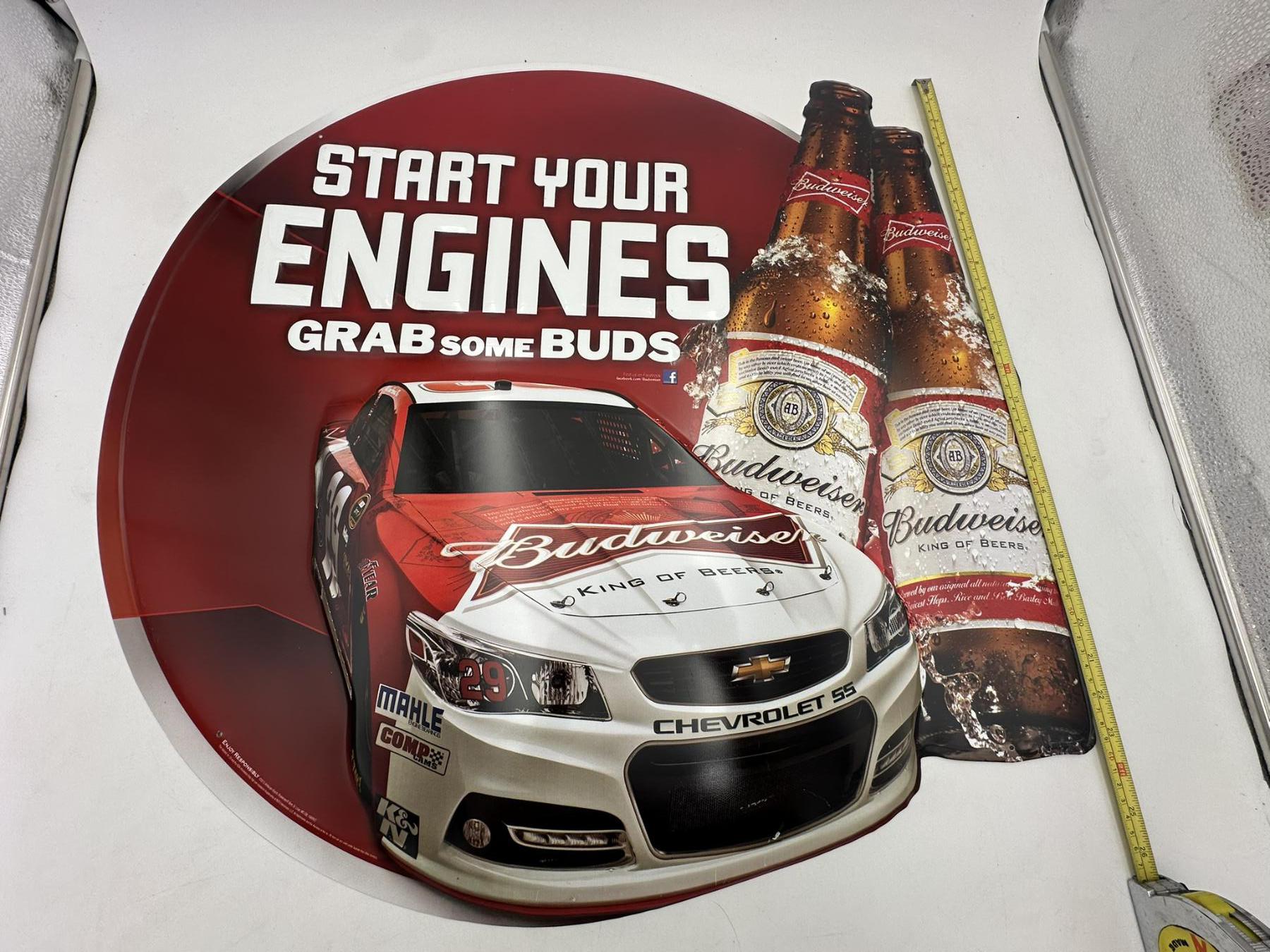 Large Budweiser 'Start Your Engines' Racecar Advertising Metal Sign Approx. 28"x 25"