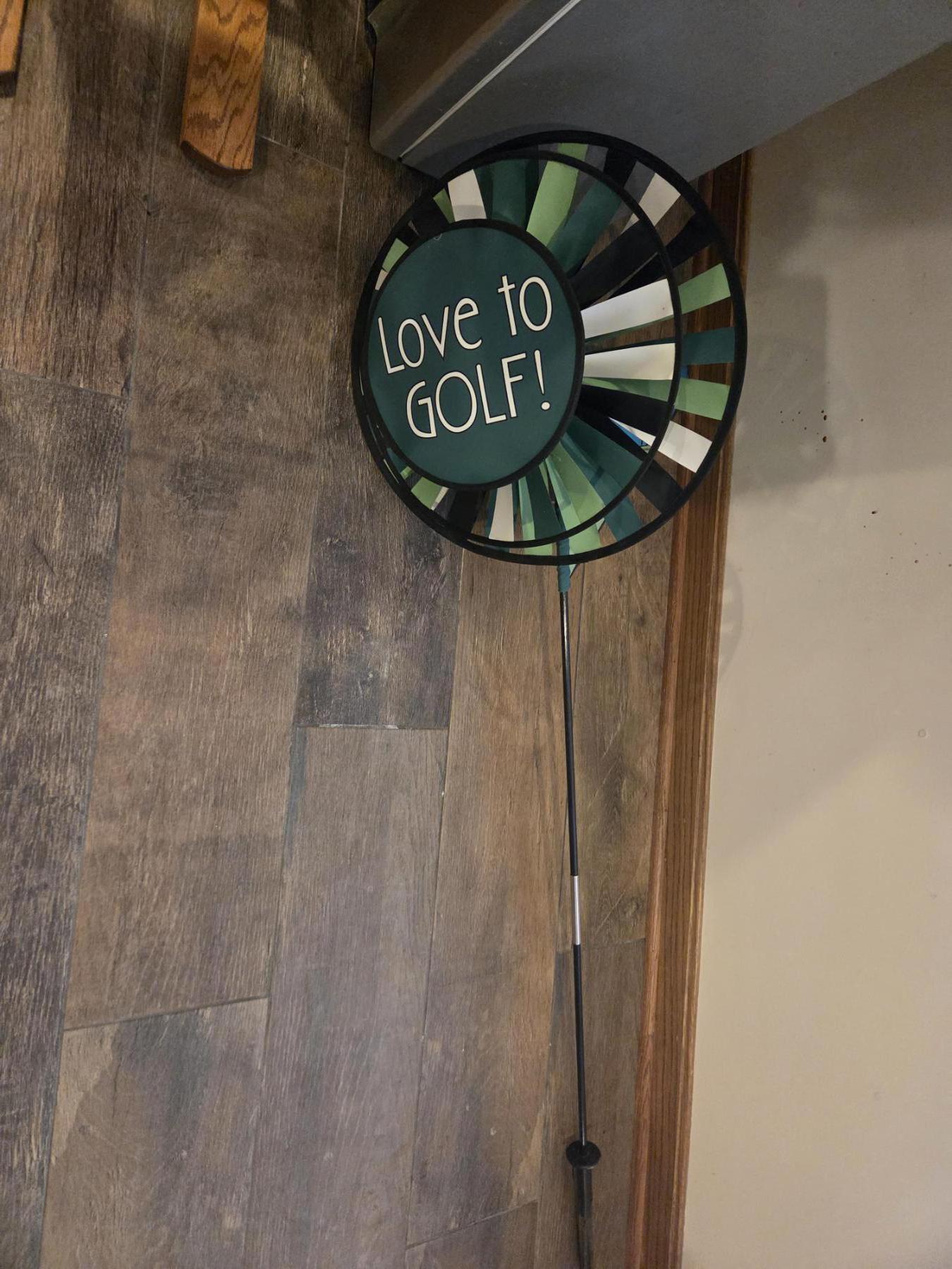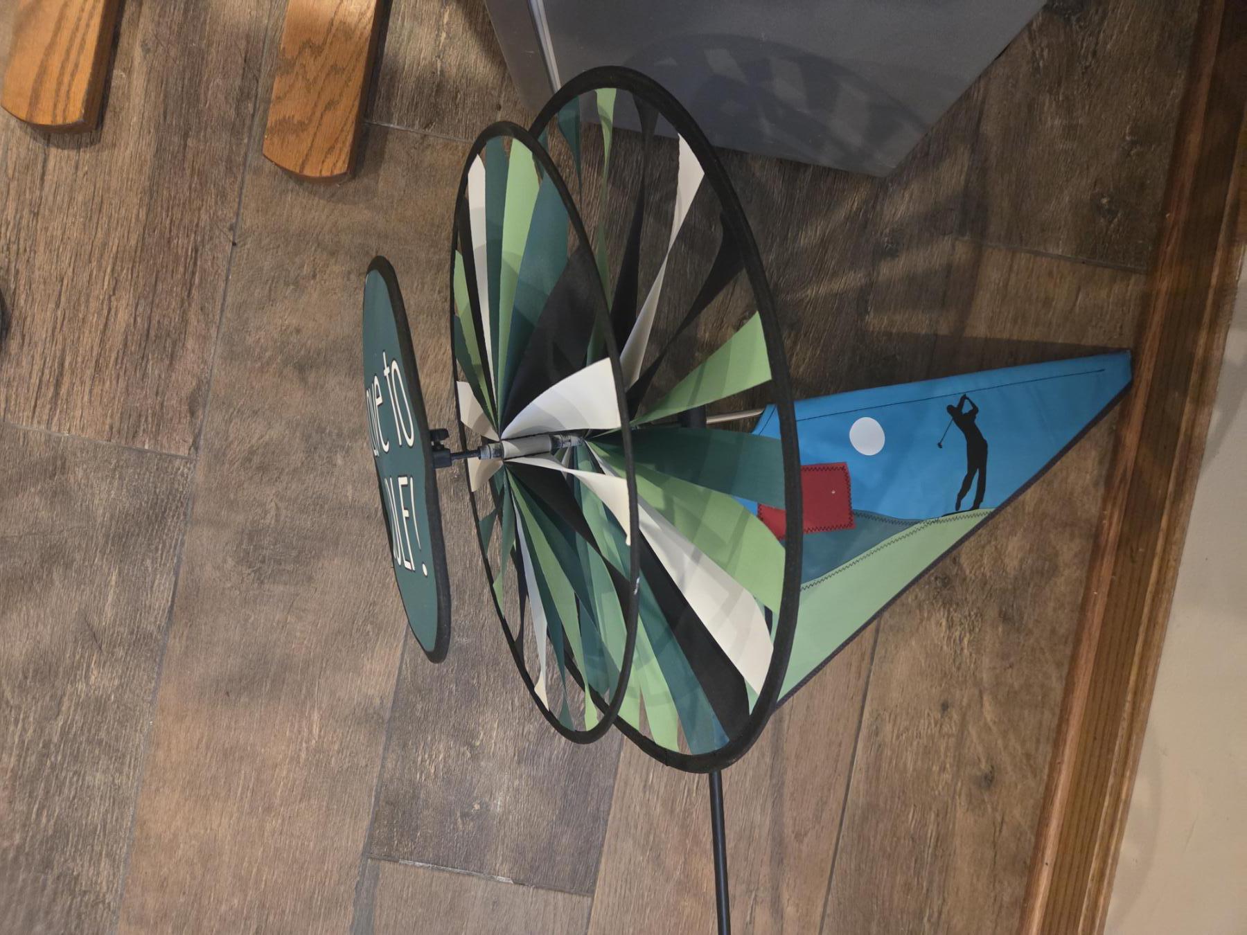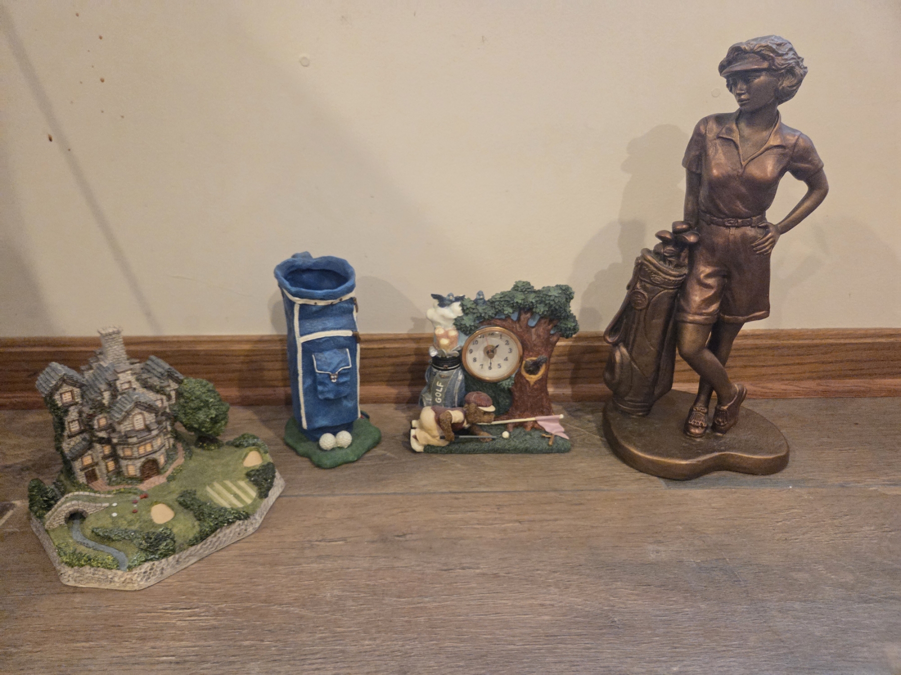 Large Golf Wind Spinner, Golf Bag Pen Holder, Brass Look Statue Of Golf Lady & More