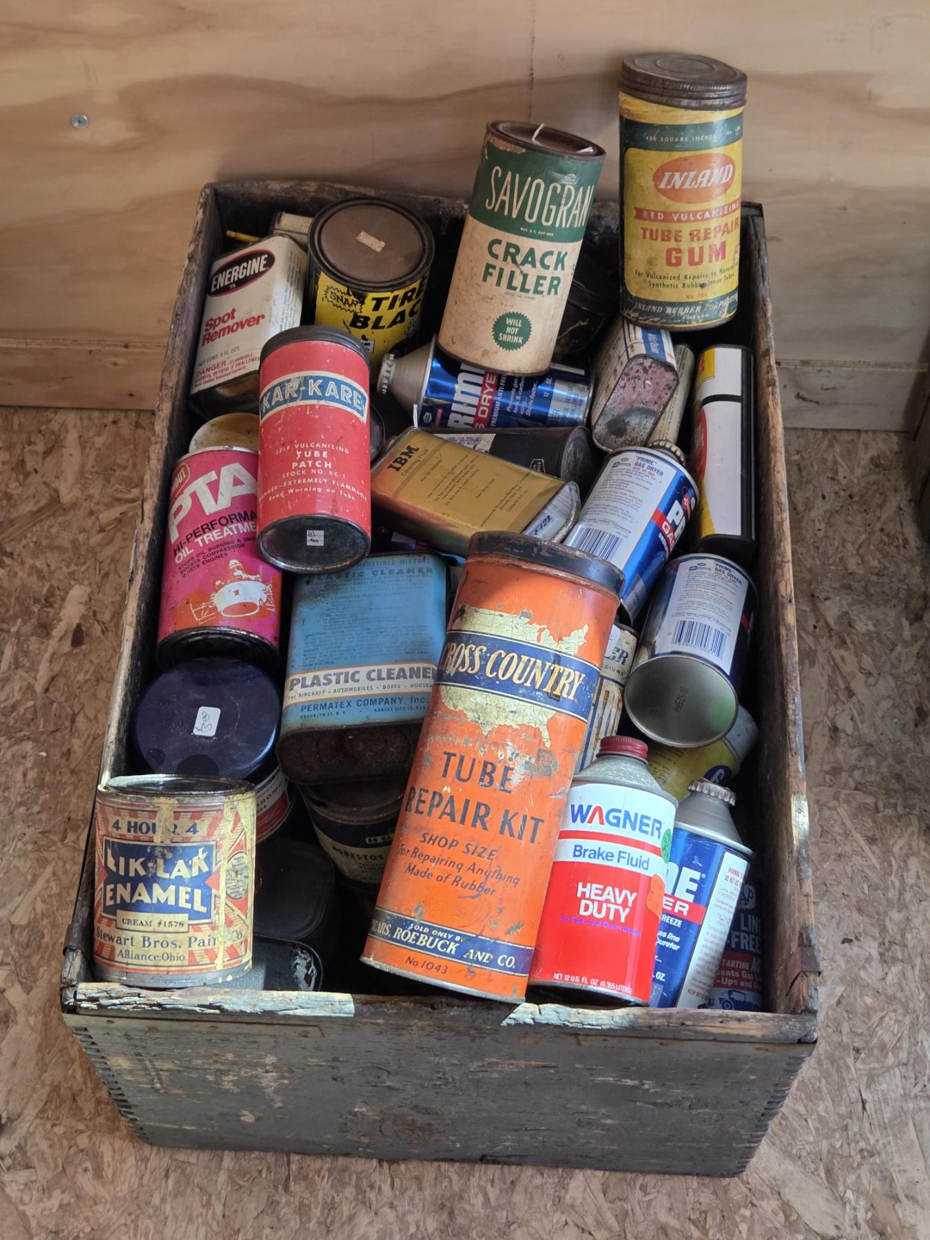 Large Vintage Wooden Crate With Excellent Collection Of Assorted Vintage Automotive Related Cans