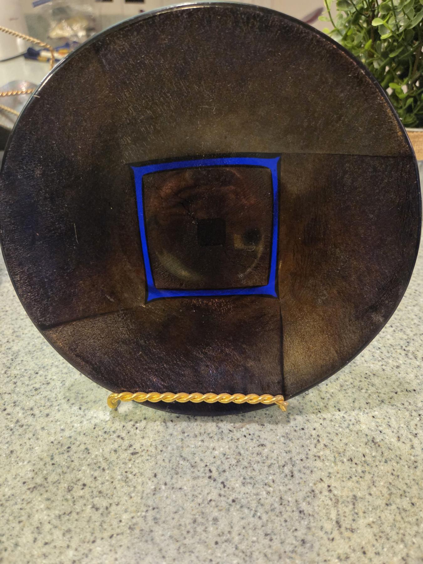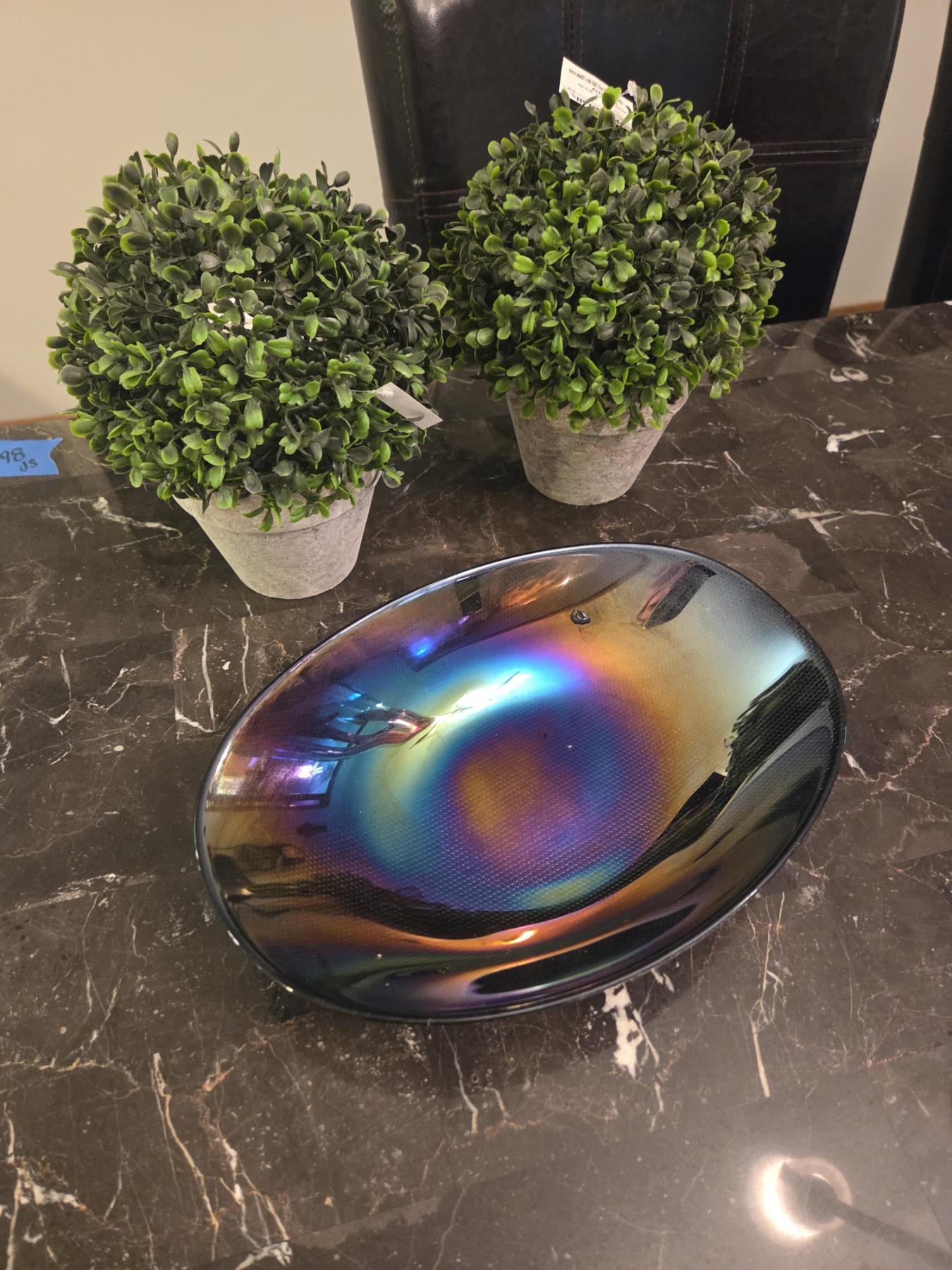 Latimer Signed Iridescent Bowl With Stand & Two Like New Faux Plants