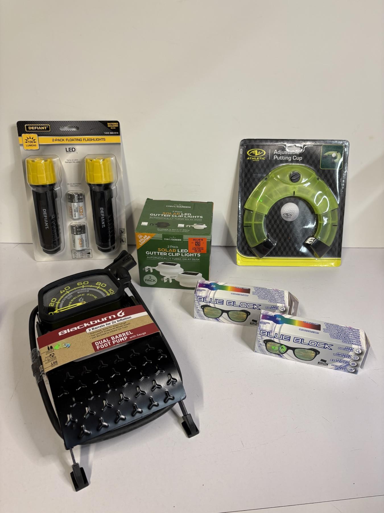 Led Flashlights battery operated - Adjustable Putting Cup - 2 Blue Light Blocker sunglasses - Solar LED Gutter Clip Lights - Dual Barrel Foot Pump