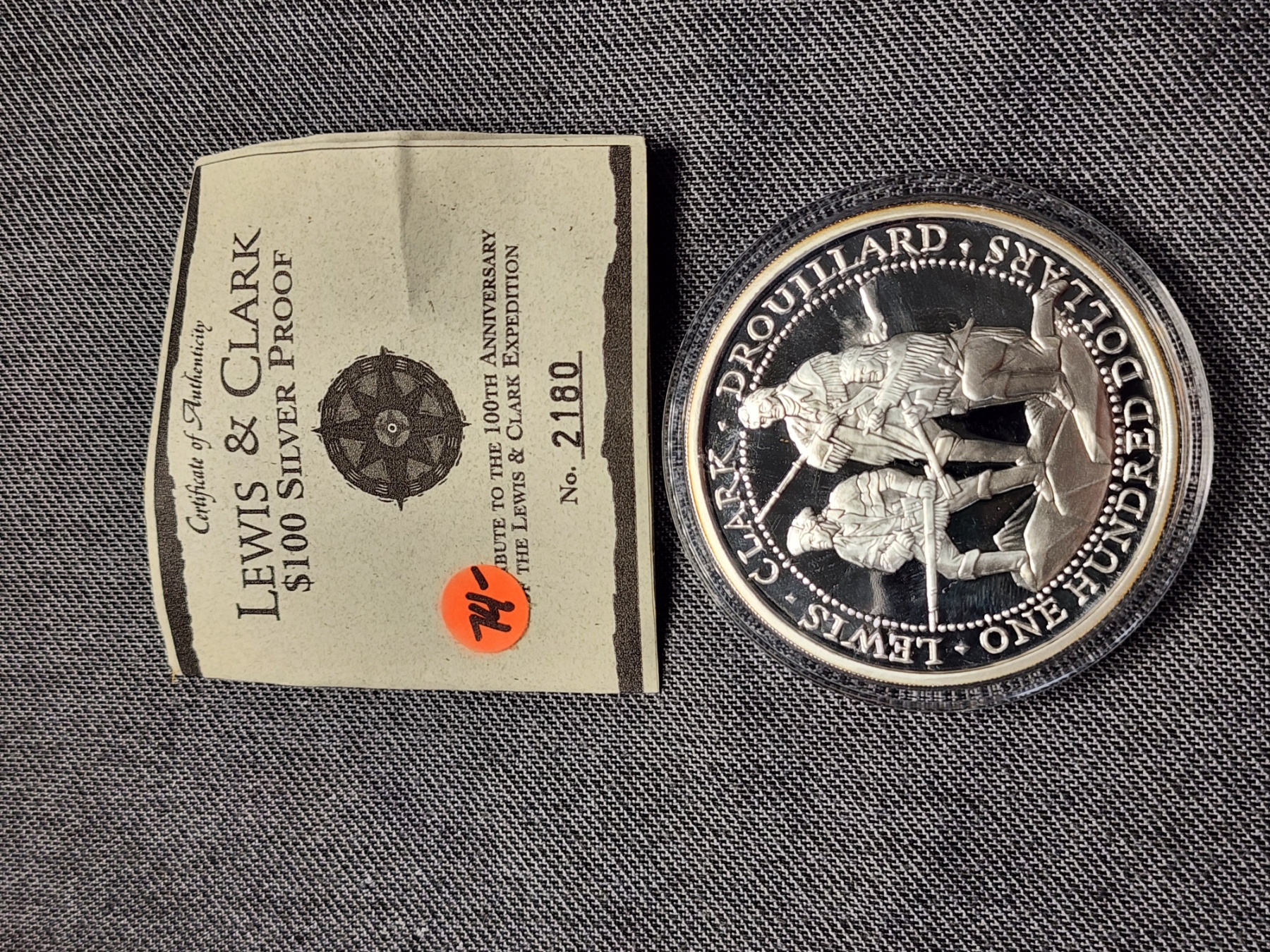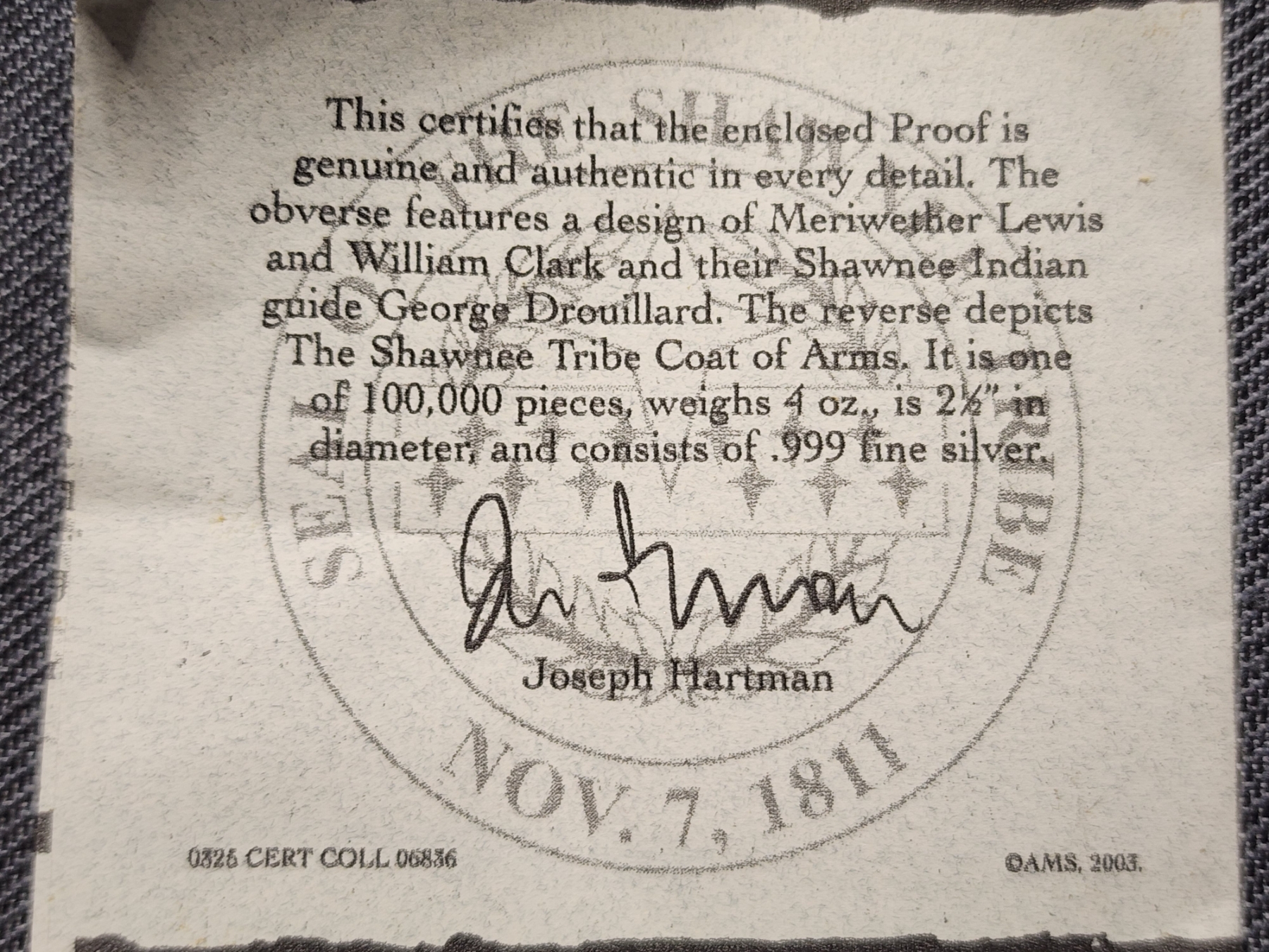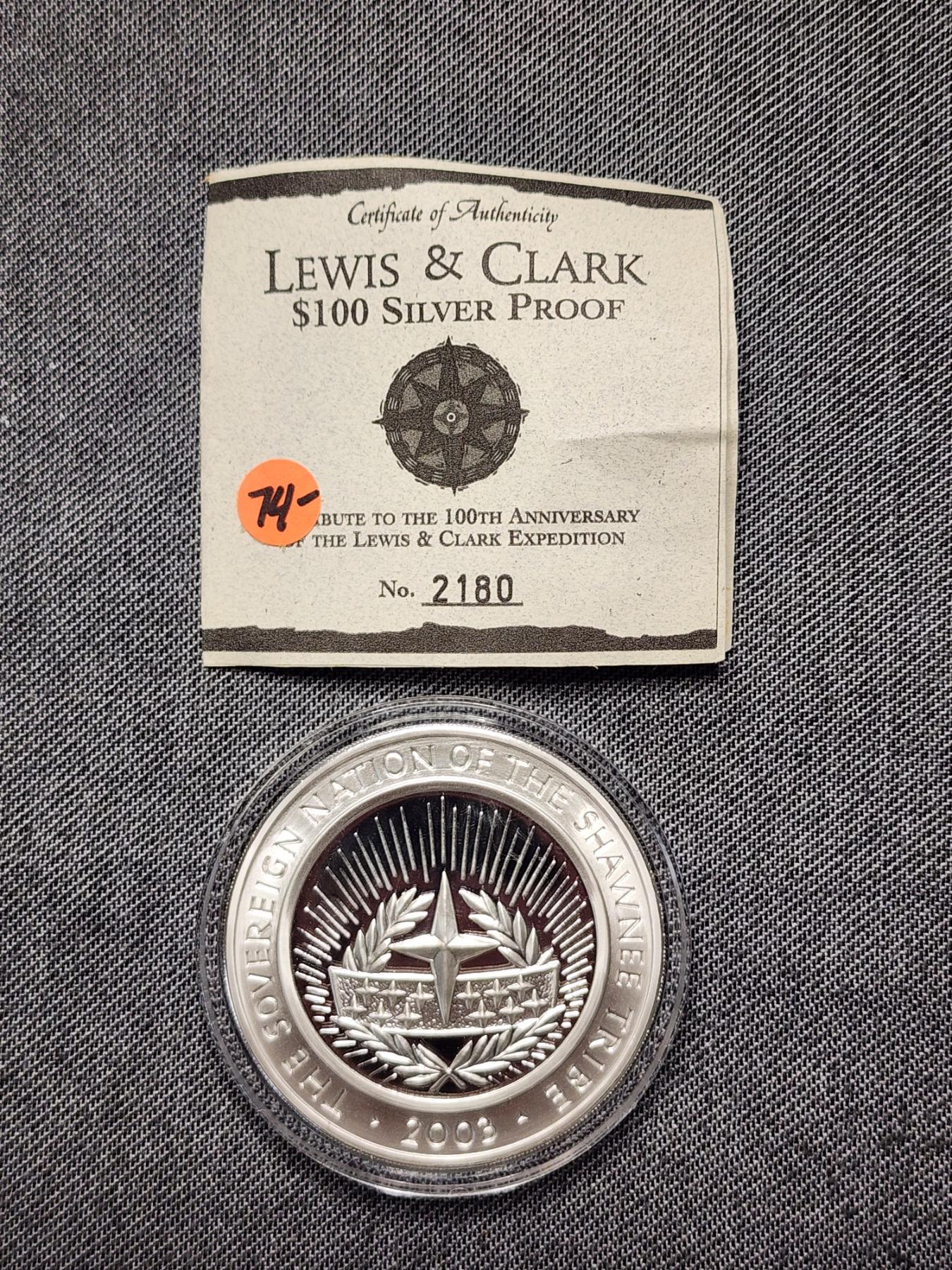 Lewis & Clark $100 Silver Proof Shawnee Tribe 4 Oz Silver Round With COA