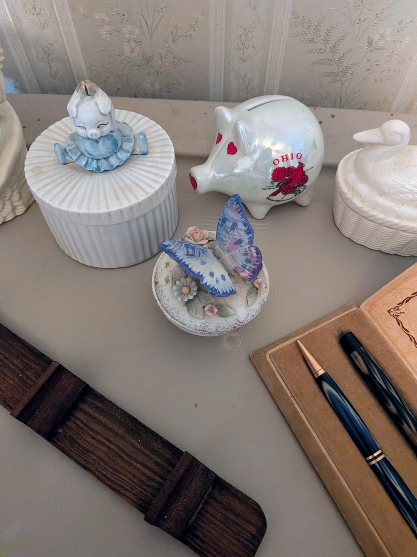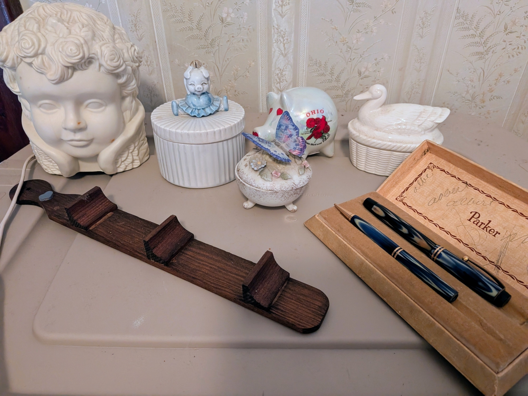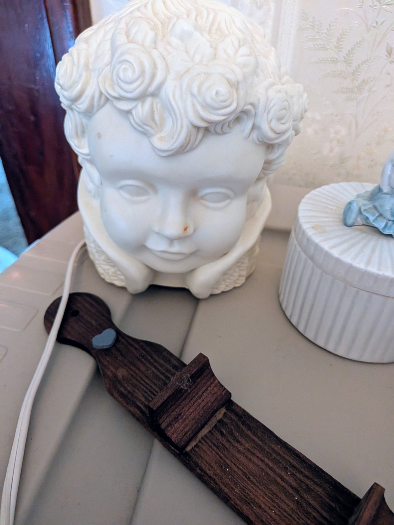 Lighted Ceramic Cherub, 3 Trinket Dishes, Small Wood Shelf, And A Cute Bank