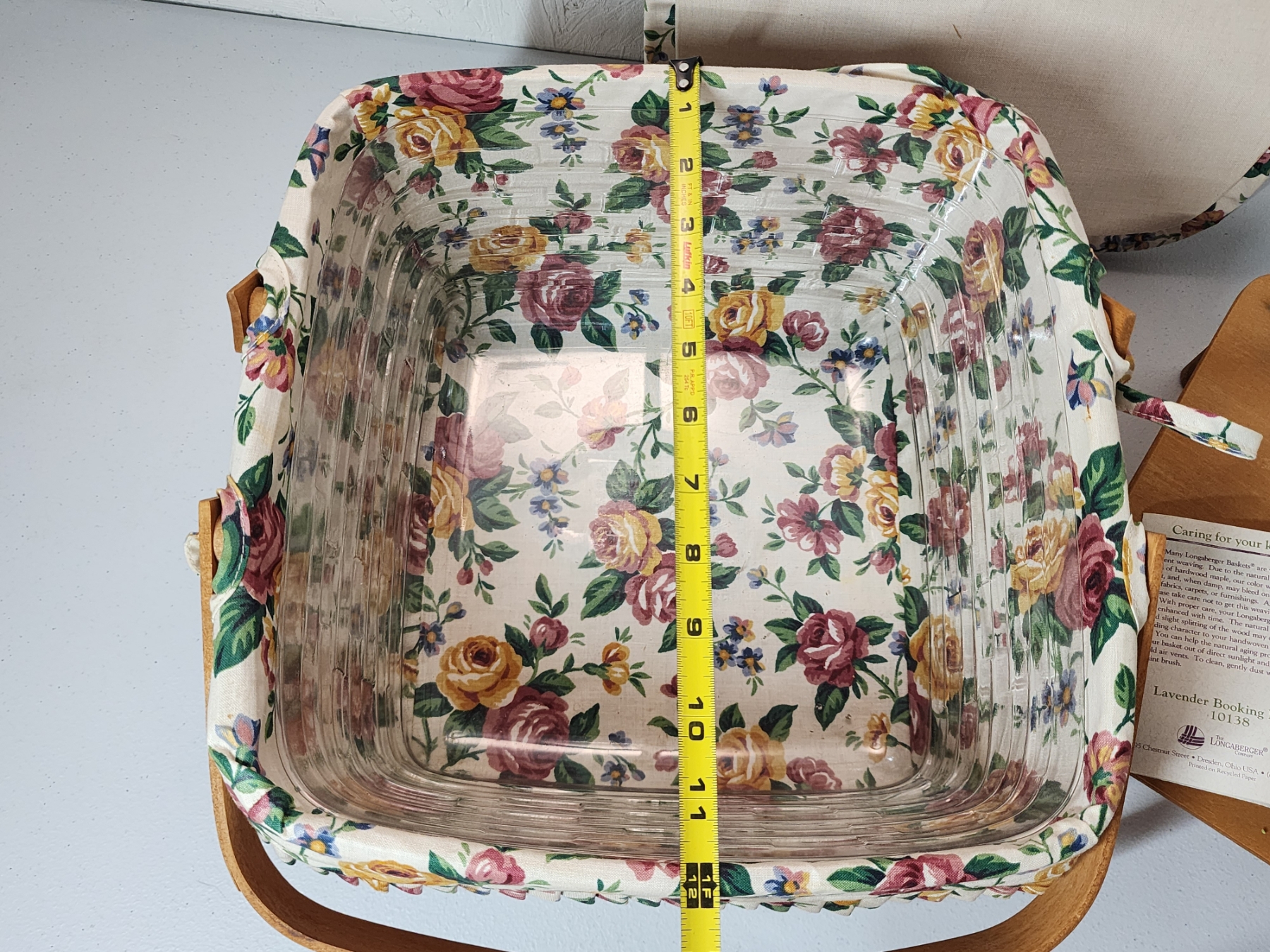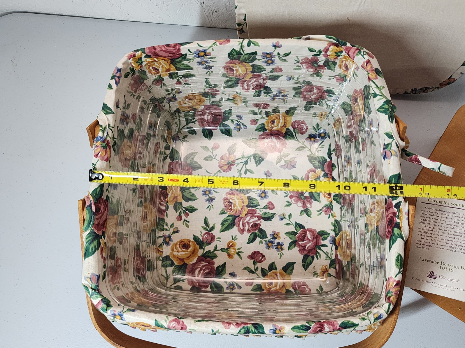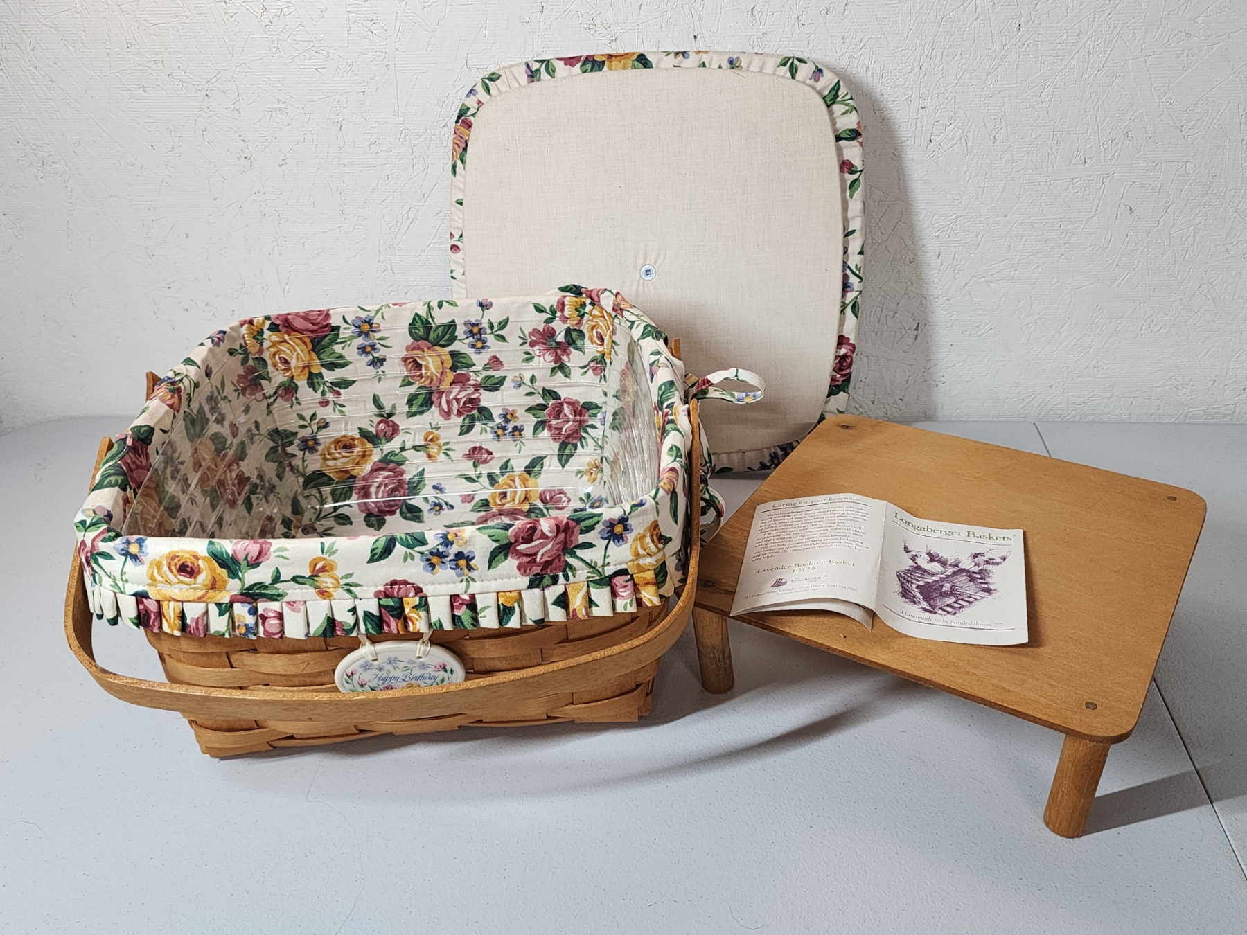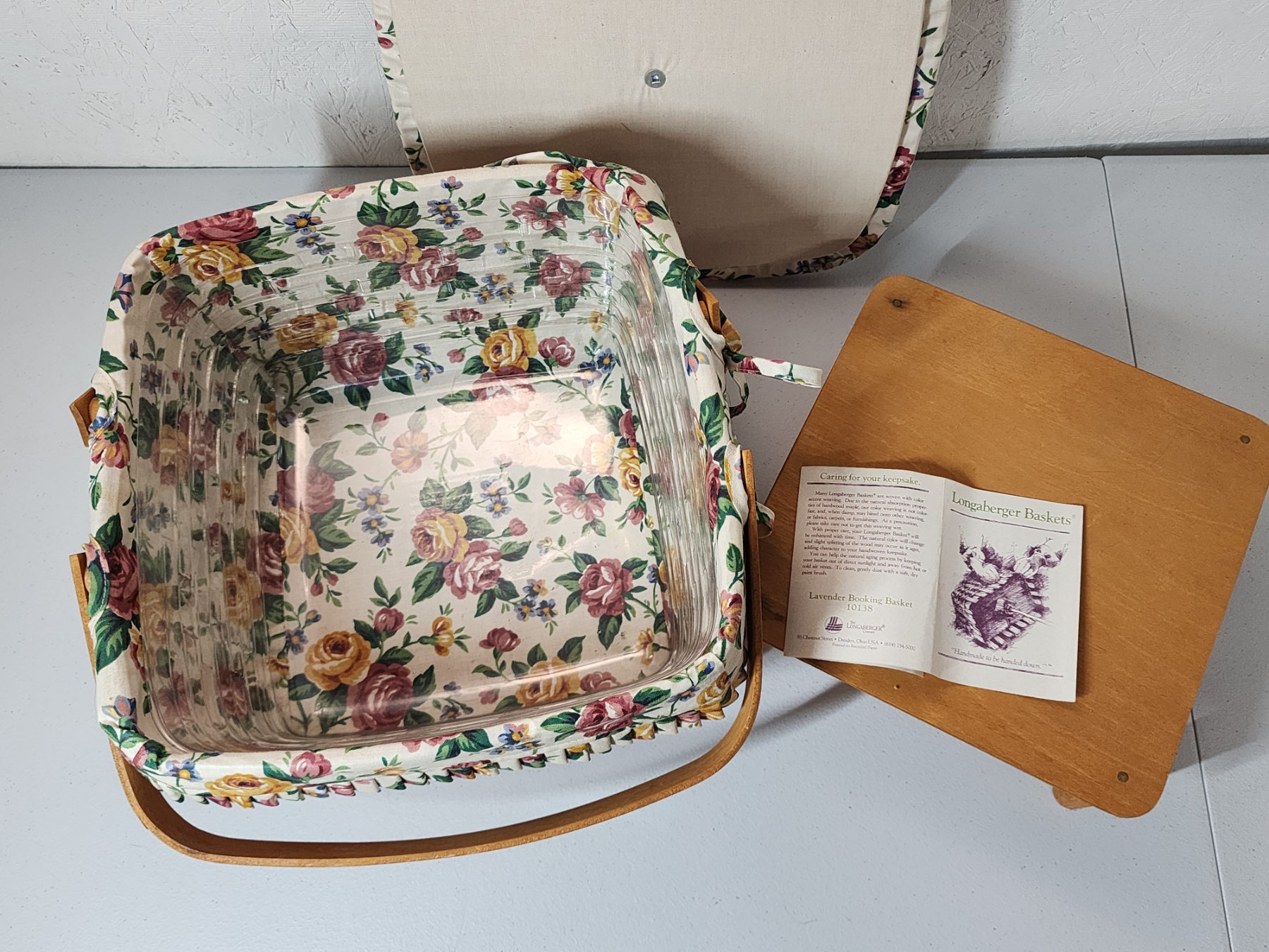 Longaberger Square Cake Basket with Floral Liner, Lid, Stand, Plastic Liner - Excellent Condition!