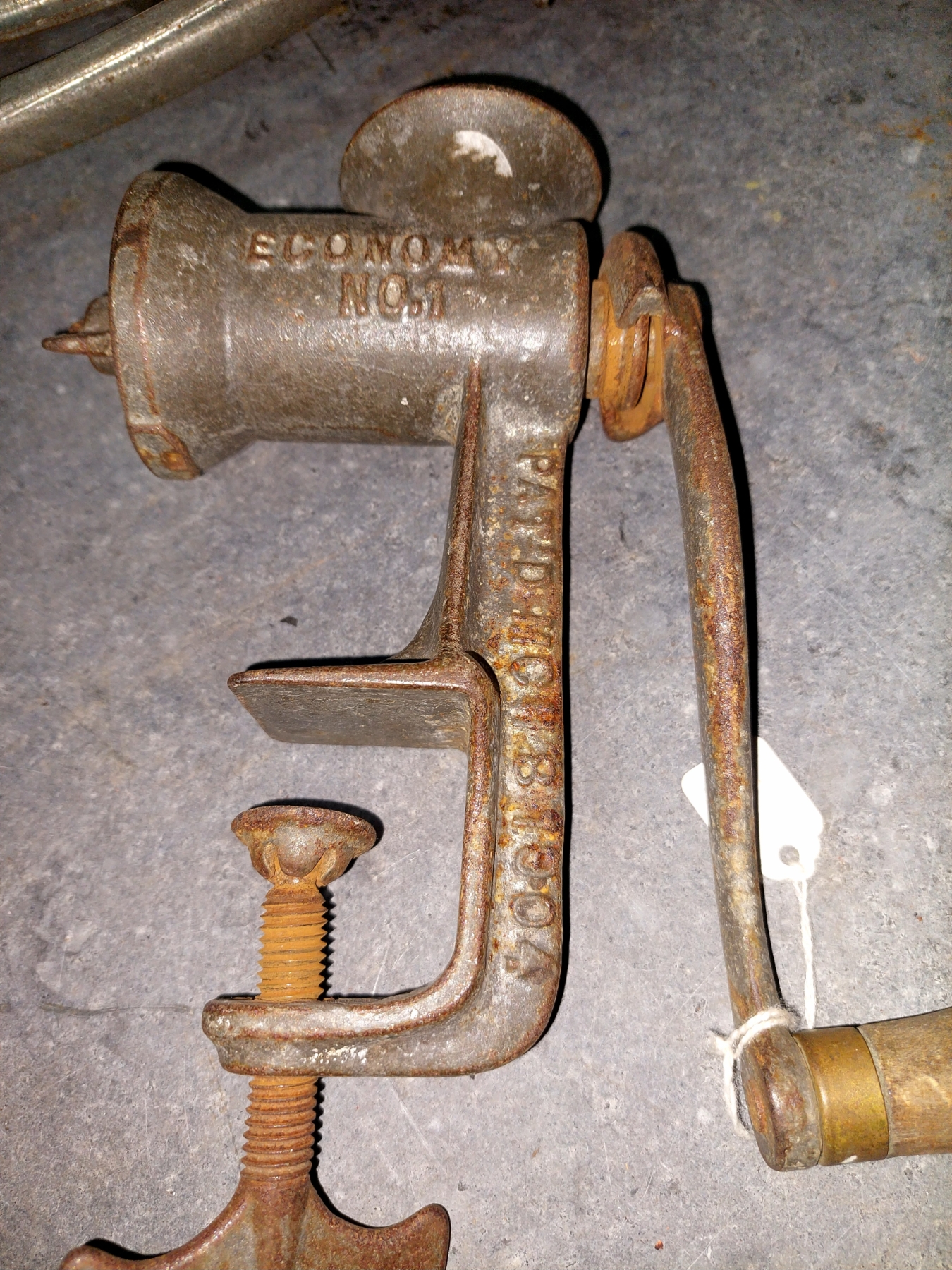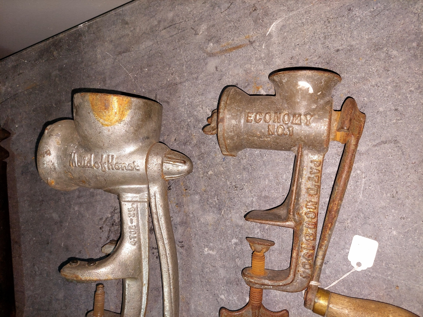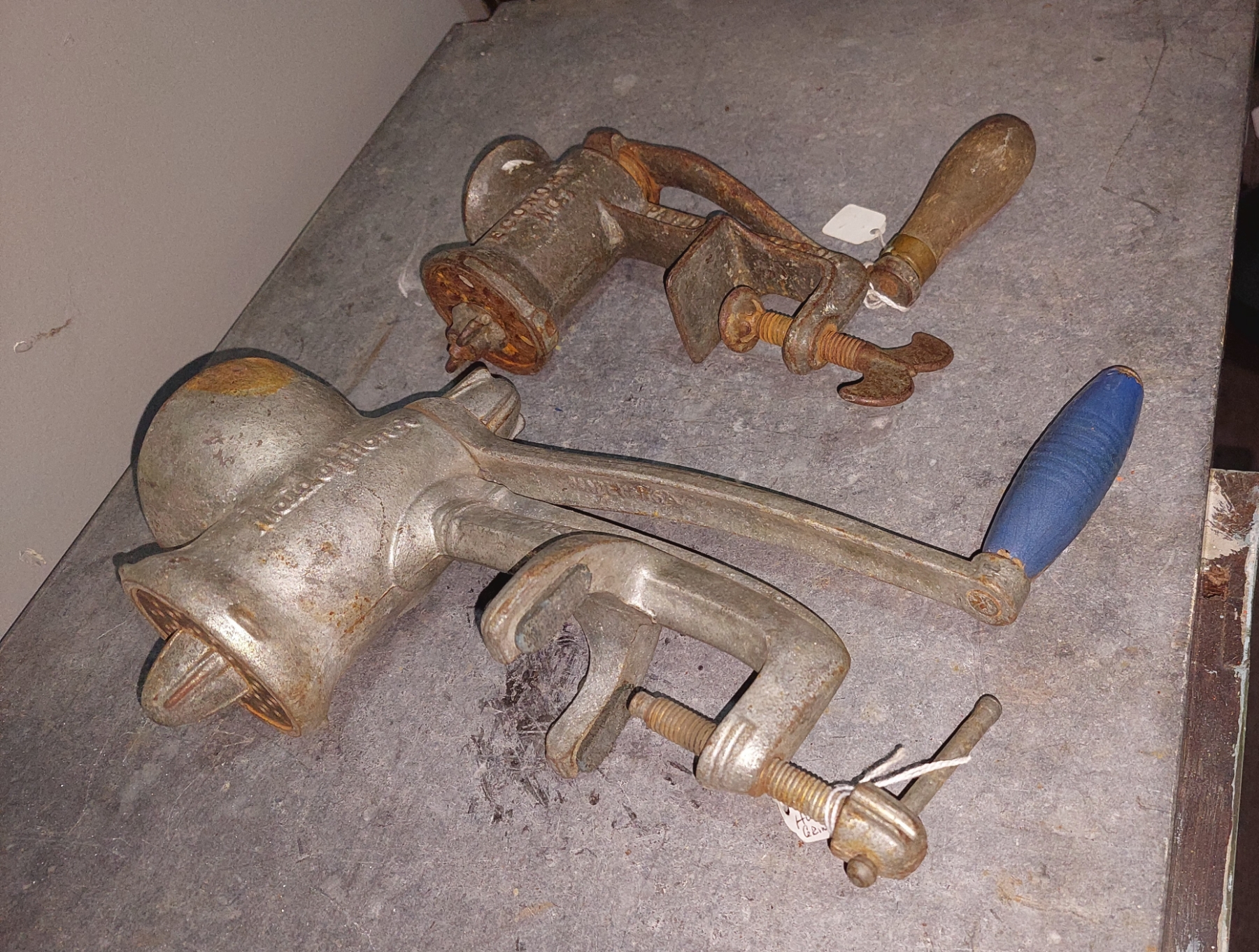 Lot Of Two (2) Antique Cast Iron Meat Grinders: 11" & 9" - Fully Functional