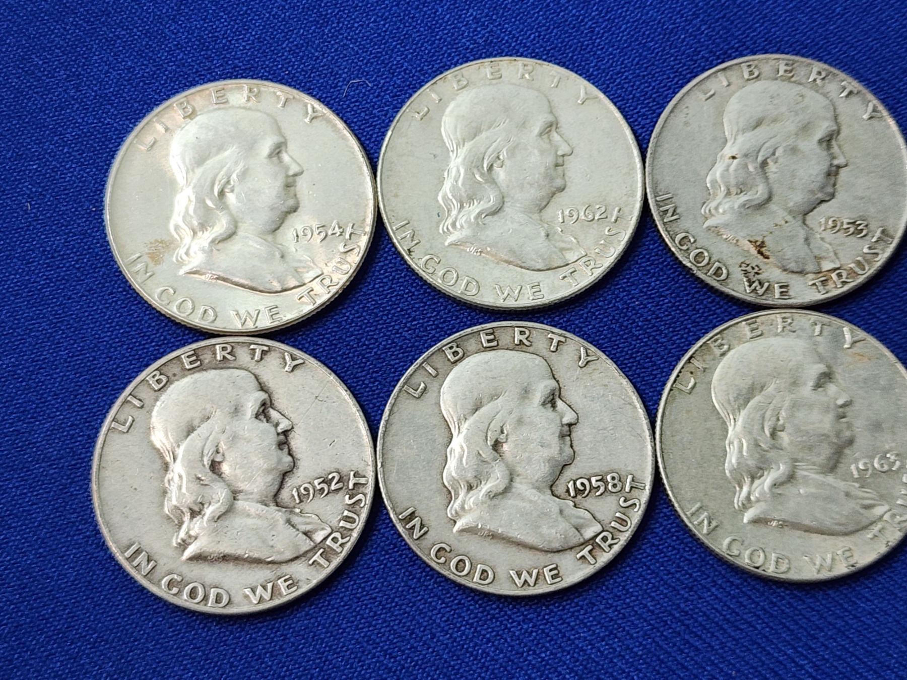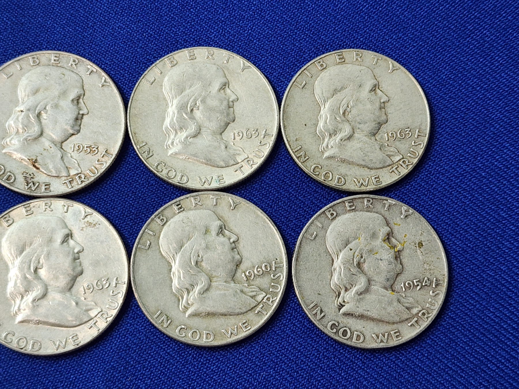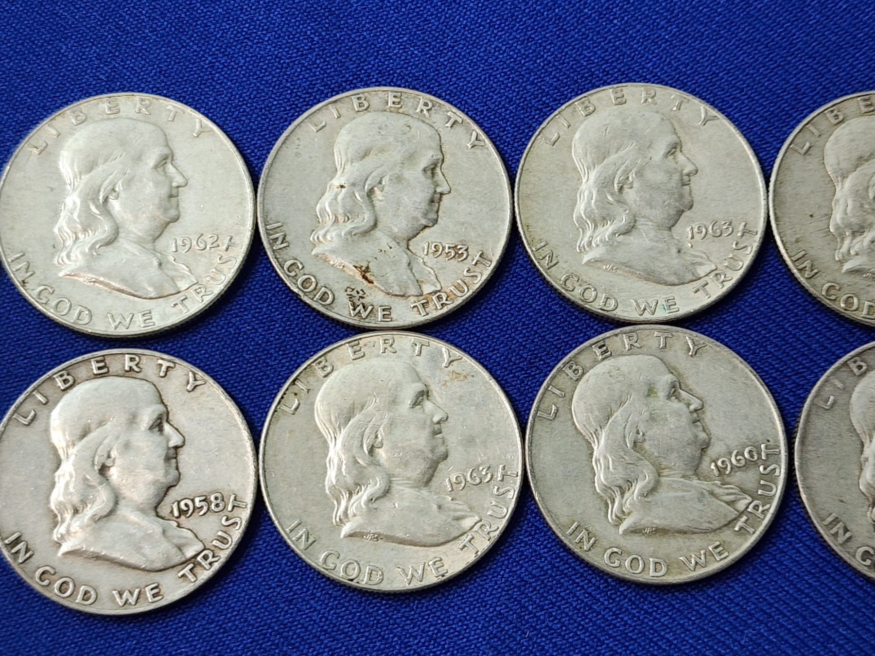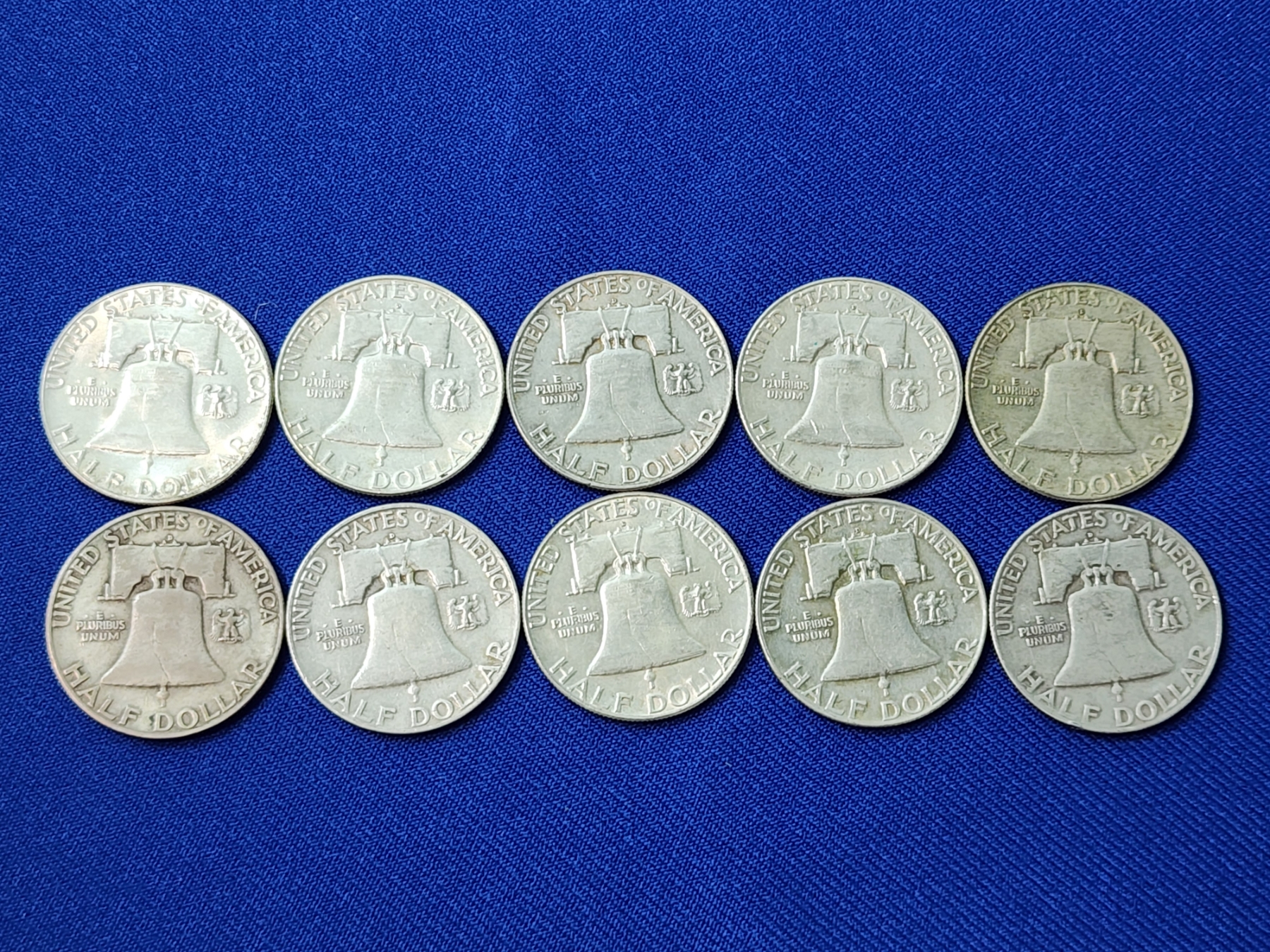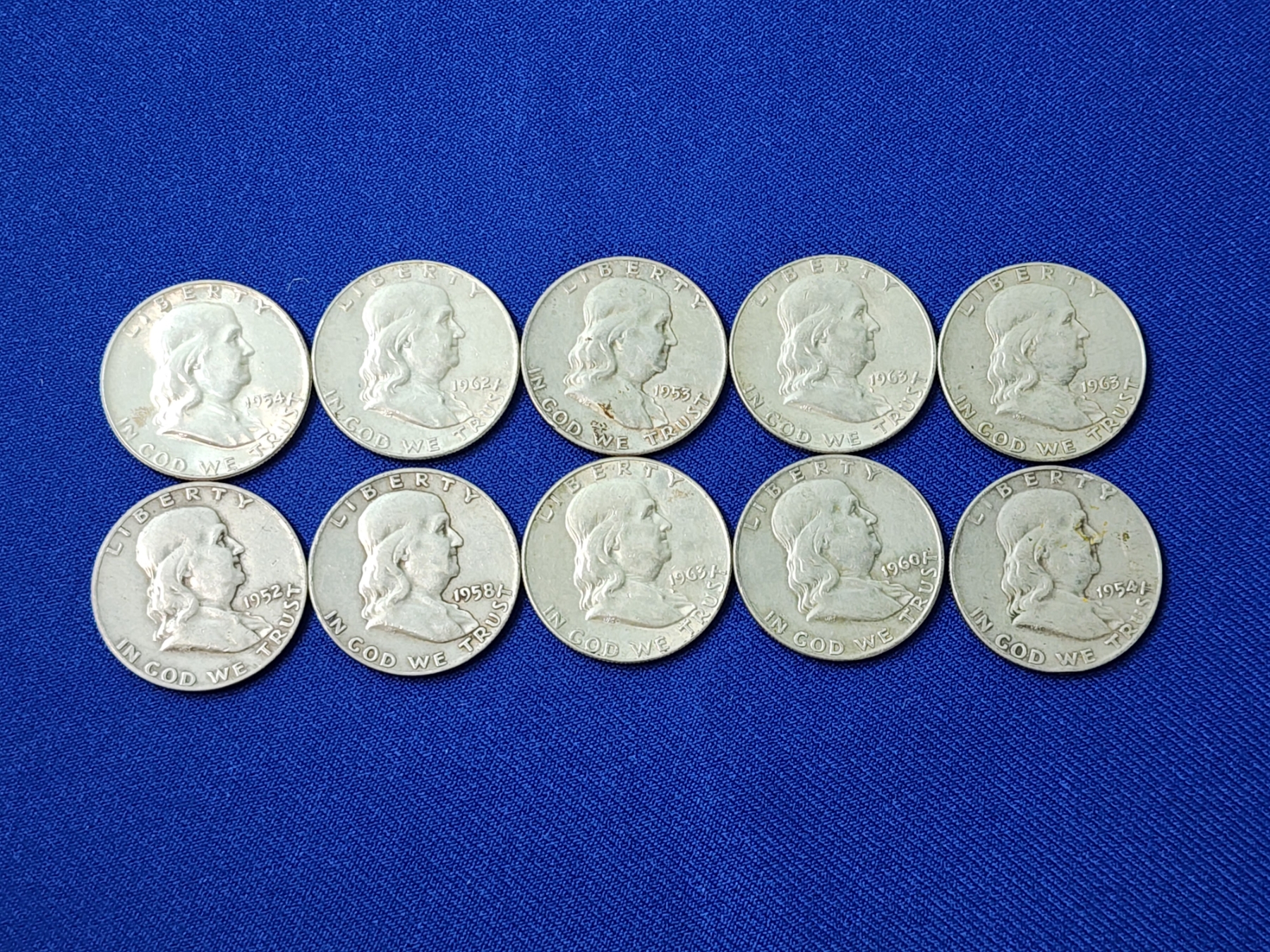 Lot of 10 Assorted Years Franklin Silver Half Dollars FV: $5.00