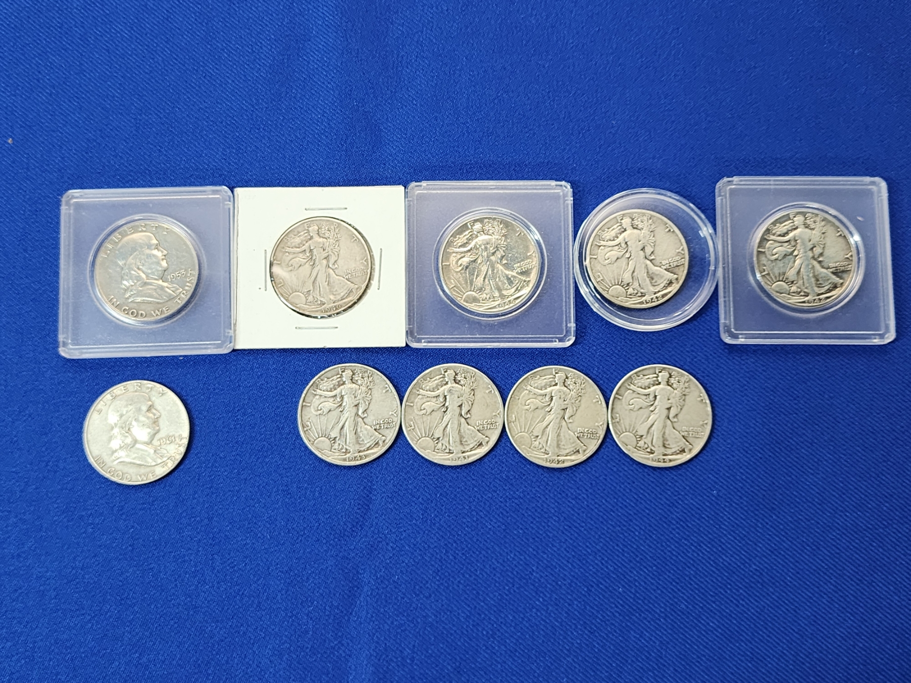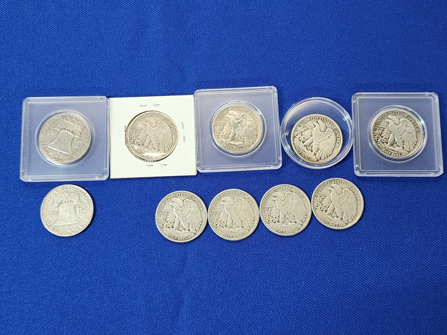 Lot of 10 Silver Half Dollars: x2 Franklin Half Dollars & x8 Walking Liberty Half Dollars