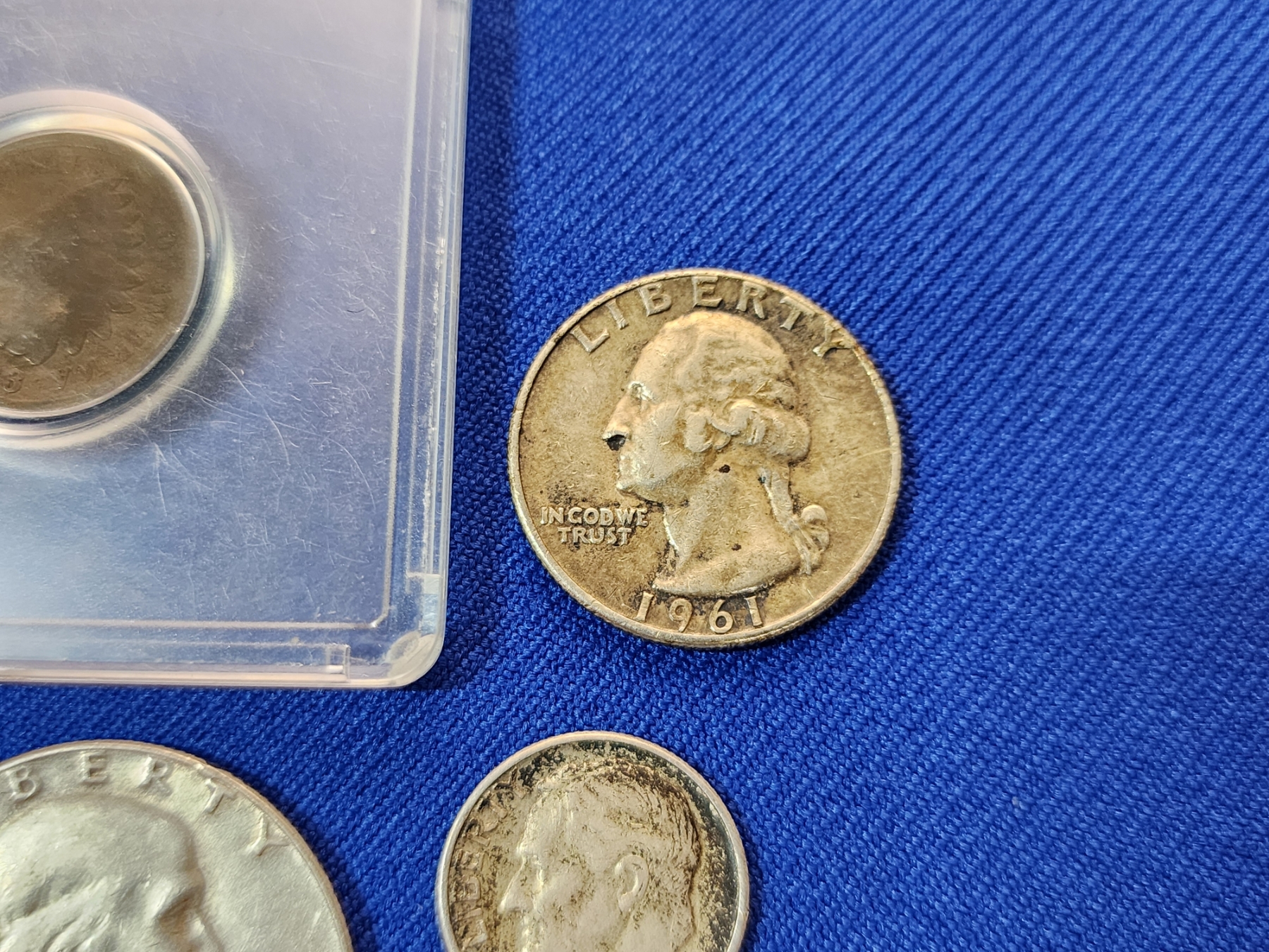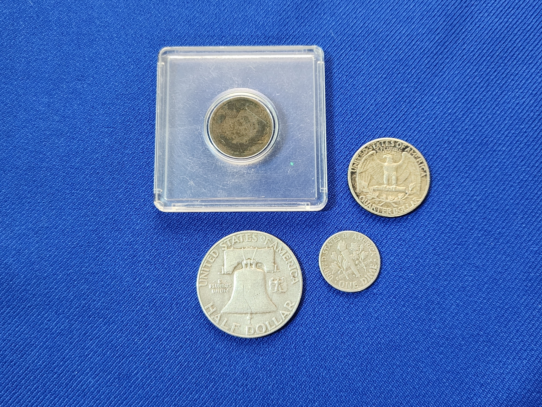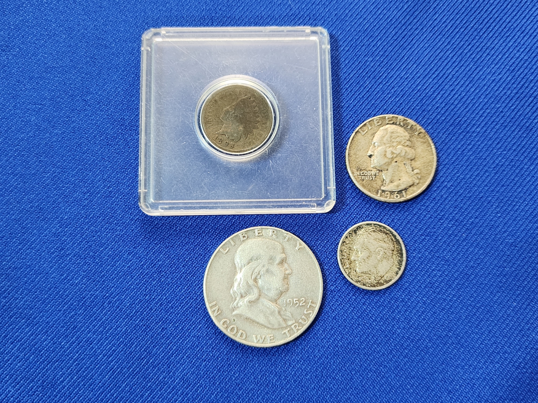 1893 Indian Head Cent, 1961 Washington Silver Quarter, 1952 Franklin Silver Half Dollar, 1962 Roosevelt Silver Dime
