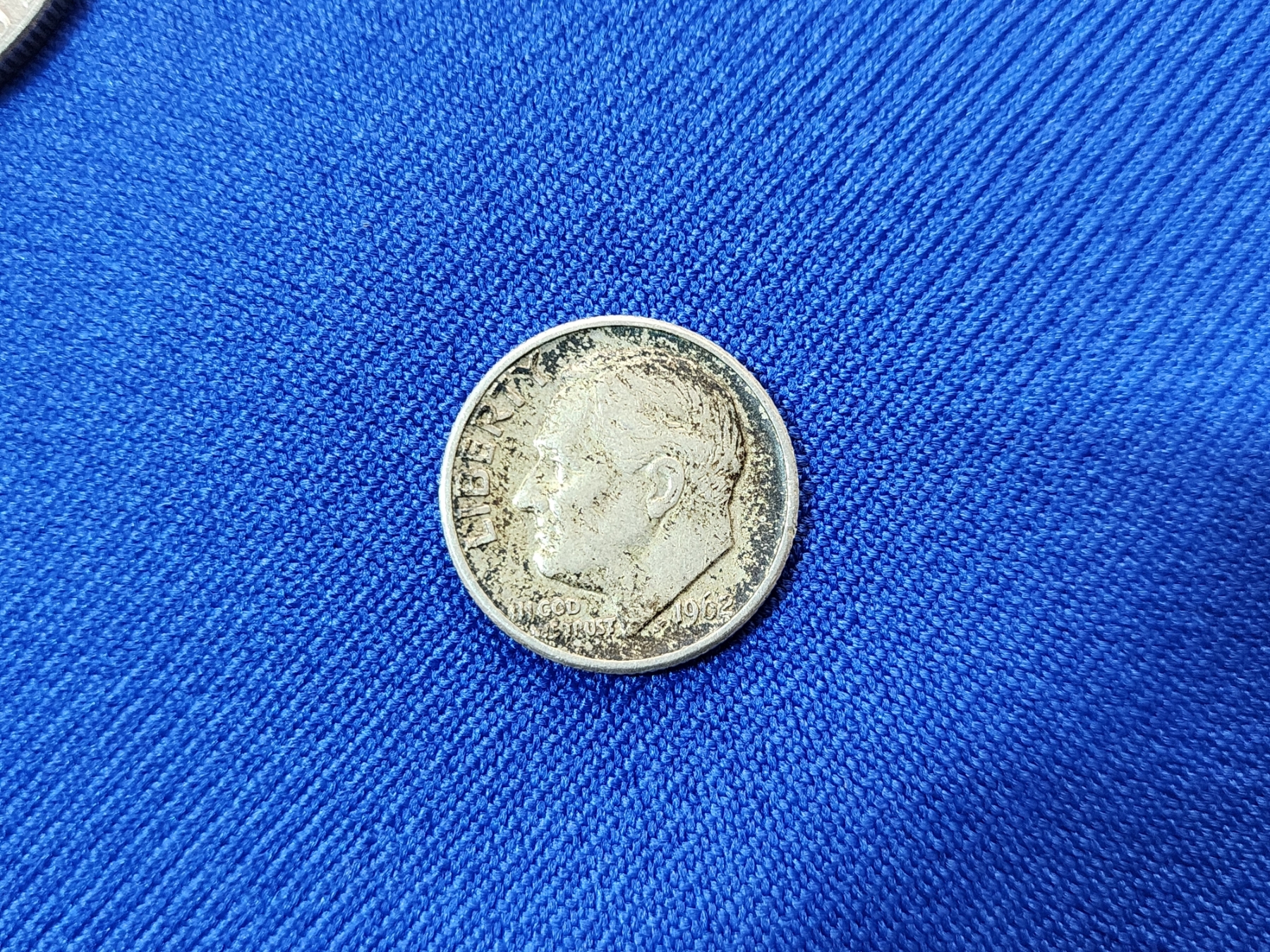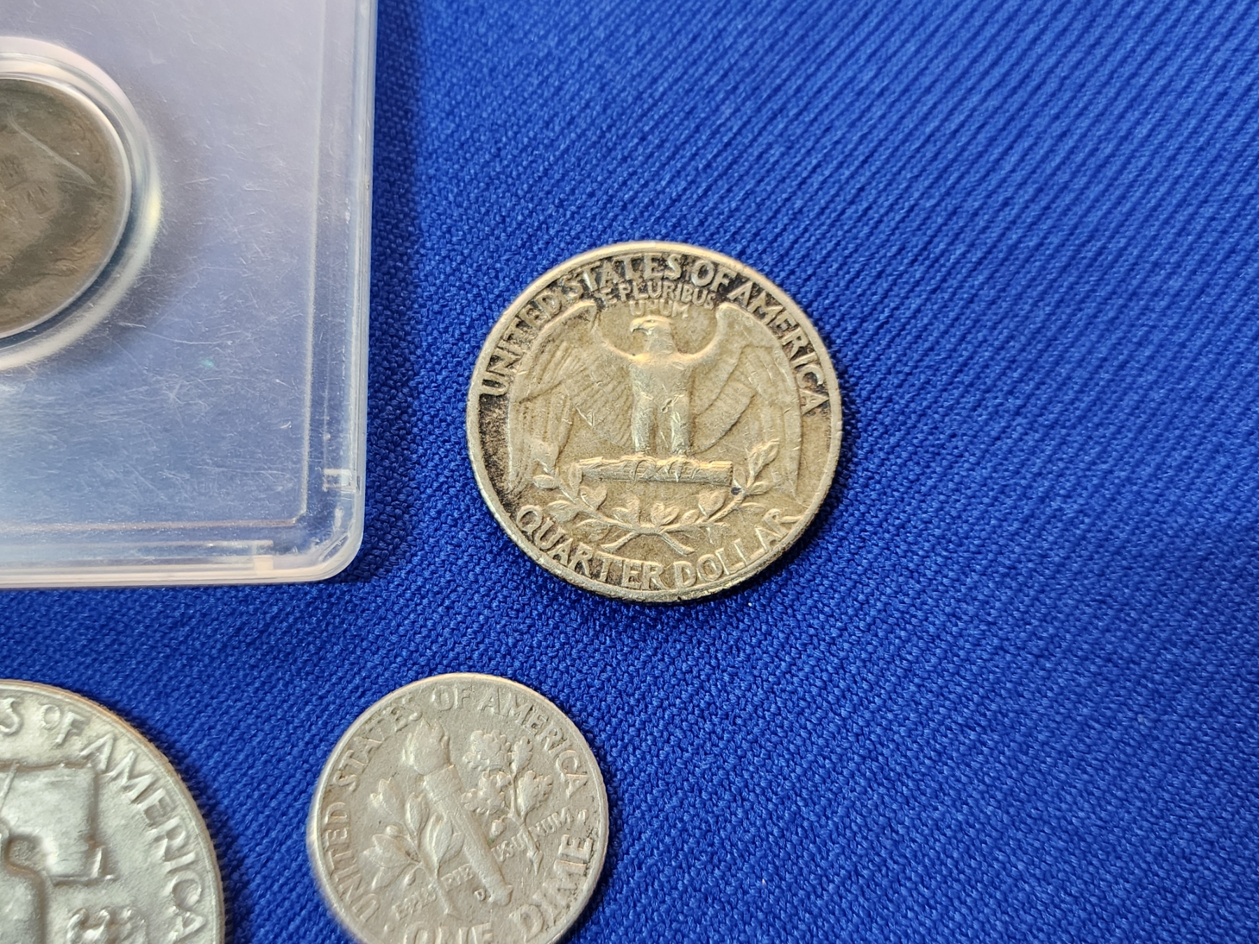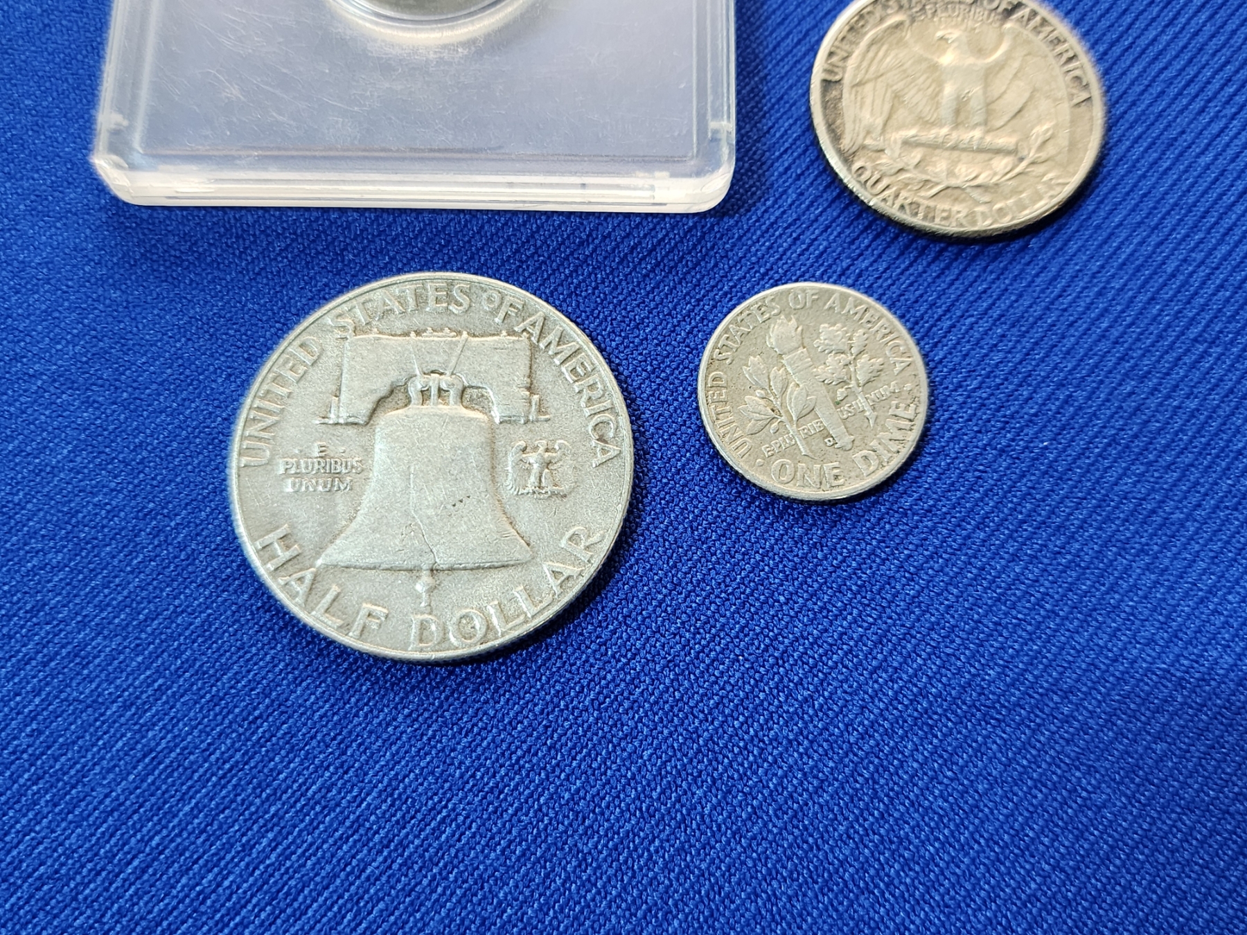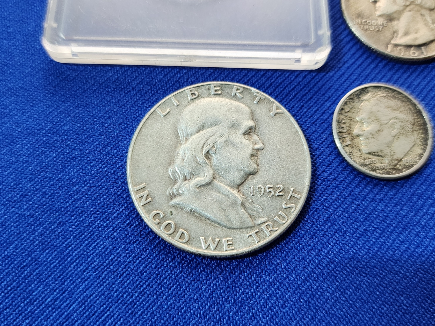 1893 Indian Head Cent, 1961 Washington Silver Quarter, 1952 Franklin Silver Half Dollar, 1962 Roosevelt Silver Dime