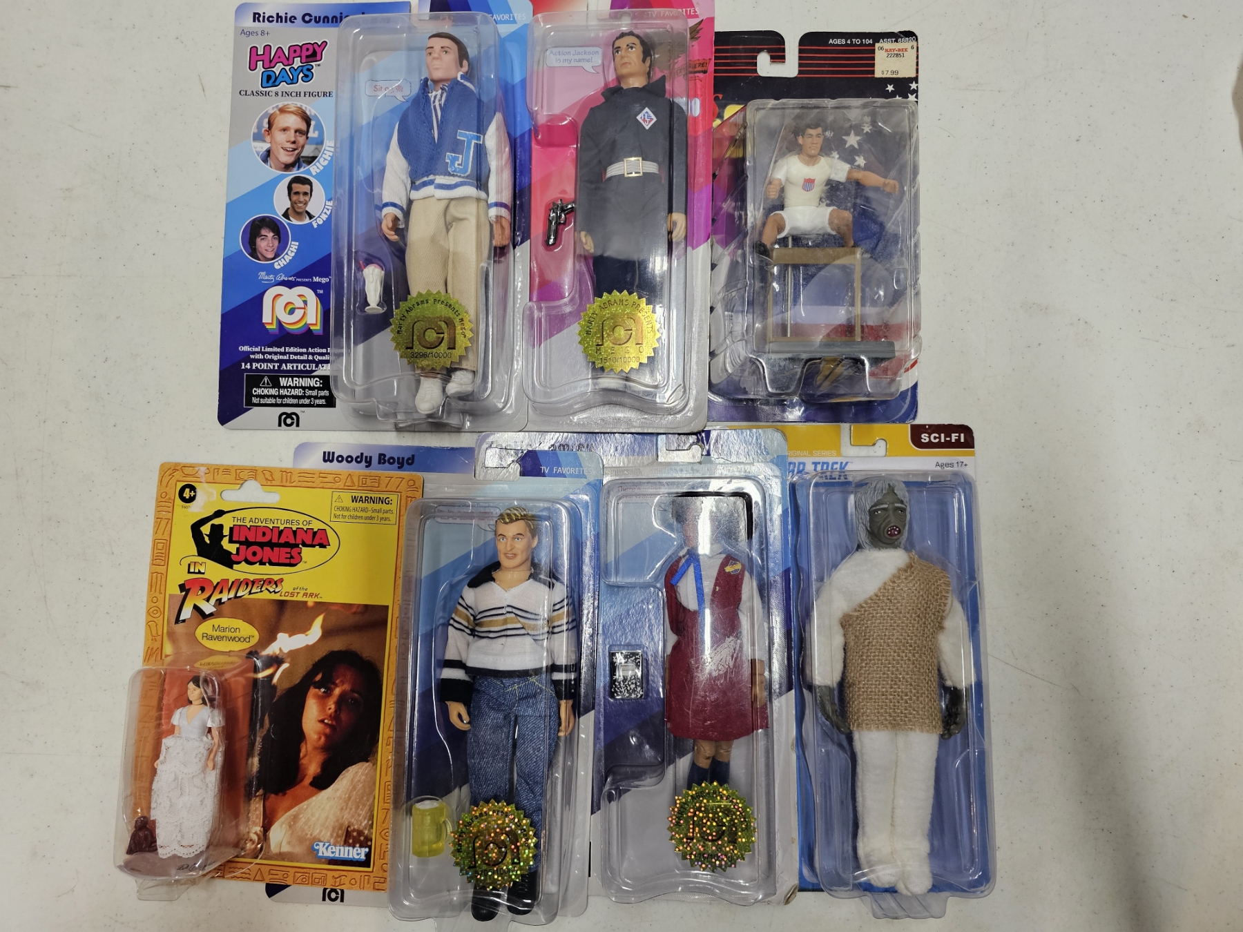 Lot of (7) Action Figures - Television/Sports Themed - ft. Salt Vampire (Star Trek), Tootie Ramsey (The Facts of Life), Woody Boyd (Cheers), Marion Ravenwood (Indiana Jones), Jim Thorpe (Athlete), Action Jackson (Action Jackson), Richie Cunningham (Happy Days), All NIB, Great Condition!!!