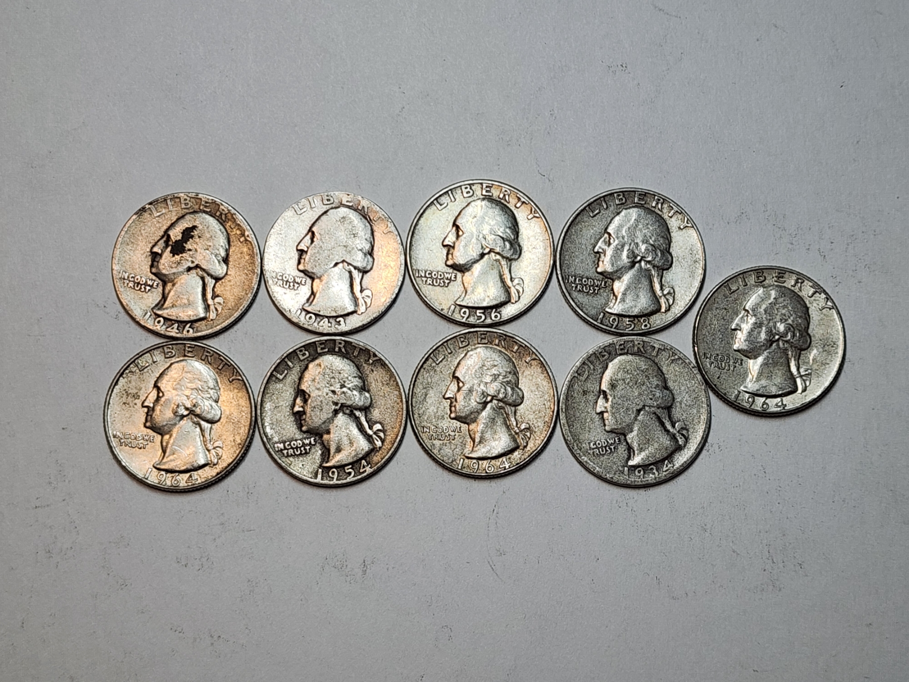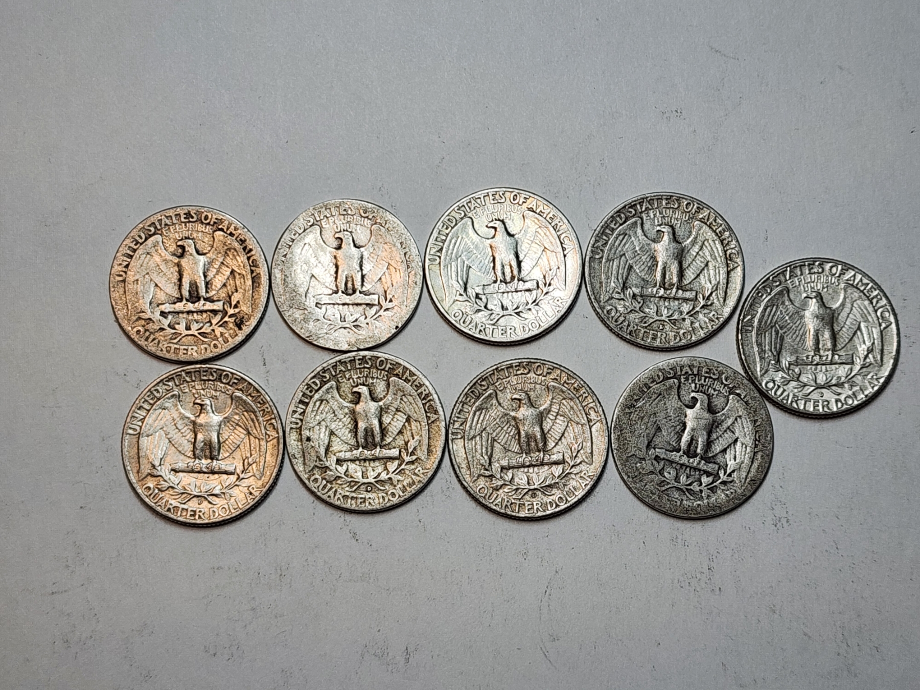 Lot of 9 Assorted Years Silver Washington Quarters FV: $2.25