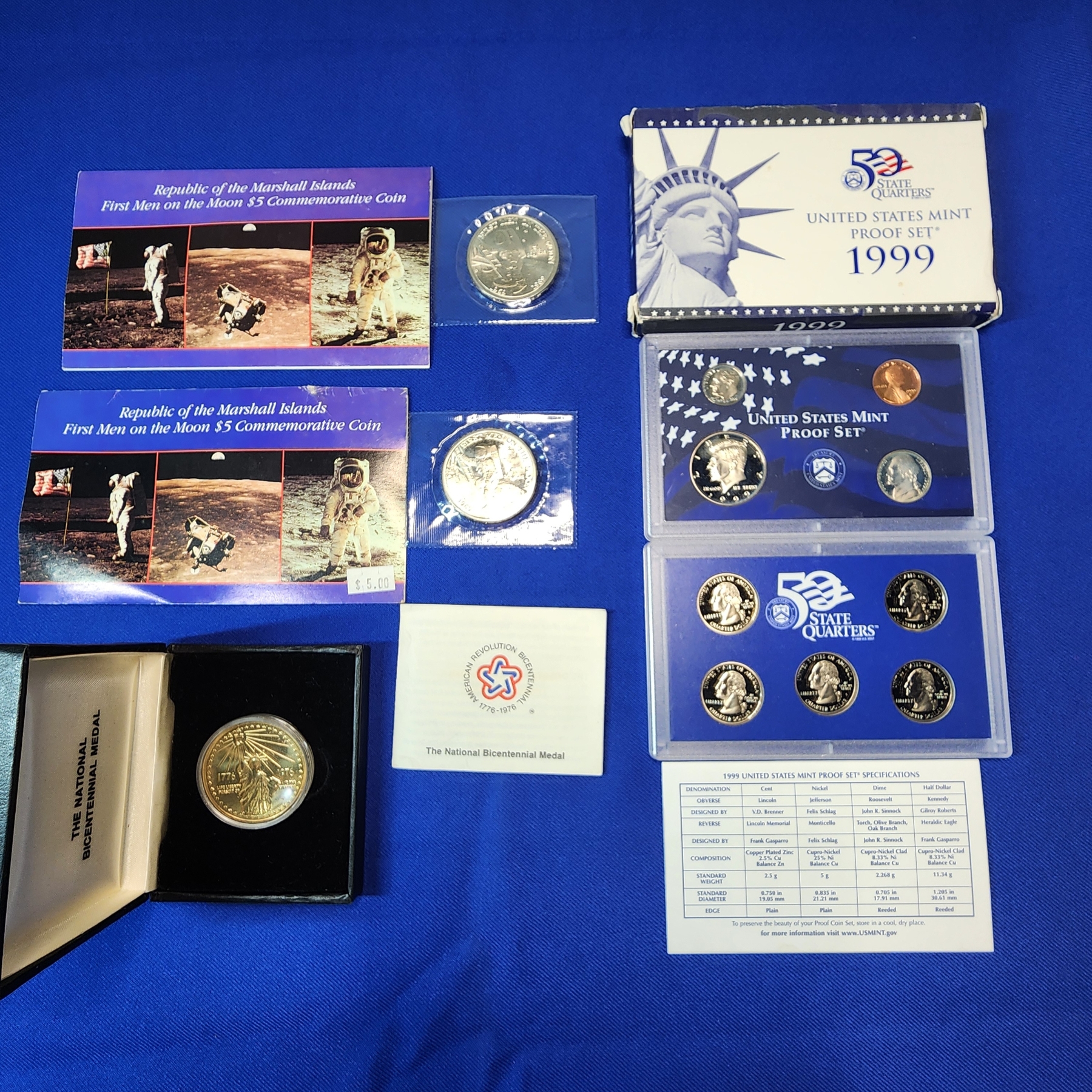 Lot of Assorted Coins: First Men on the Moon Coin, 1999 Proof Set, National Bicentennial Metal