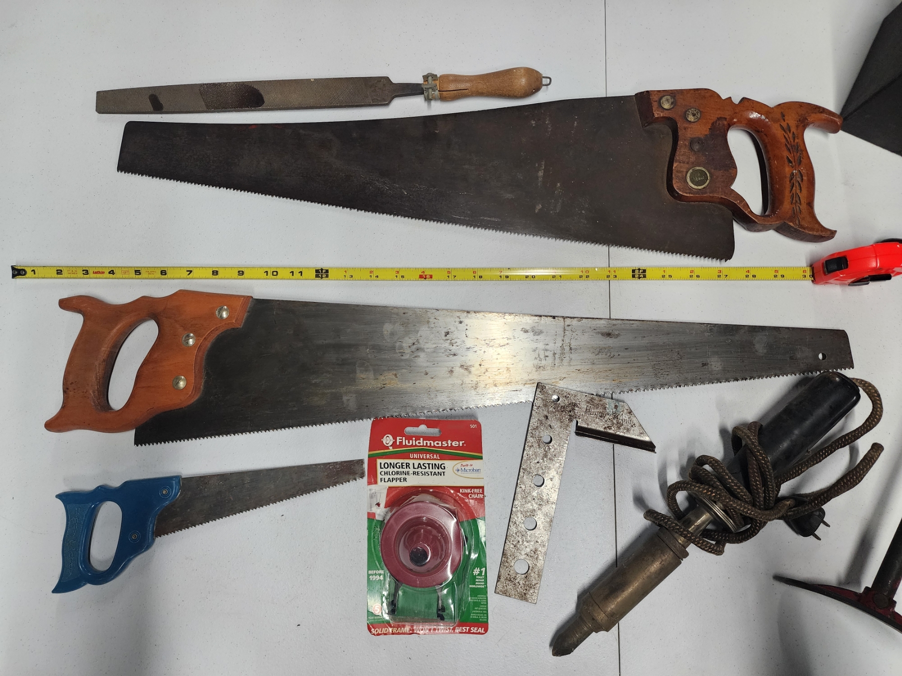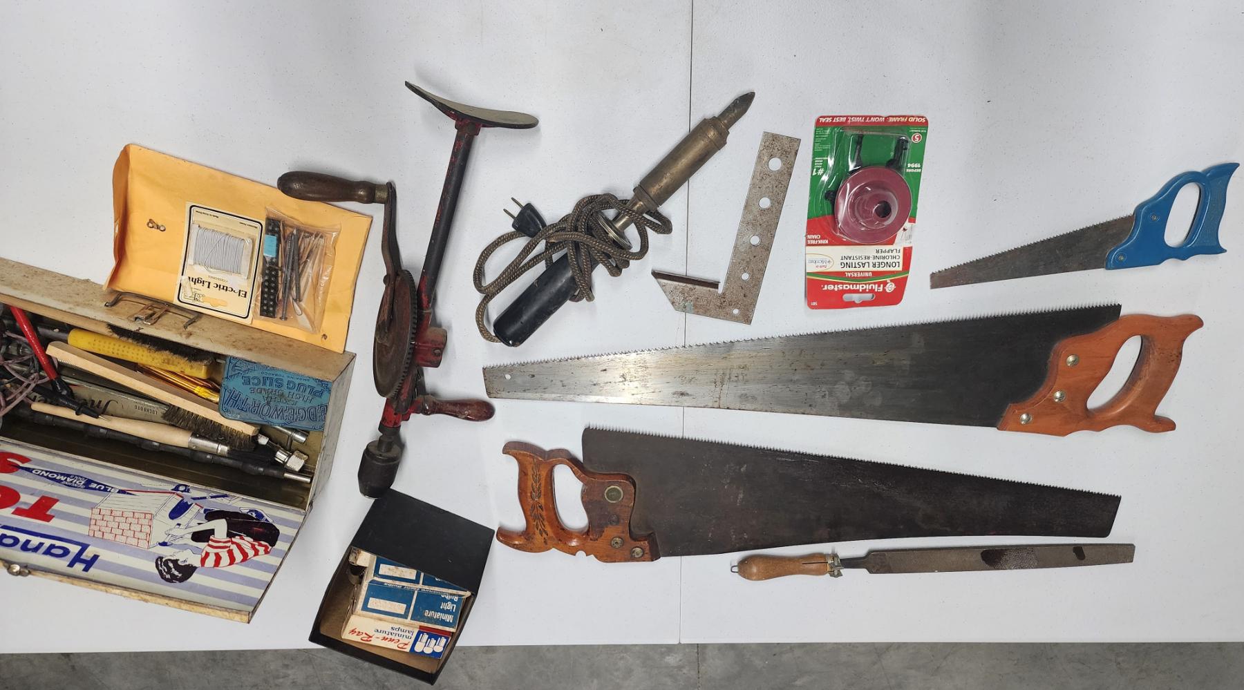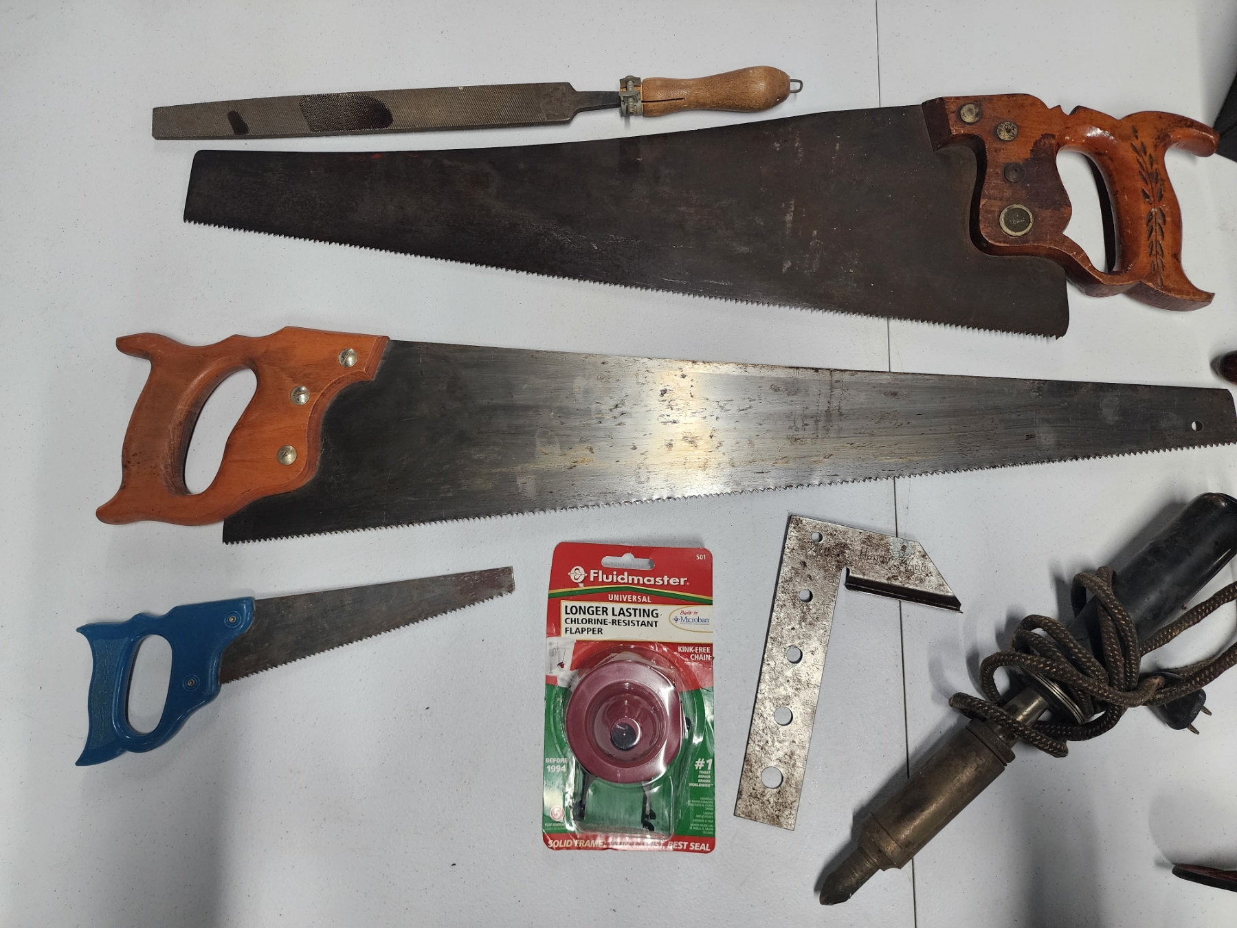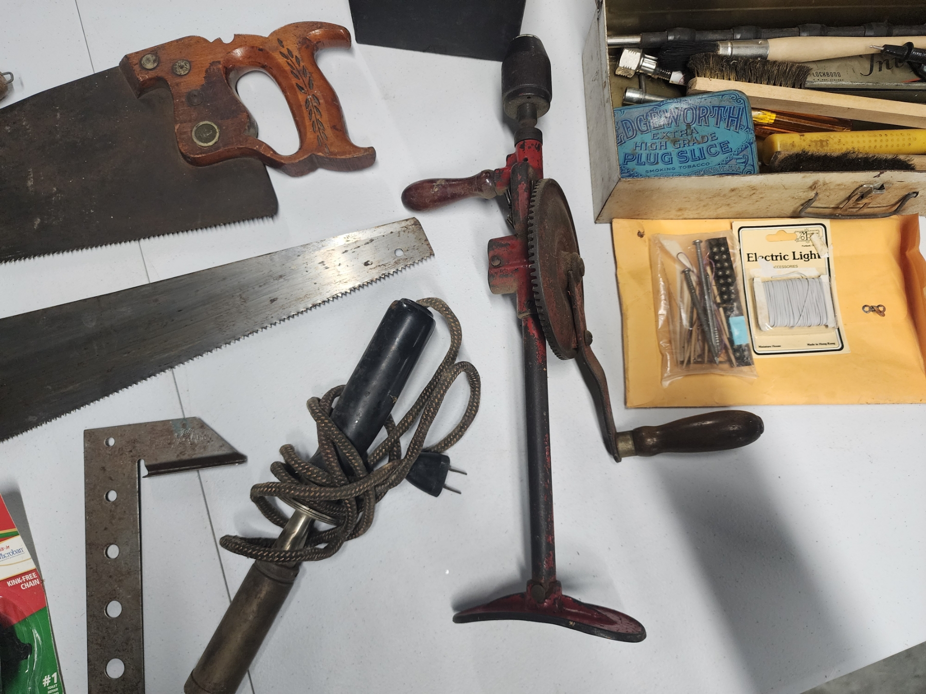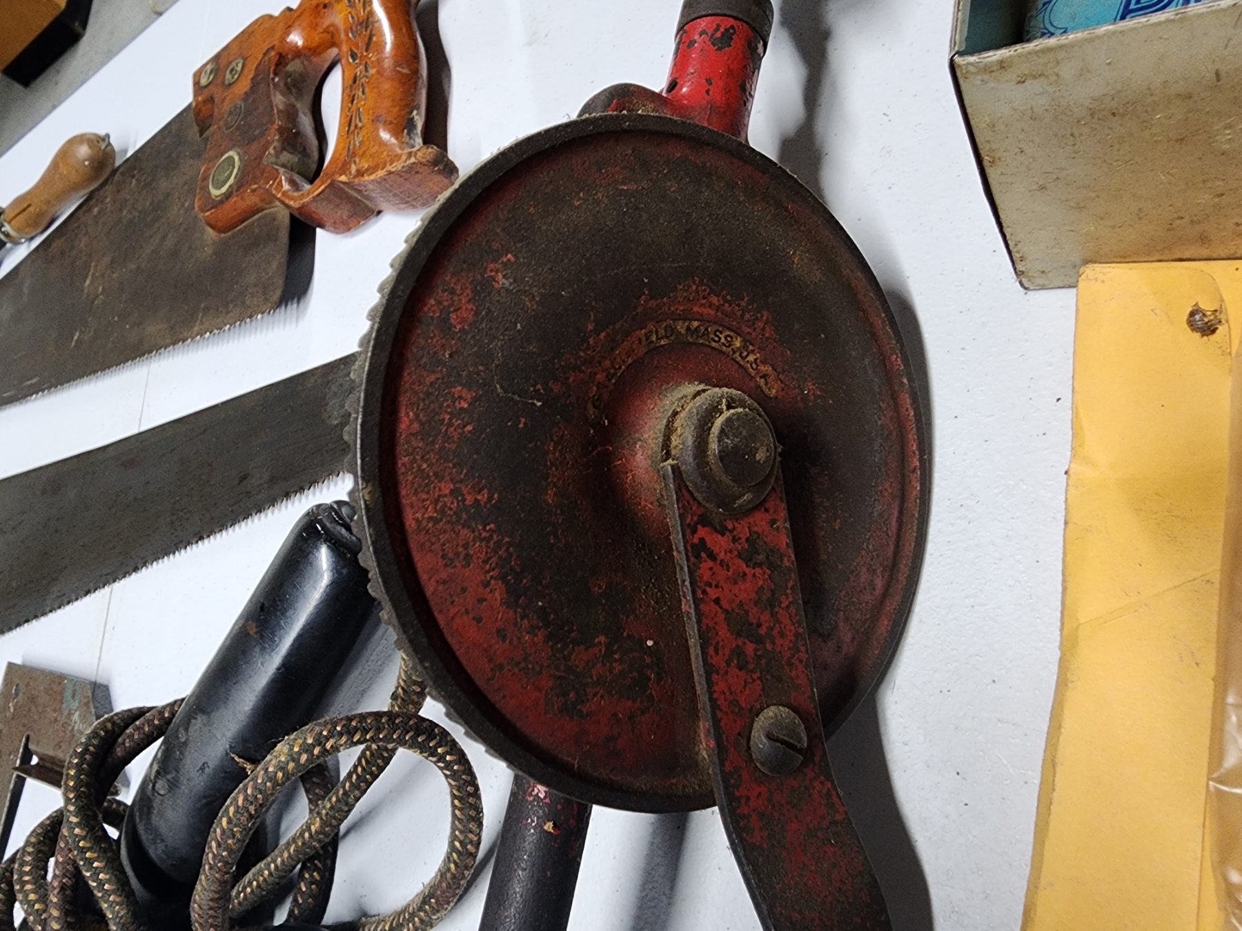 Lot of Assorted Tools Including Saws, Vintage Breast Drill Wood Tool, & More - See Photos!