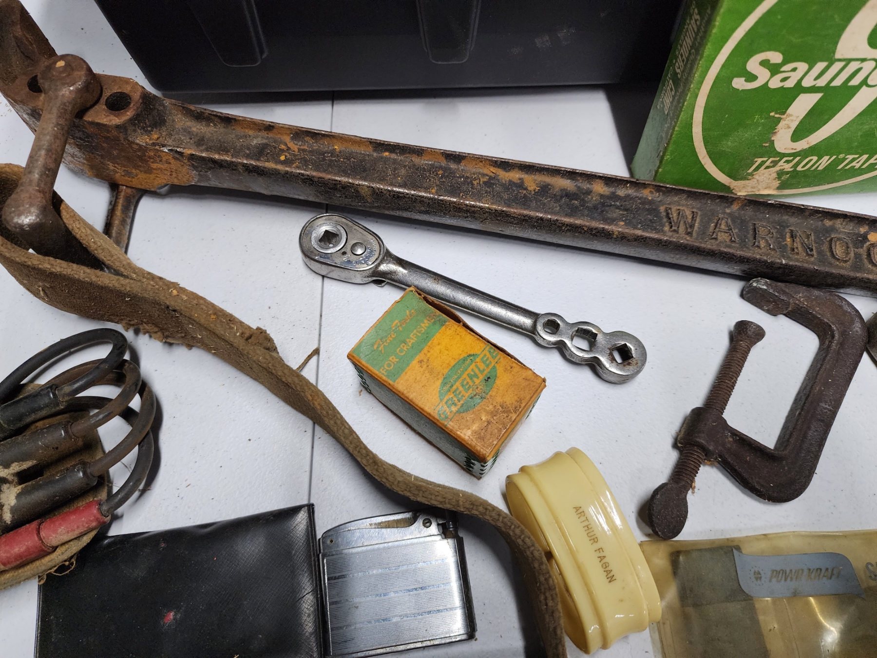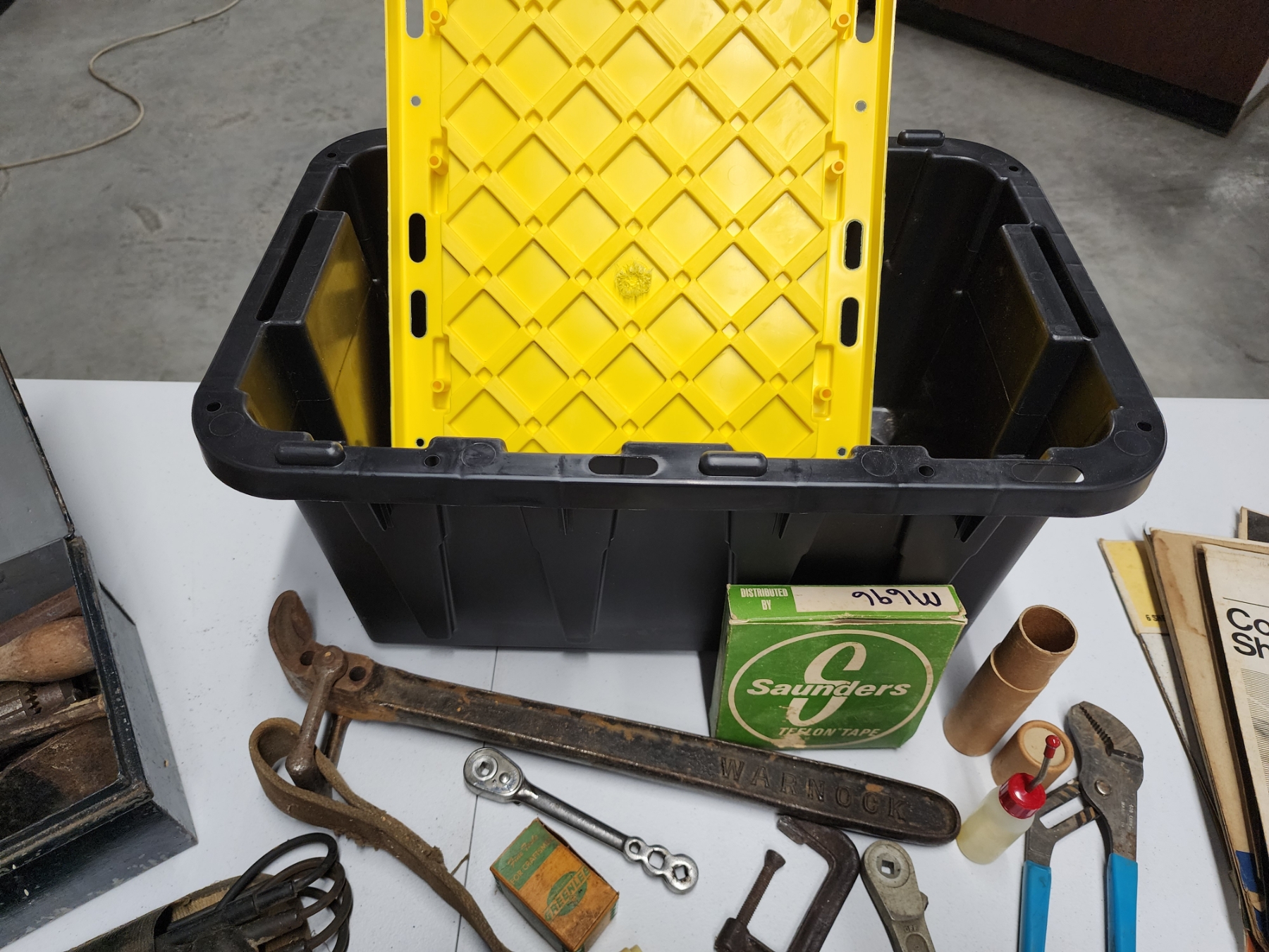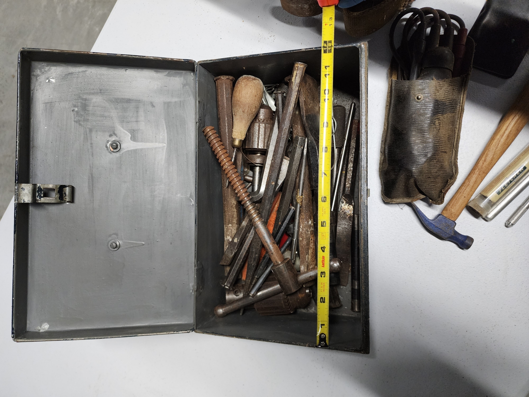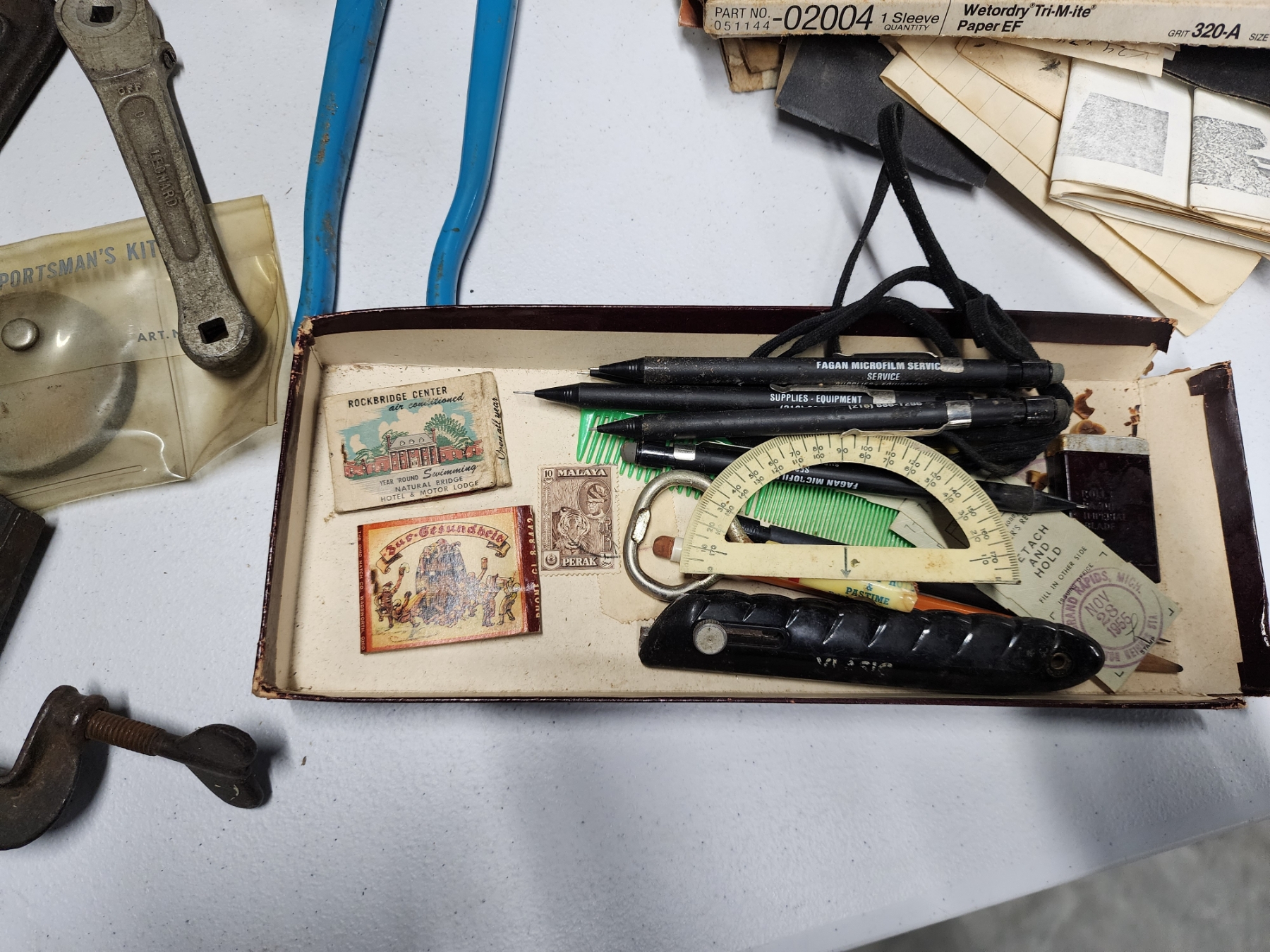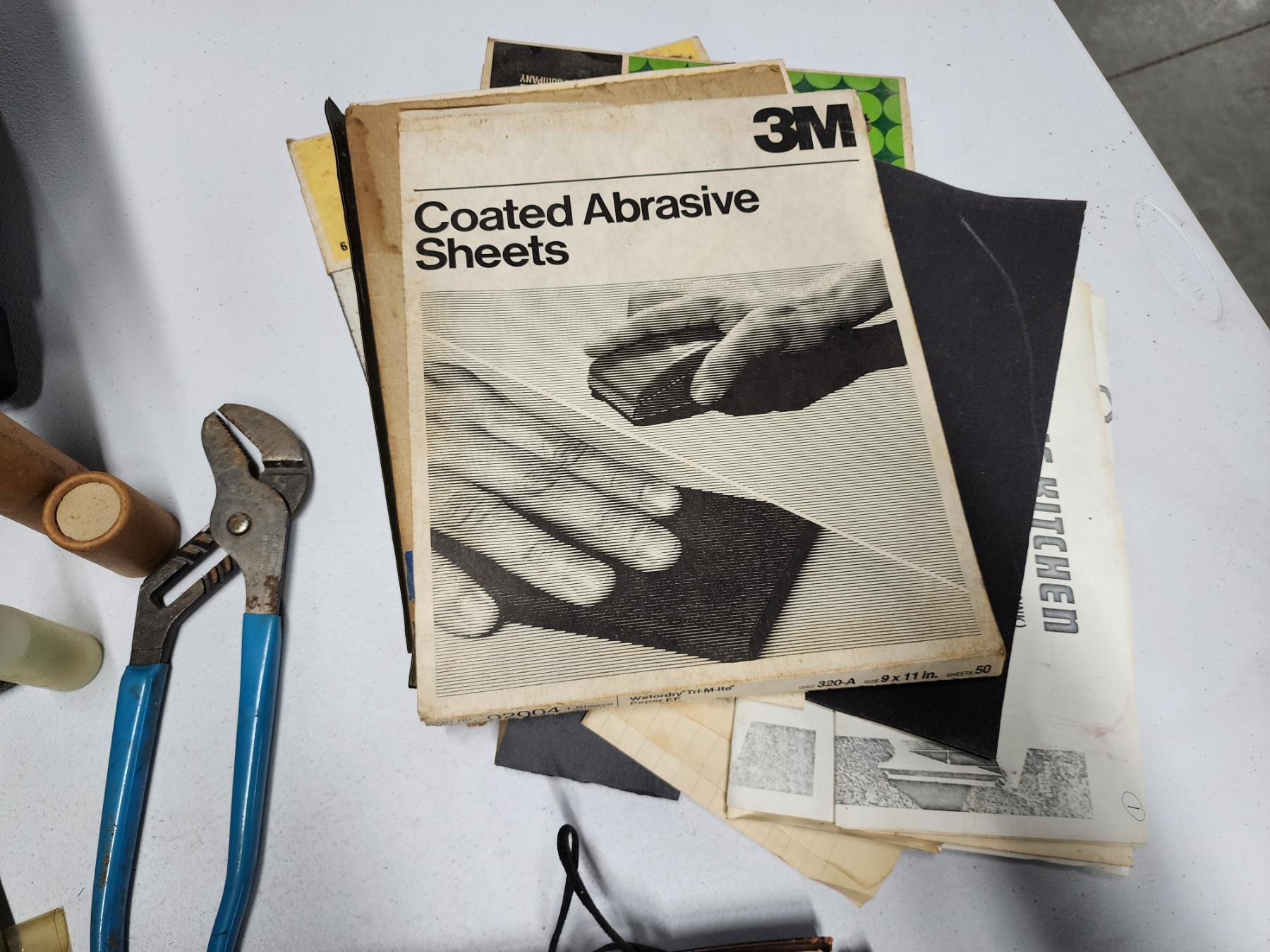 Lot of Assorted Tools, Parts, Sandpaper, Toolbox, and Small Storage Bin