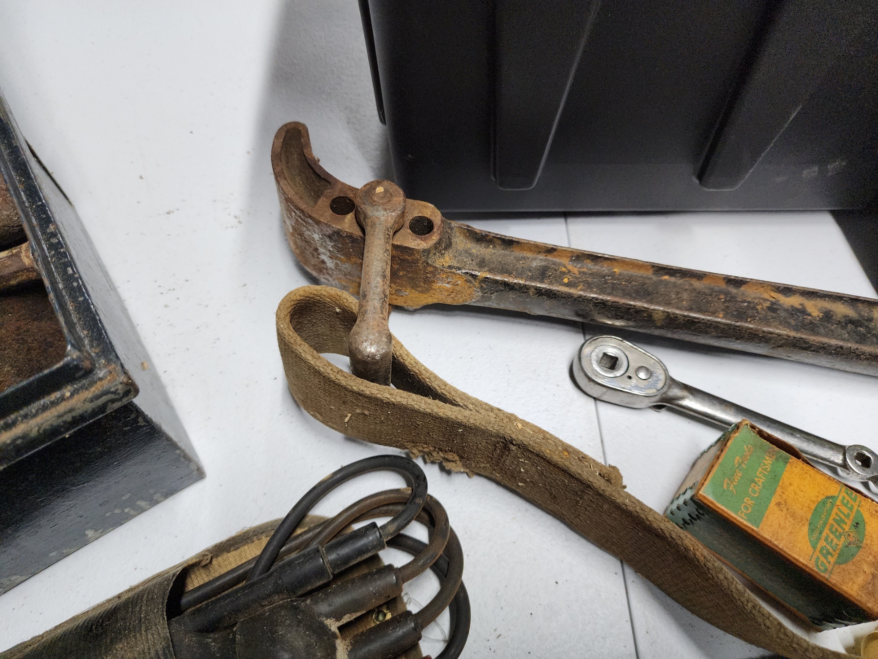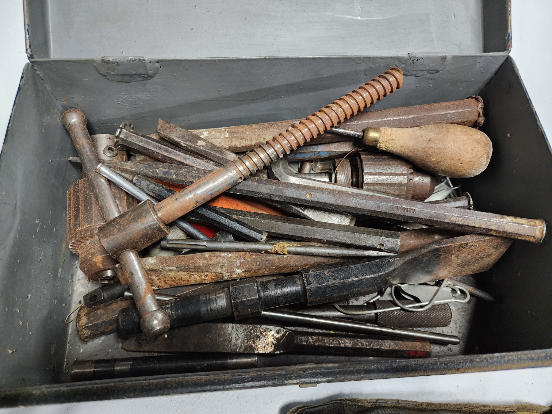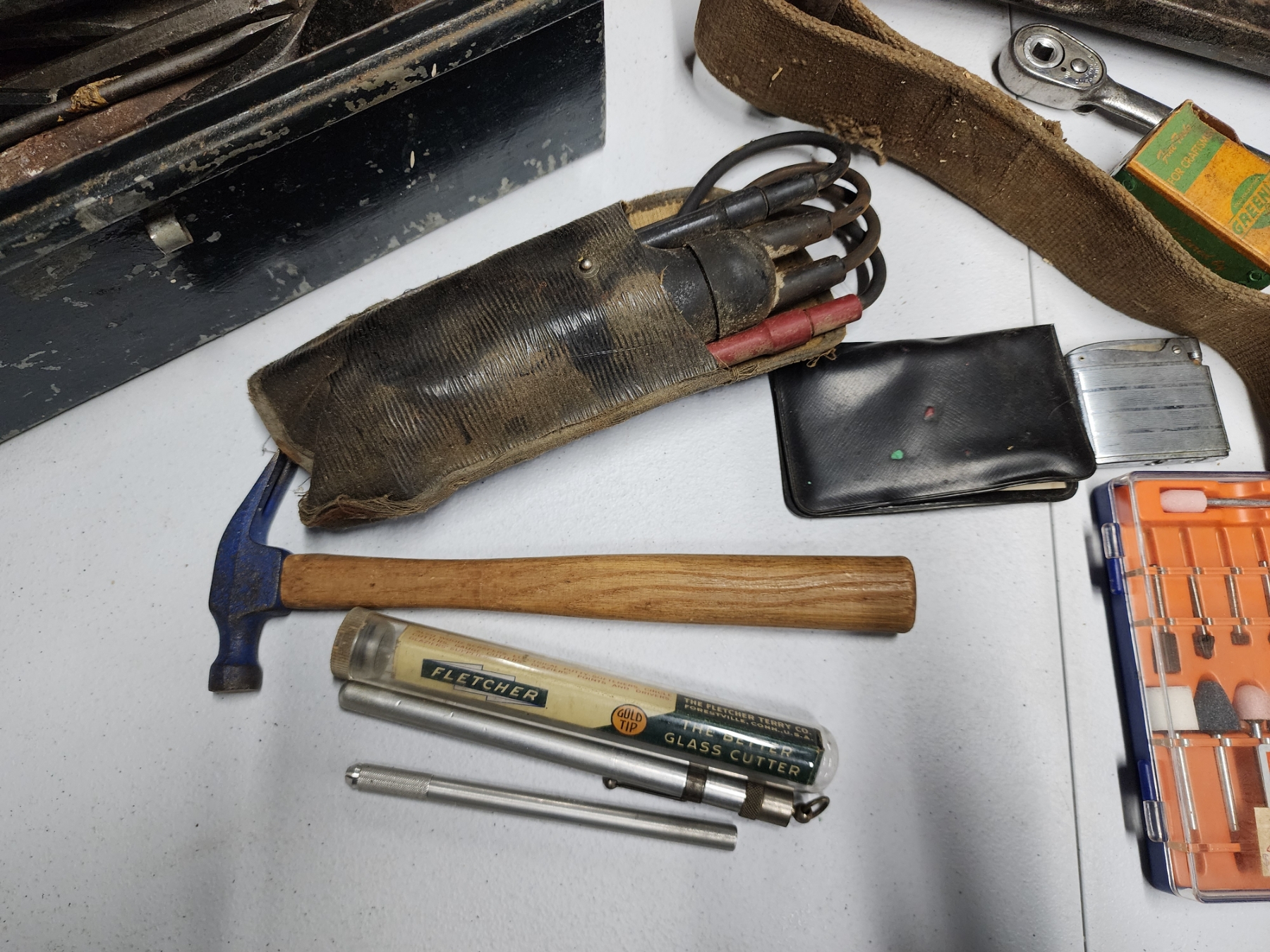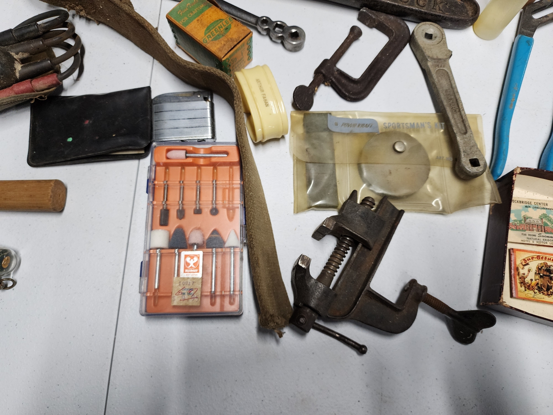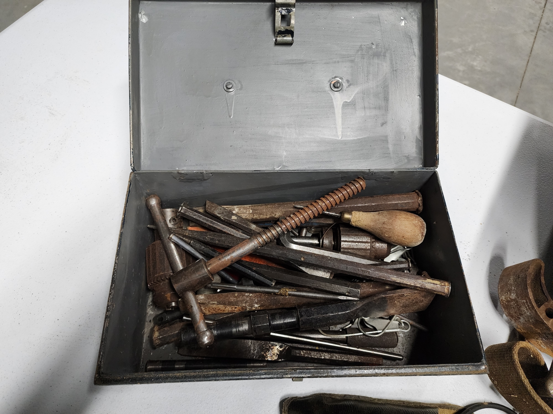 Lot of Assorted Tools, Parts, Sandpaper, Toolbox, and Small Storage Bin