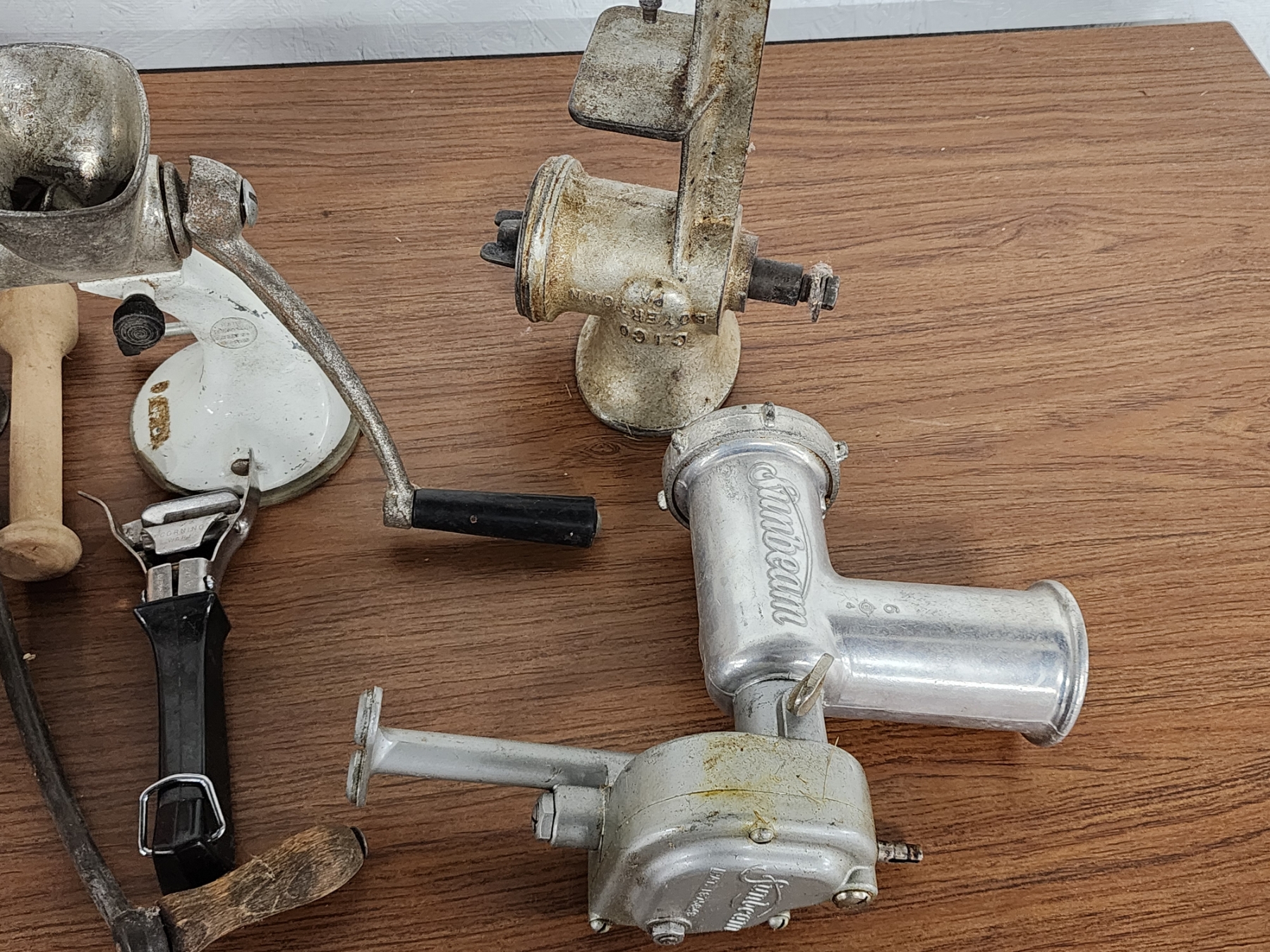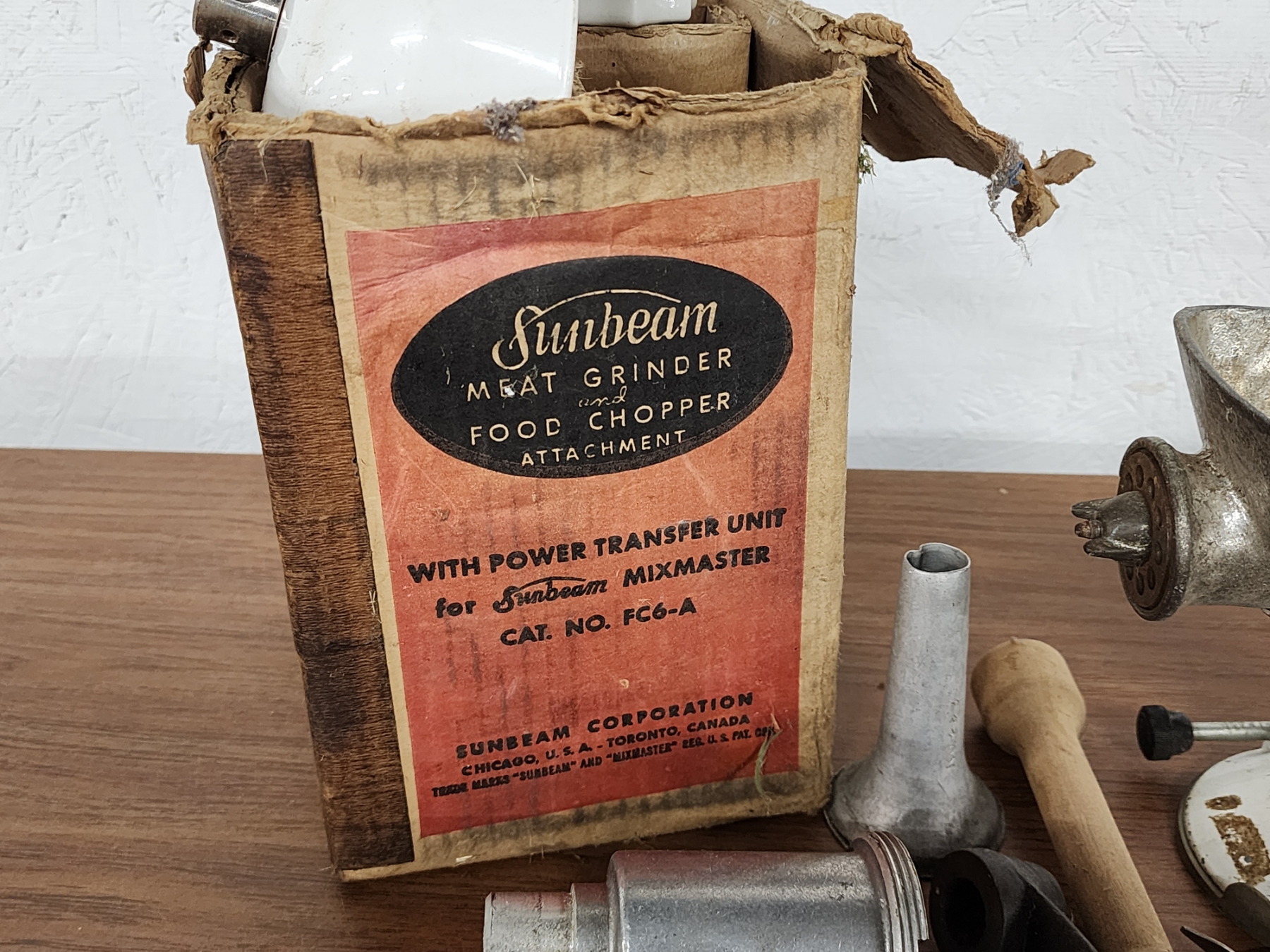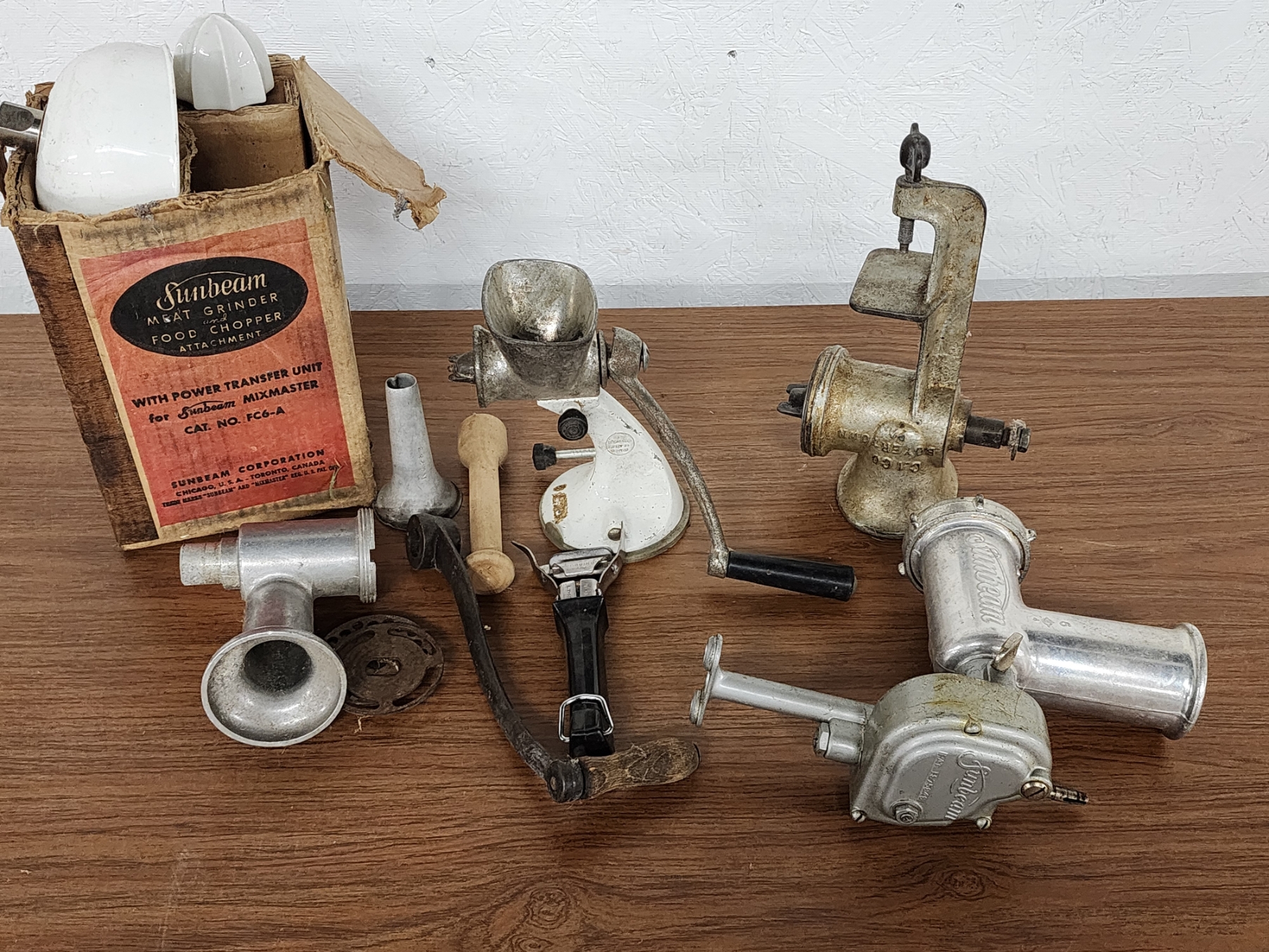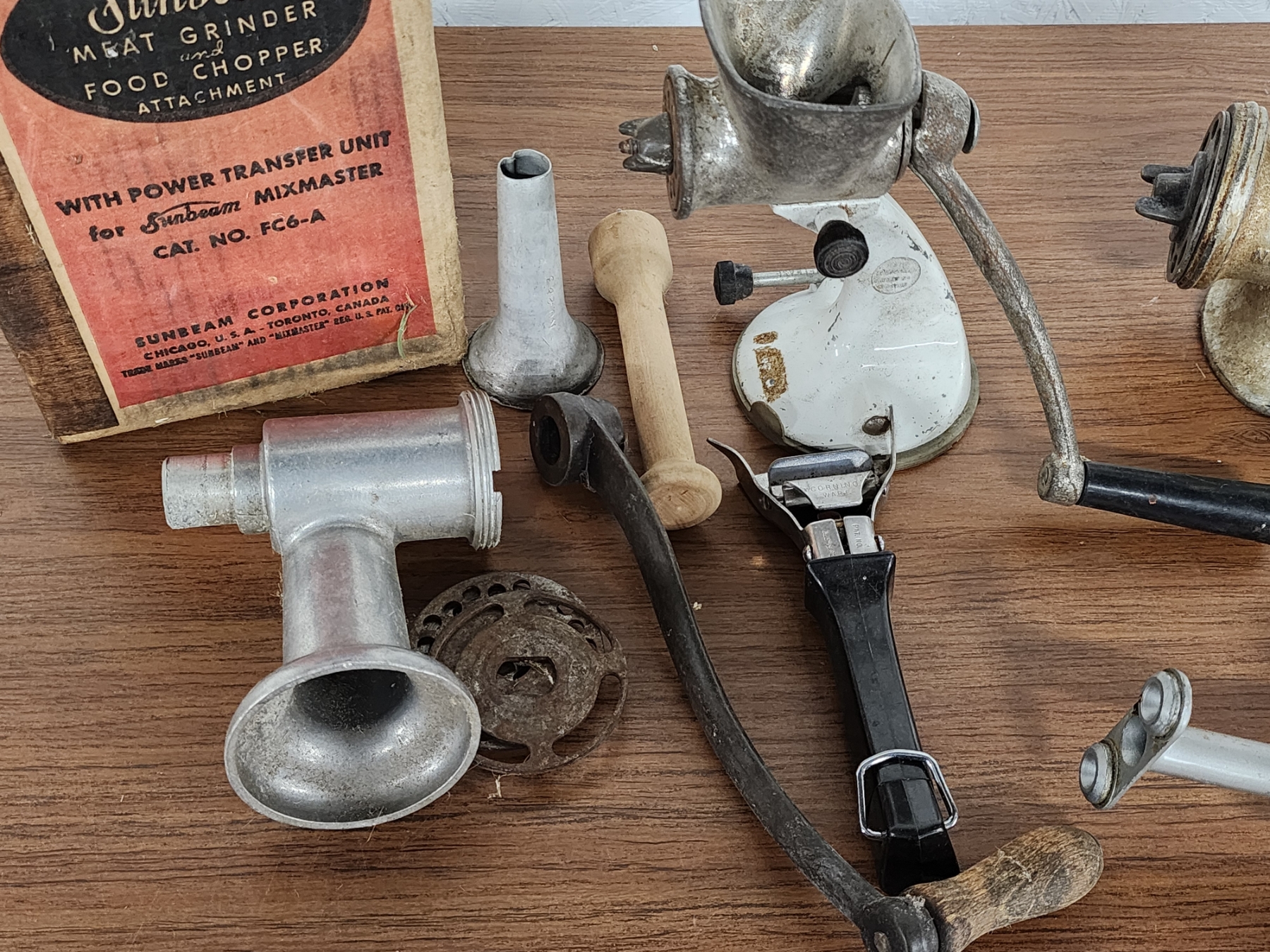 Lot of Assorted Vintage Meat Grinders and Parts Including Sunbeam Meat Grinder & Food Chopper