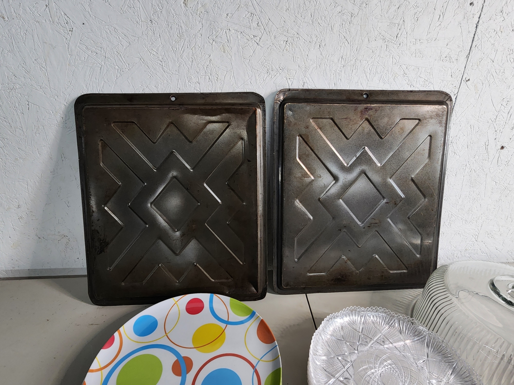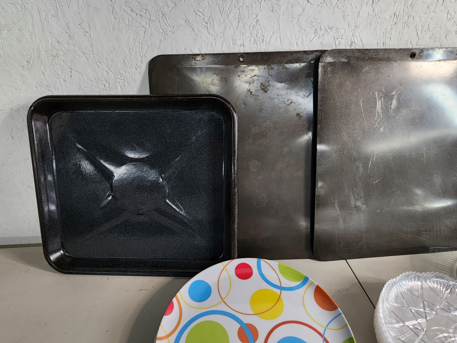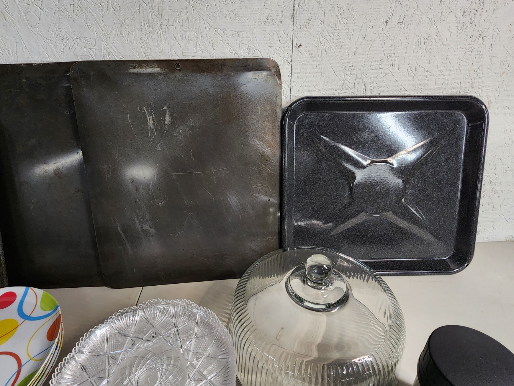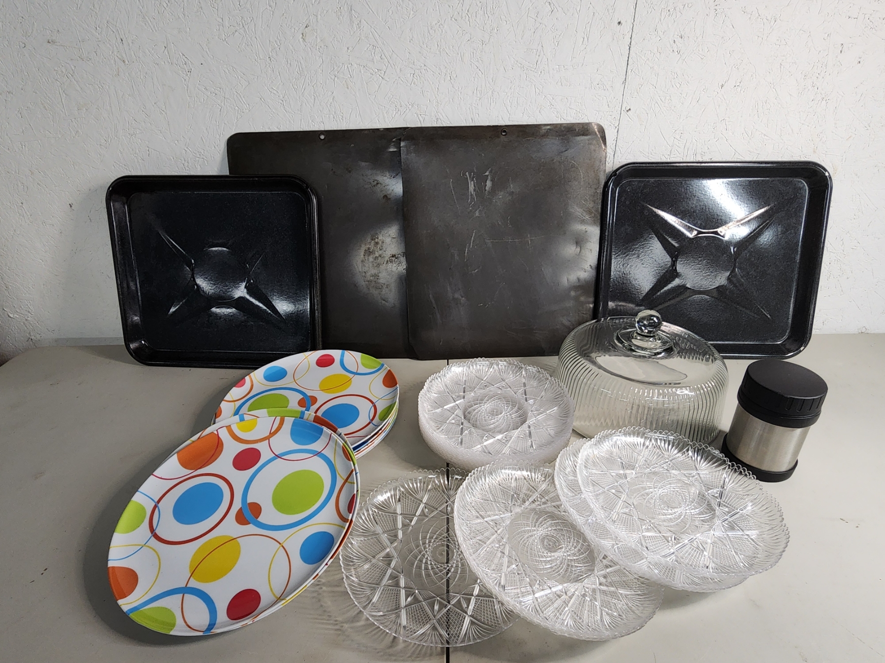 Lot of Kitchen Items: Baking Trays, Thermos, Plastic Plates, Glass Dome