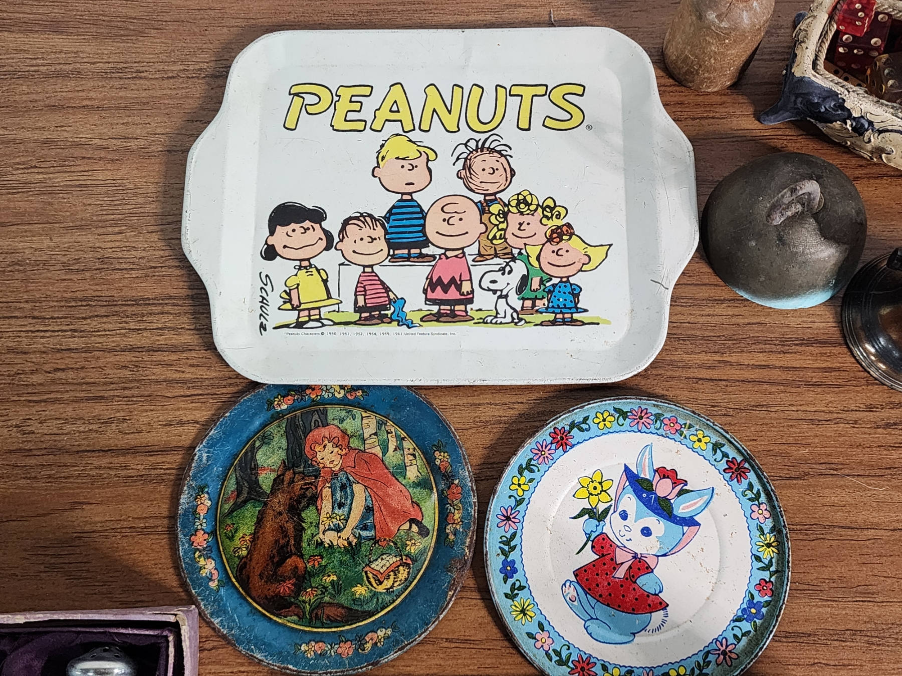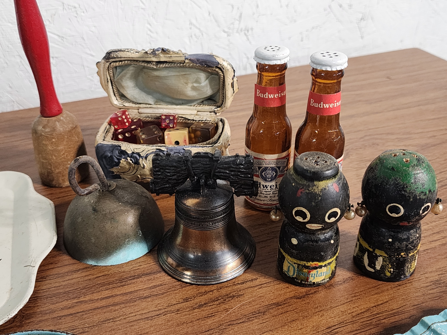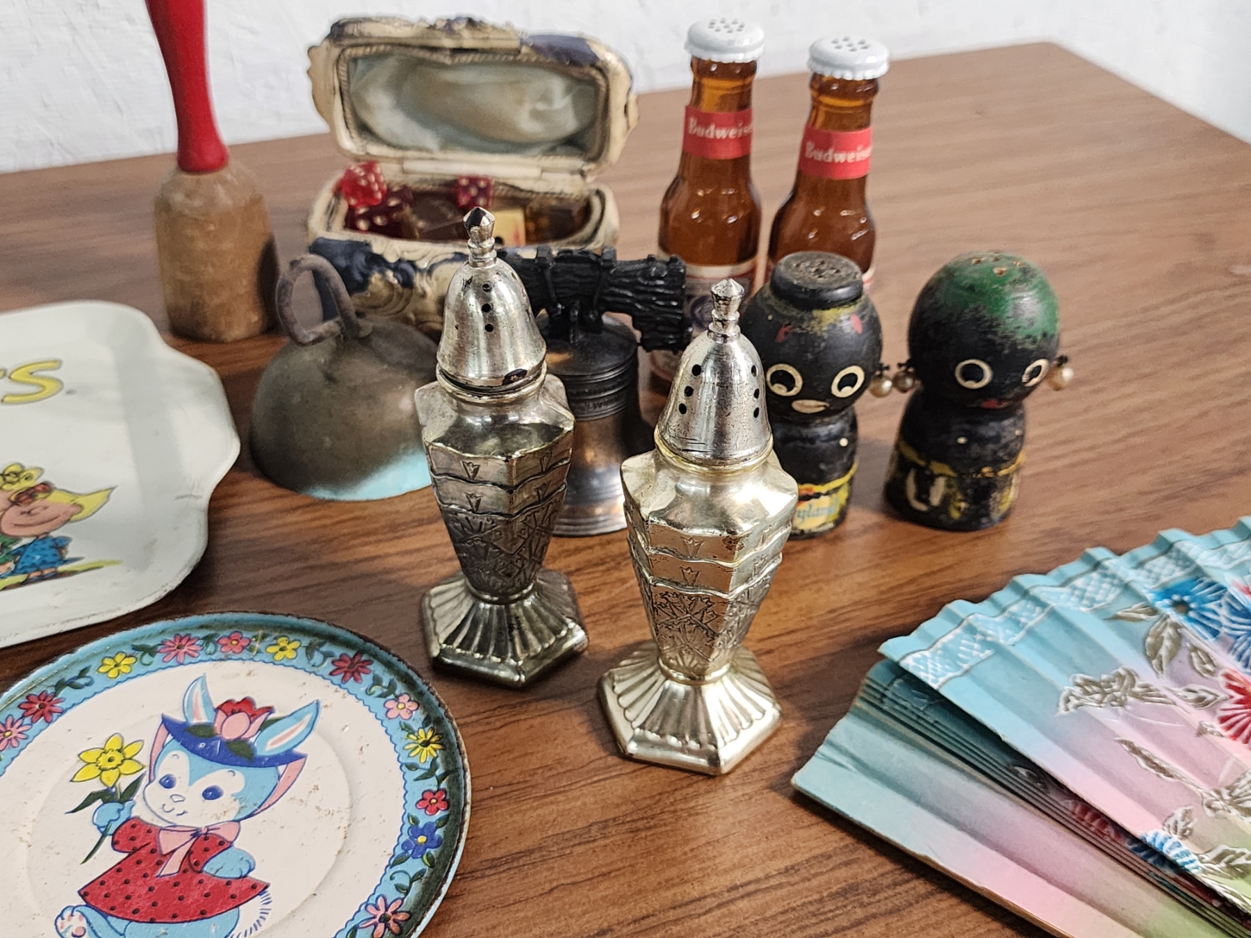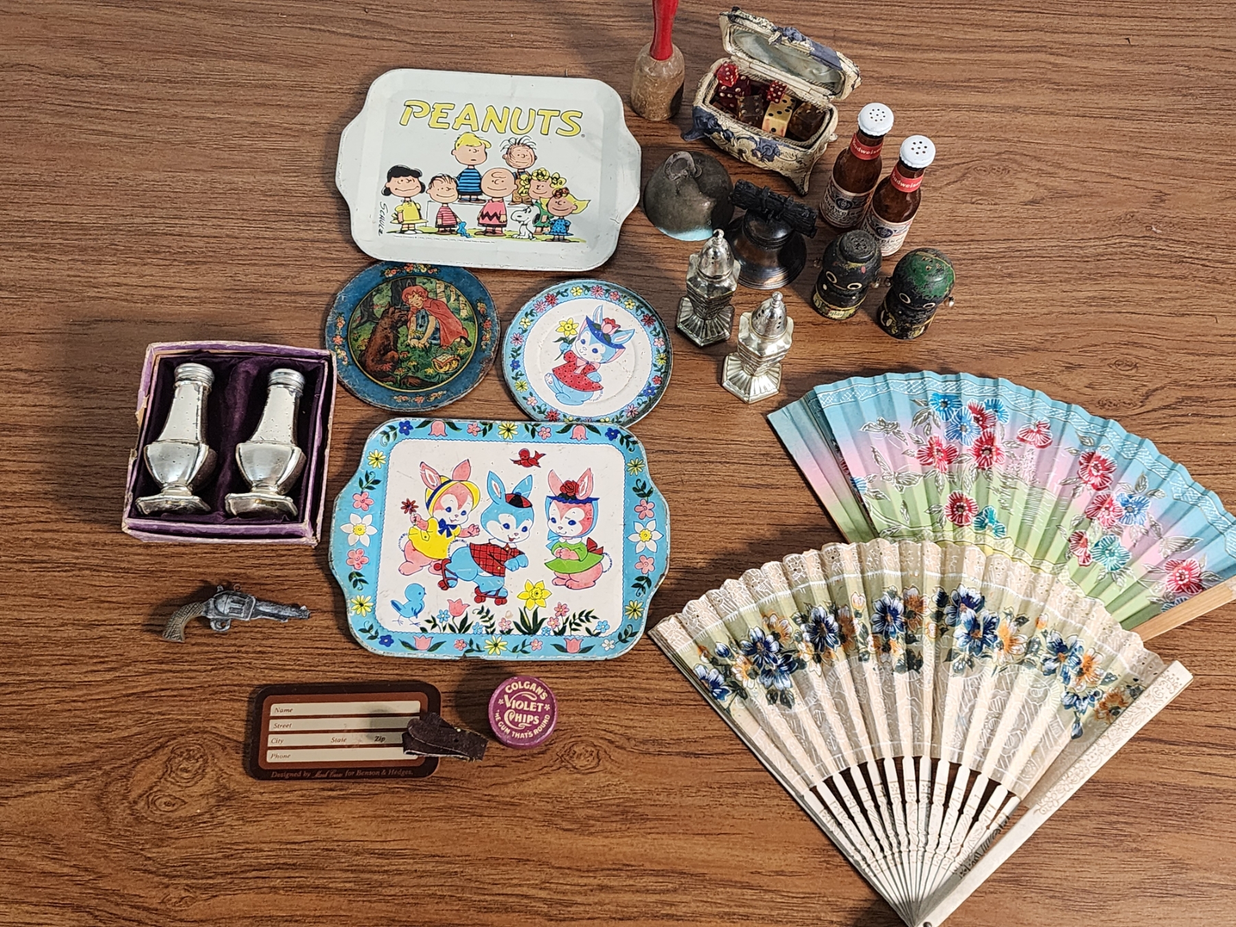 Lot of Vintage Collectibles Including Trays, S&P Shakers, Hand Fans, Dice, Bells