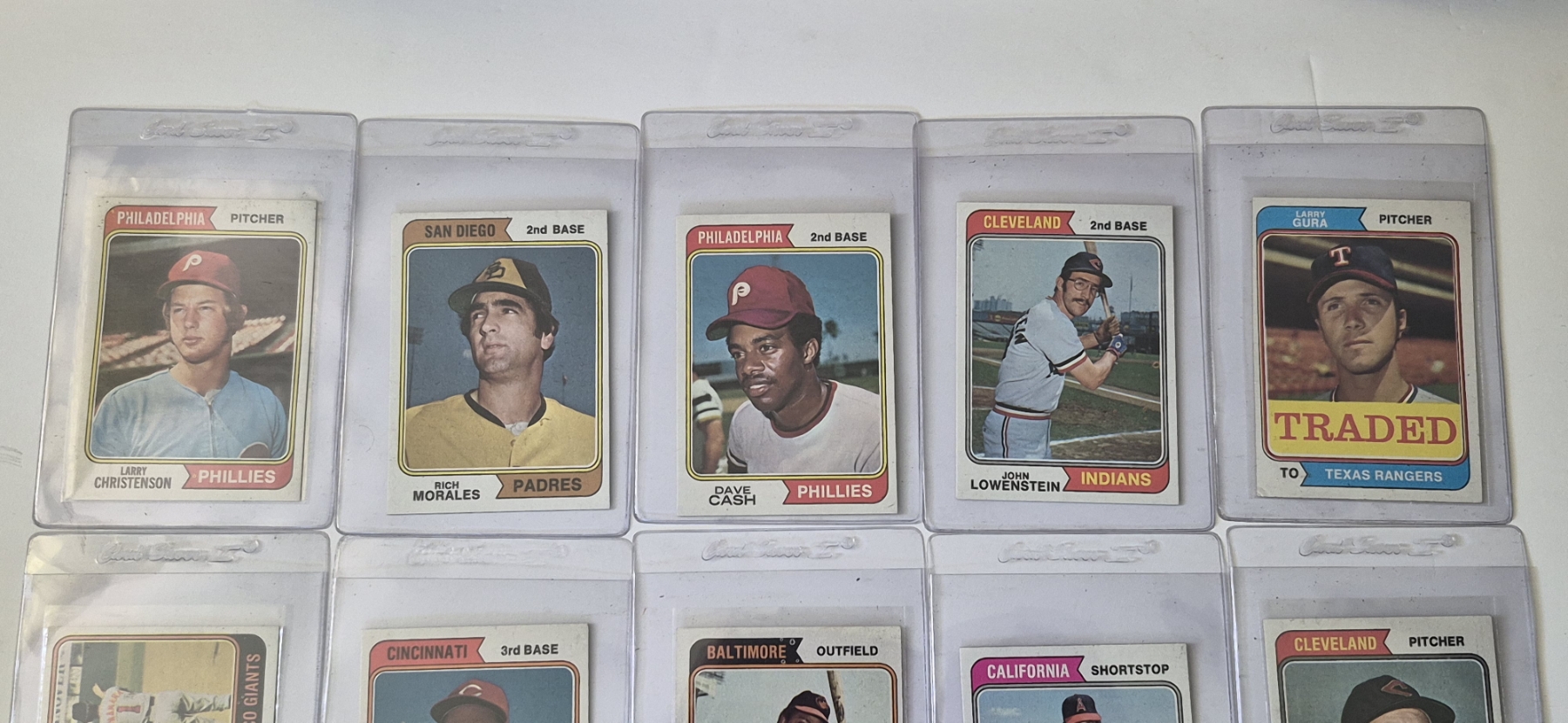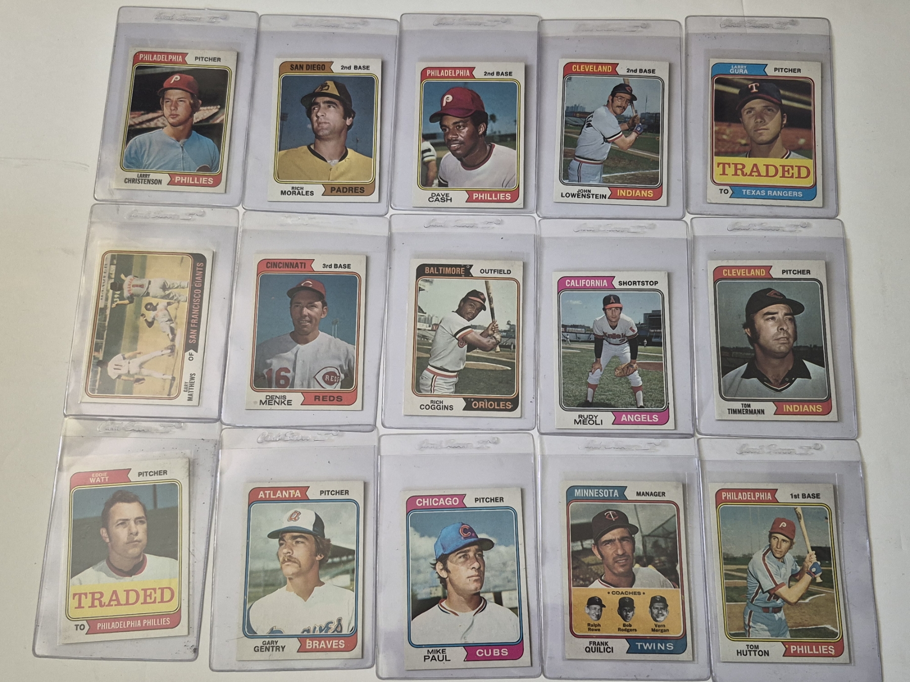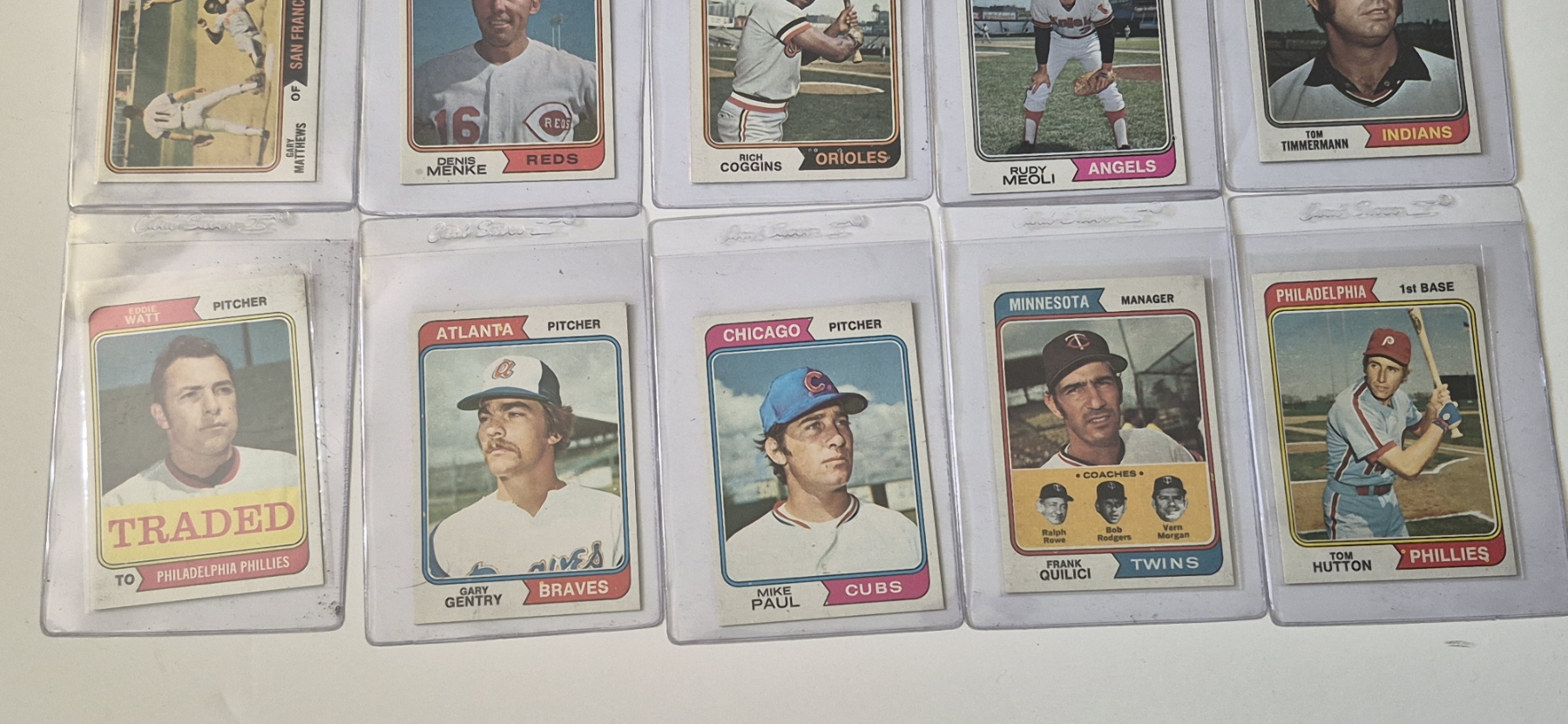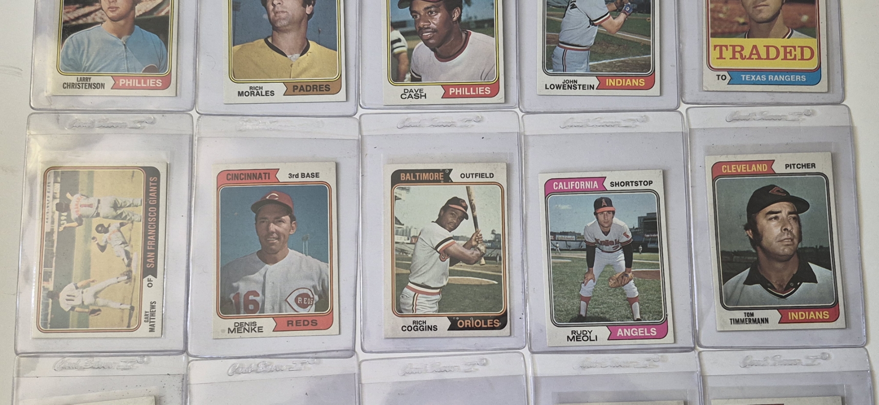 MINT 1974 TOPPS BASEBALL CARDS - 15 ASSORTED SLEEVED CARDS IN NEVER TOUCHED CONDITION - The cards seen in these photos are set break singles placed in sleeves and protectors fresh out of the wax packs. AND THEY ARE GEMS!