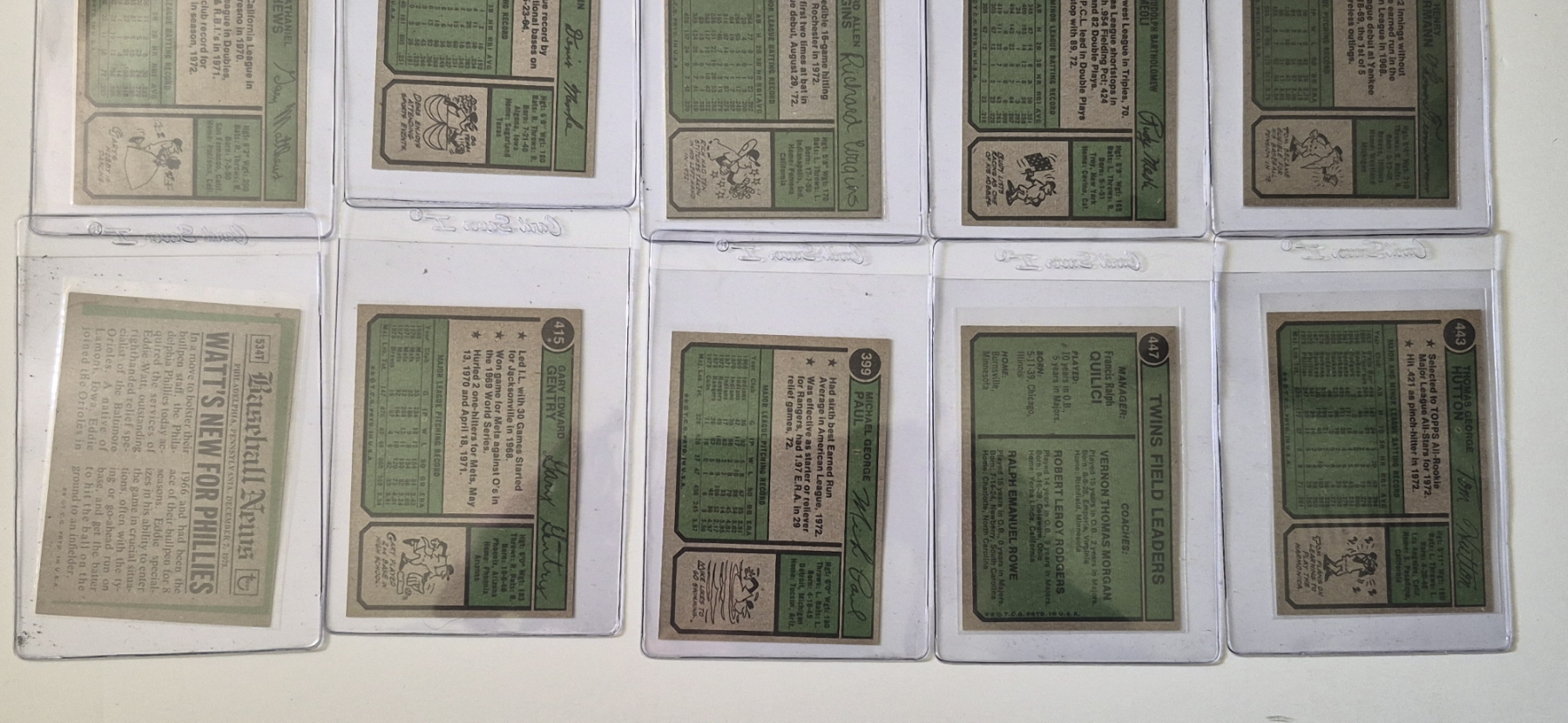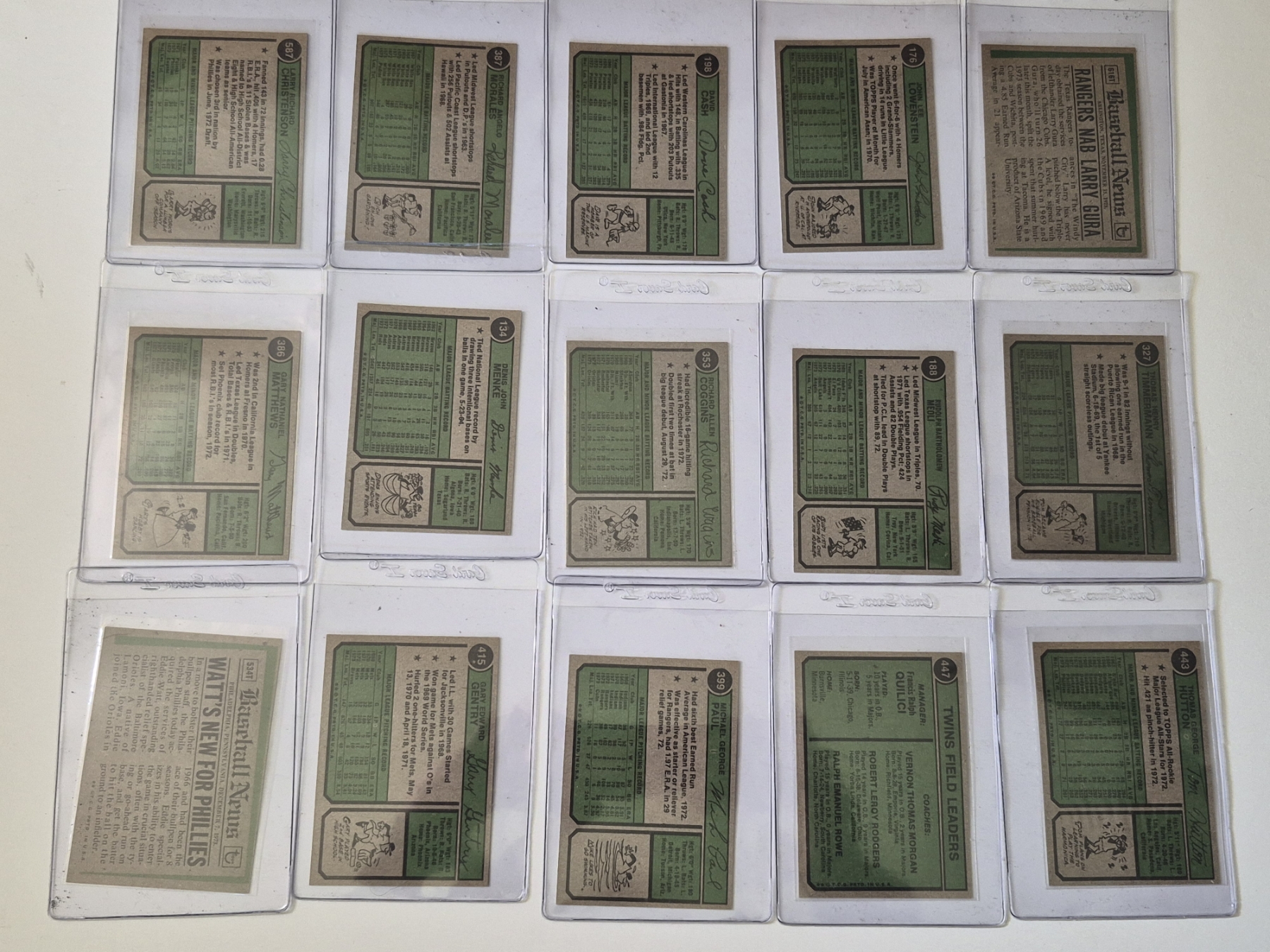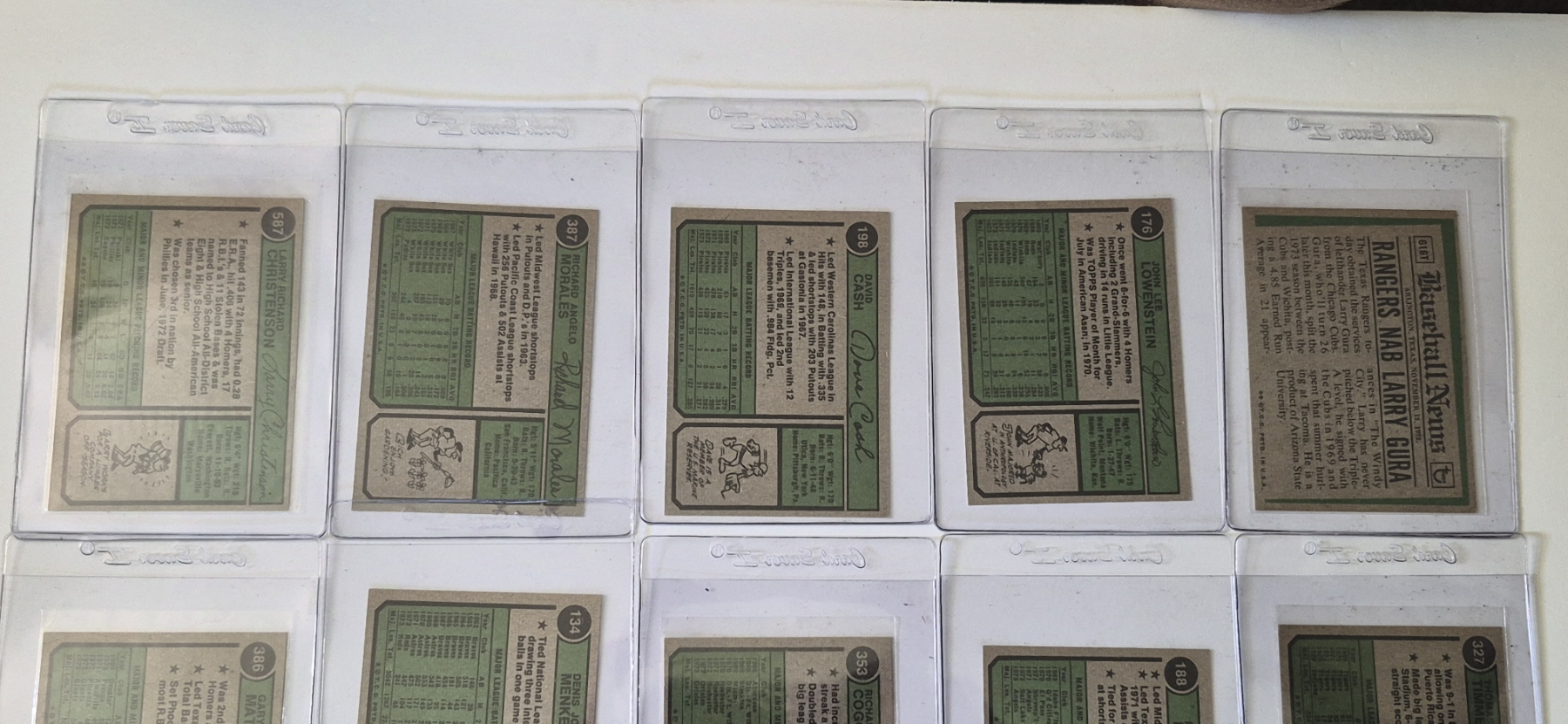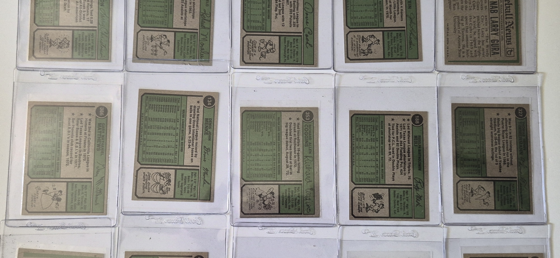 MINT 1974 TOPPS BASEBALL CARDS - 15 ASSORTED SLEEVED CARDS IN NEVER TOUCHED CONDITION - The cards seen in these photos are set break singles placed in sleeves and protectors fresh out of the wax packs. AND THEY ARE GEMS!