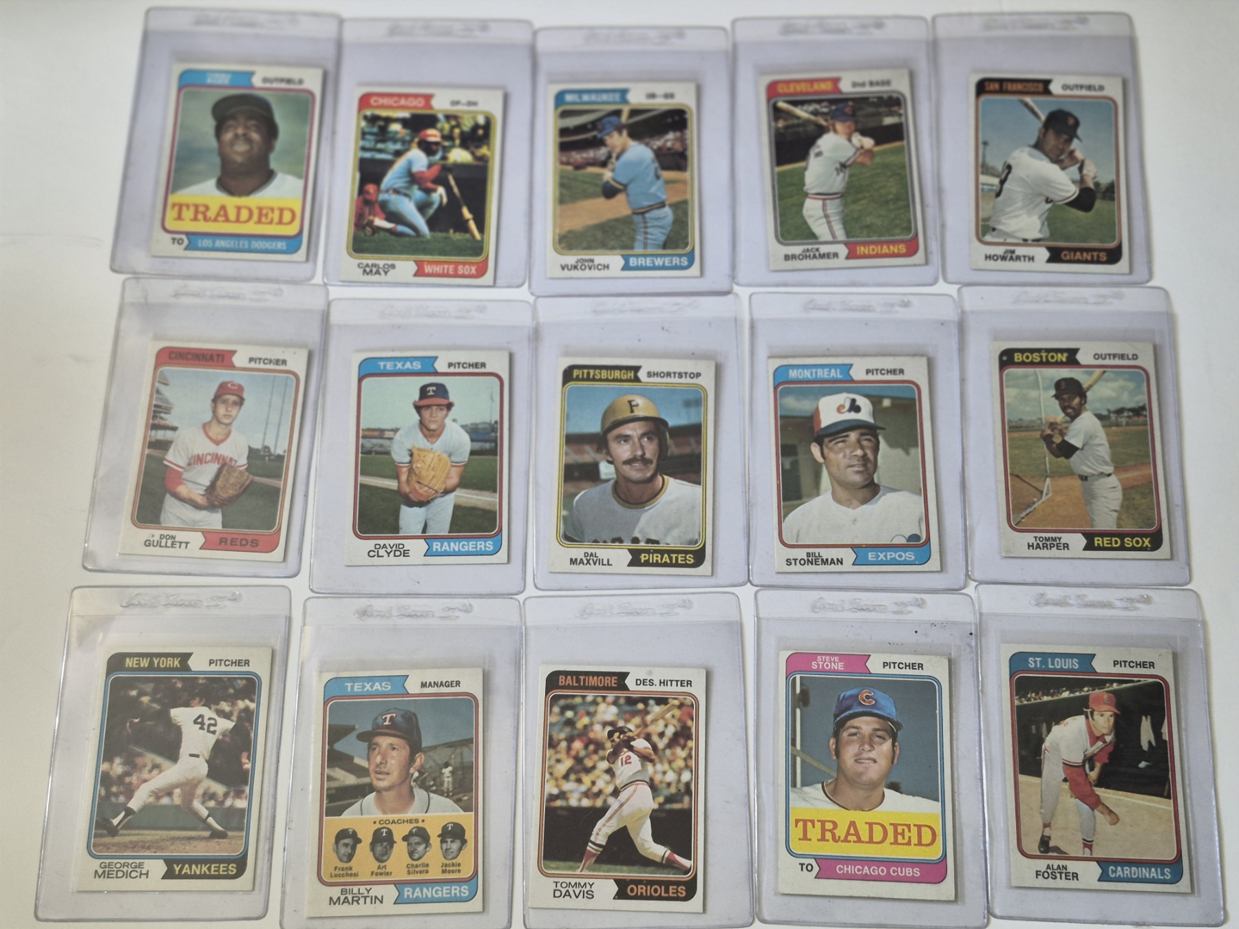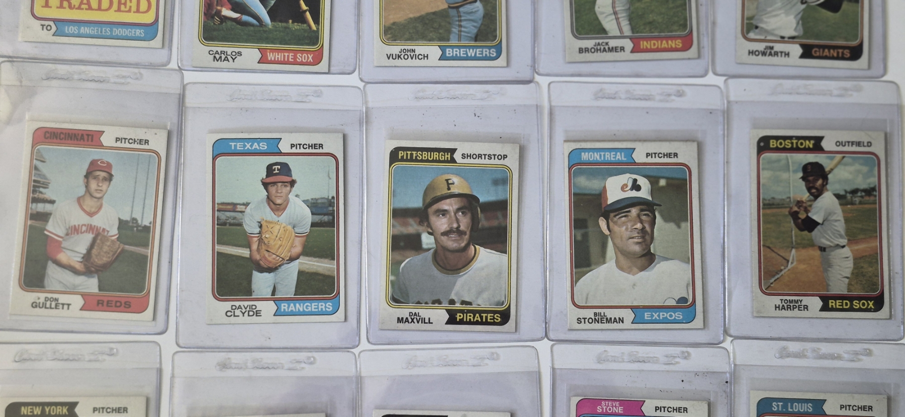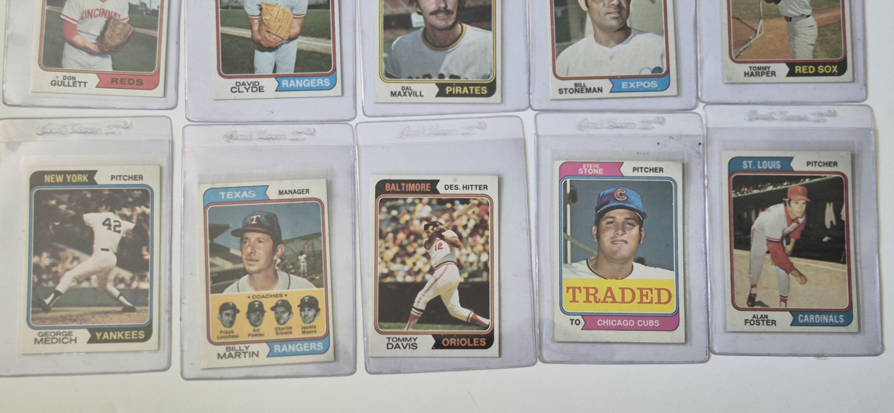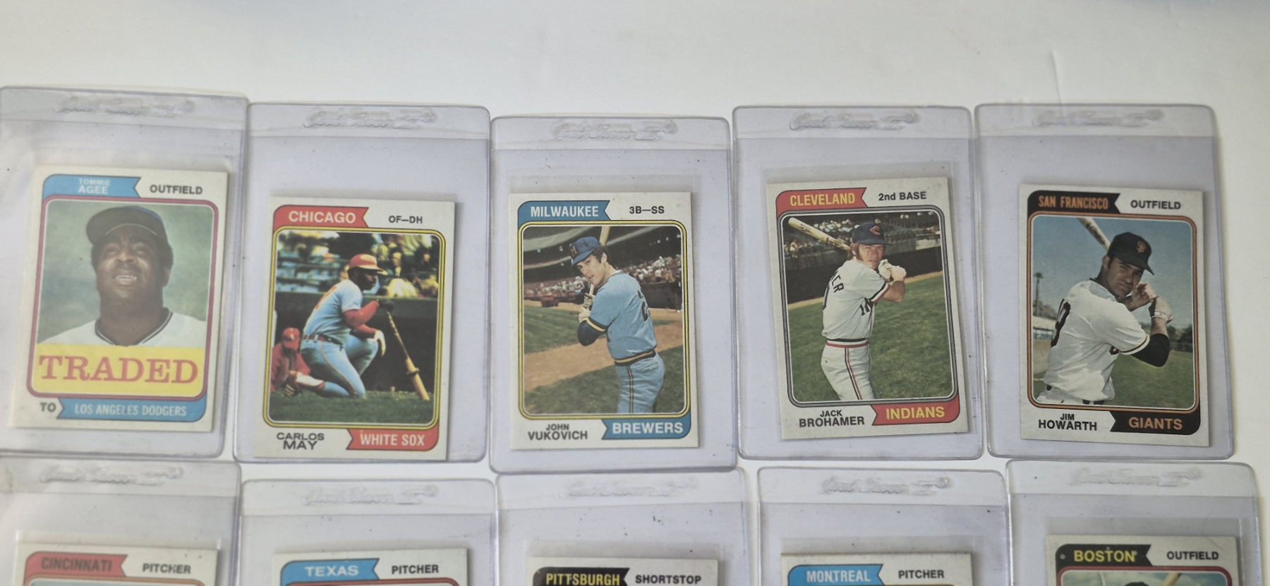 MINT 1974 TOPPS BASEBALL CARDS - 15 ASSORTED SLEEVED CARDS IN NEVER TOUCHED CONDITION - The cards seen in these photos are set break singles placed in sleeves and protectors fresh out of the wax packs. AND THEY ARE GEMS!