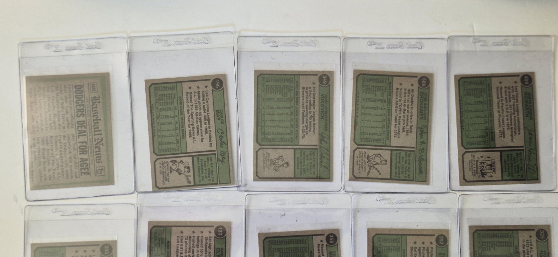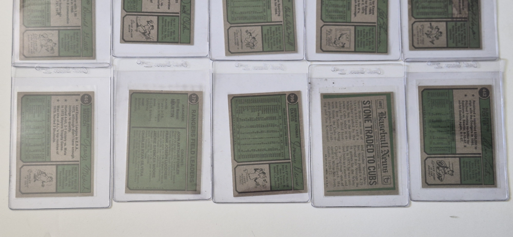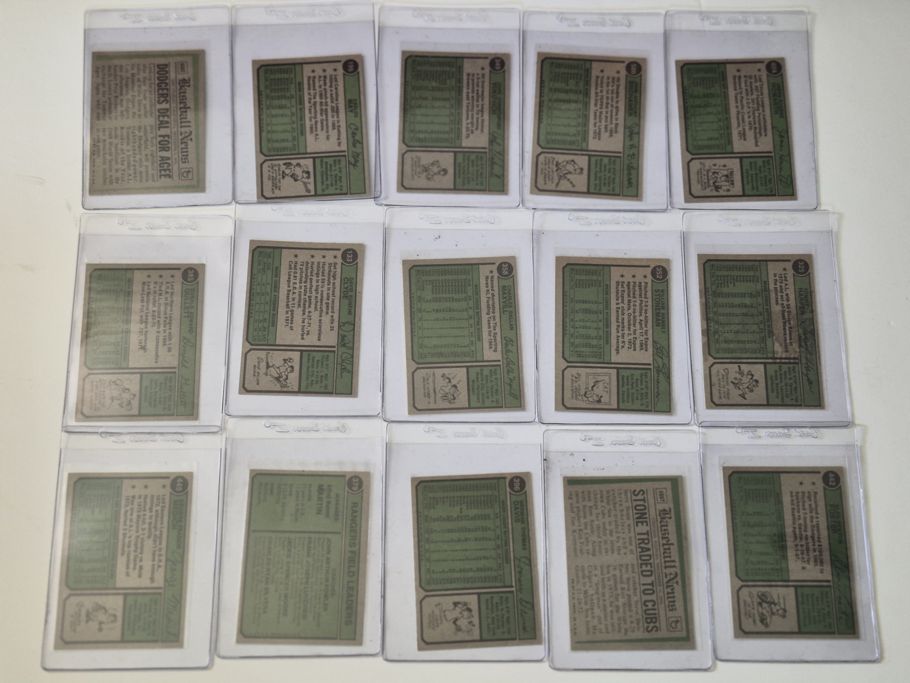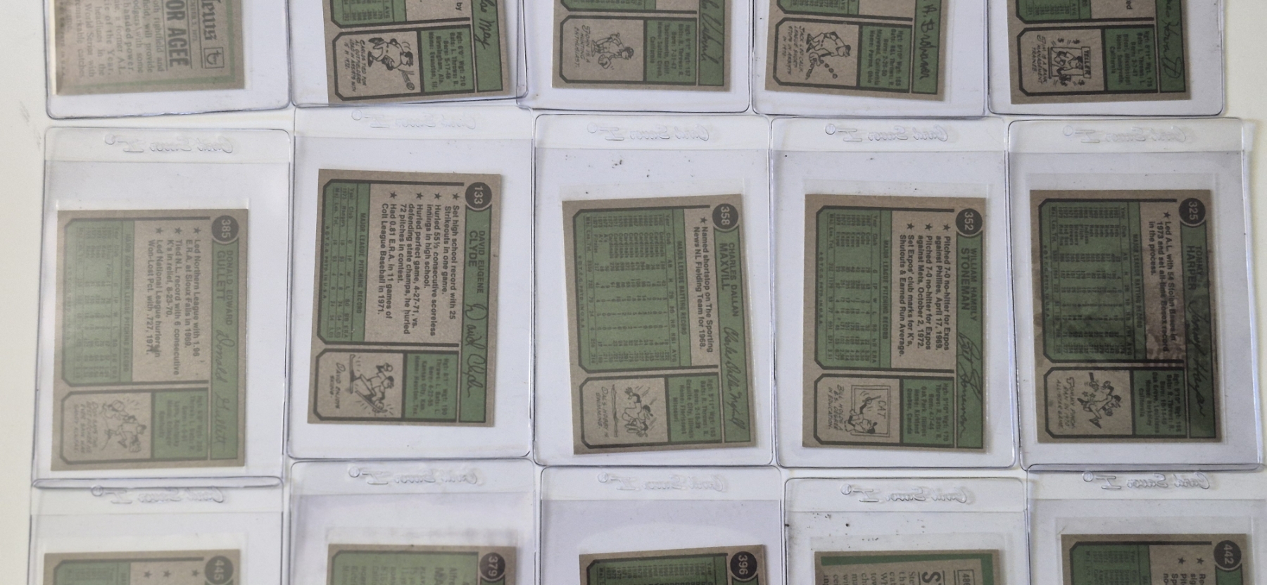 MINT 1974 TOPPS BASEBALL CARDS - 15 ASSORTED SLEEVED CARDS IN NEVER TOUCHED CONDITION - The cards seen in these photos are set break singles placed in sleeves and protectors fresh out of the wax packs. AND THEY ARE GEMS!