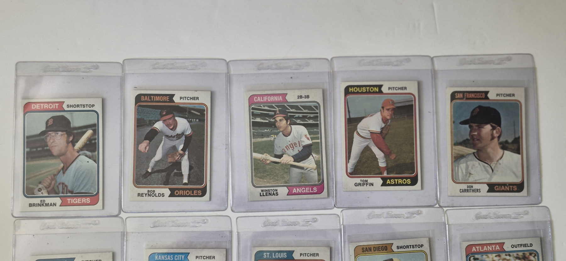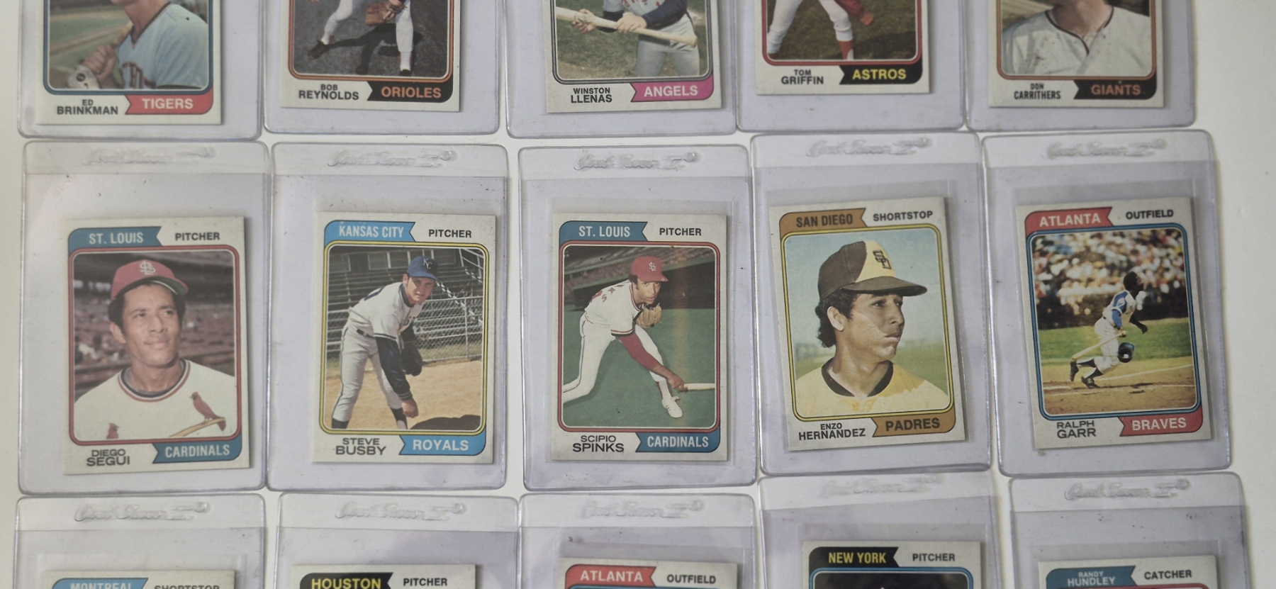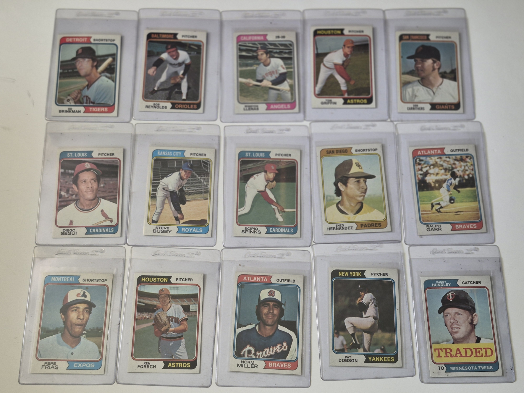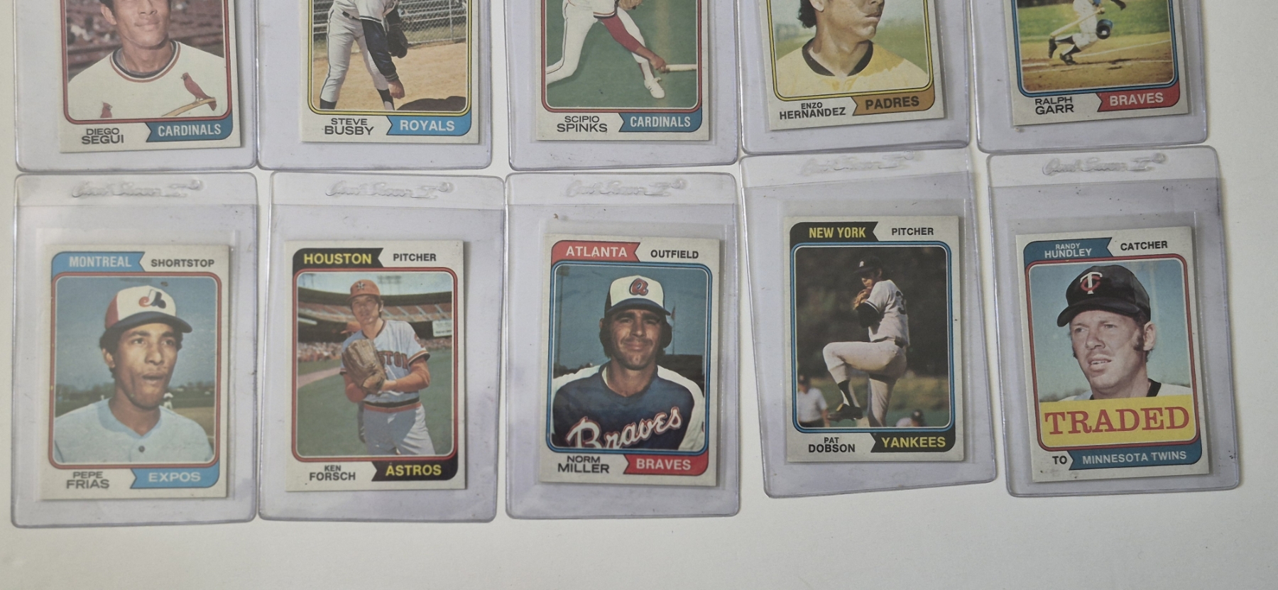 MINT 1974 TOPPS BASEBALL CARDS - 15 ASSORTED SLEEVED CARDS IN NEVER TOUCHED CONDITION - The cards seen in these photos are set break singles placed in sleeves and protectors fresh out of the wax packs. AND THEY ARE GEMS!