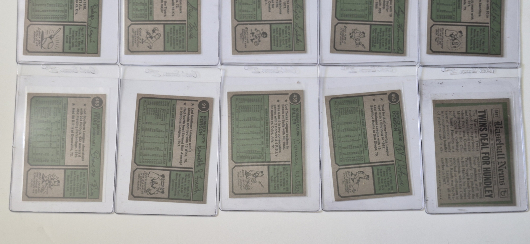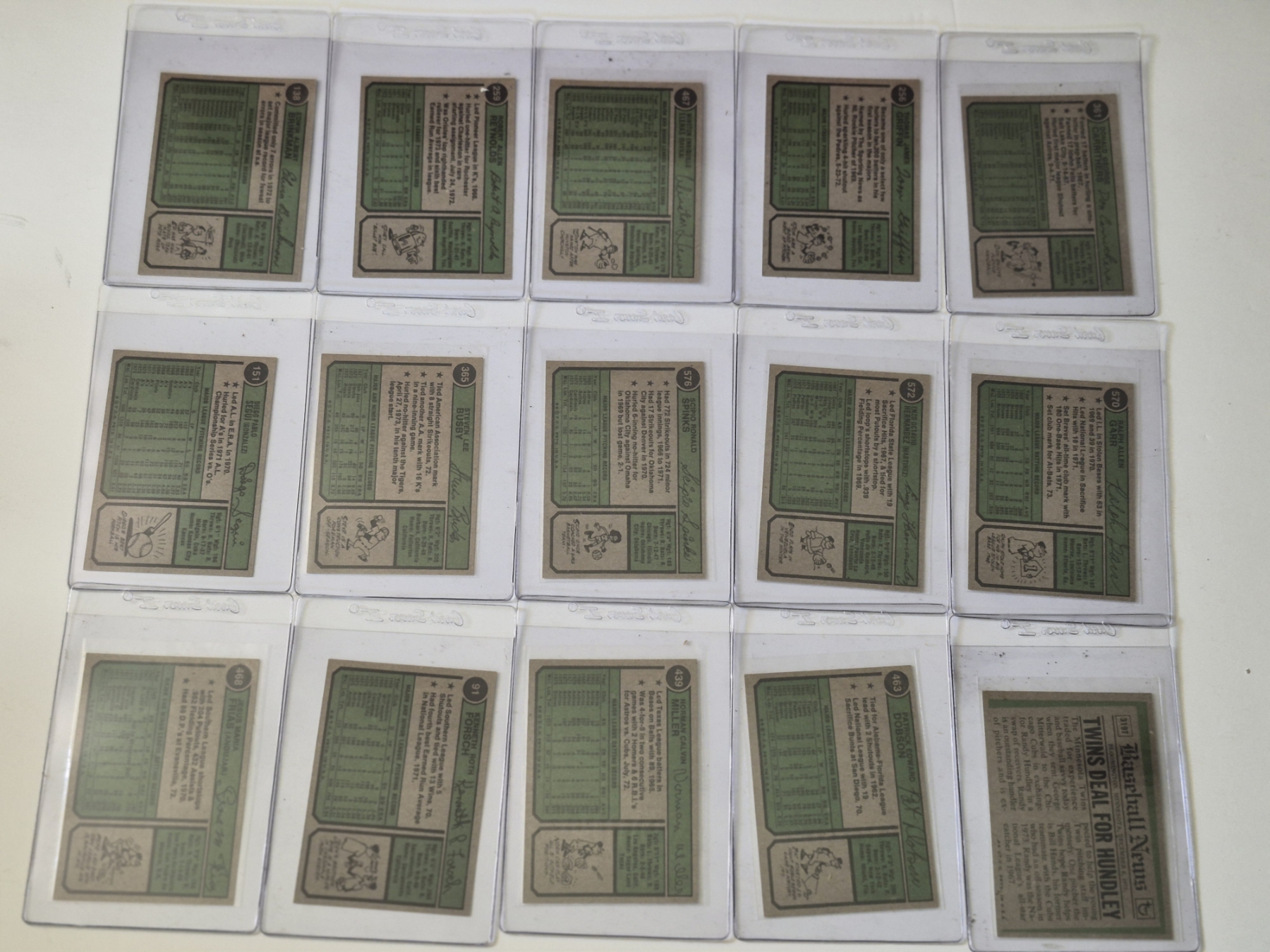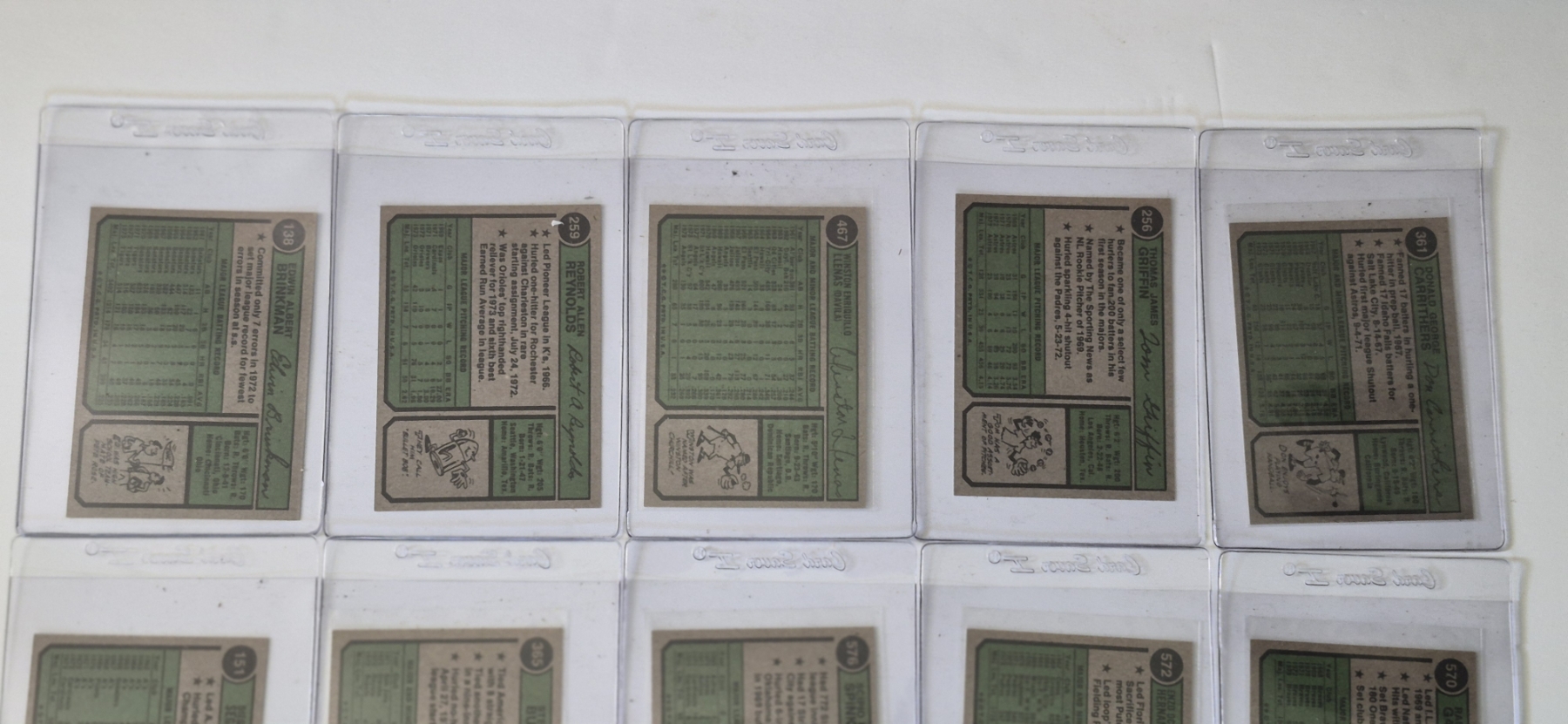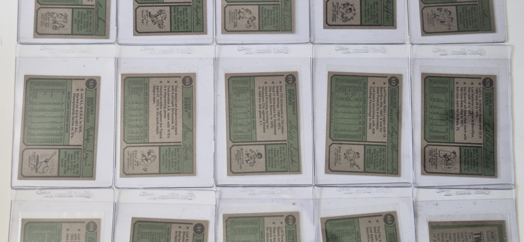 MINT 1974 TOPPS BASEBALL CARDS - 15 ASSORTED SLEEVED CARDS IN NEVER TOUCHED CONDITION - The cards seen in these photos are set break singles placed in sleeves and protectors fresh out of the wax packs. AND THEY ARE GEMS!