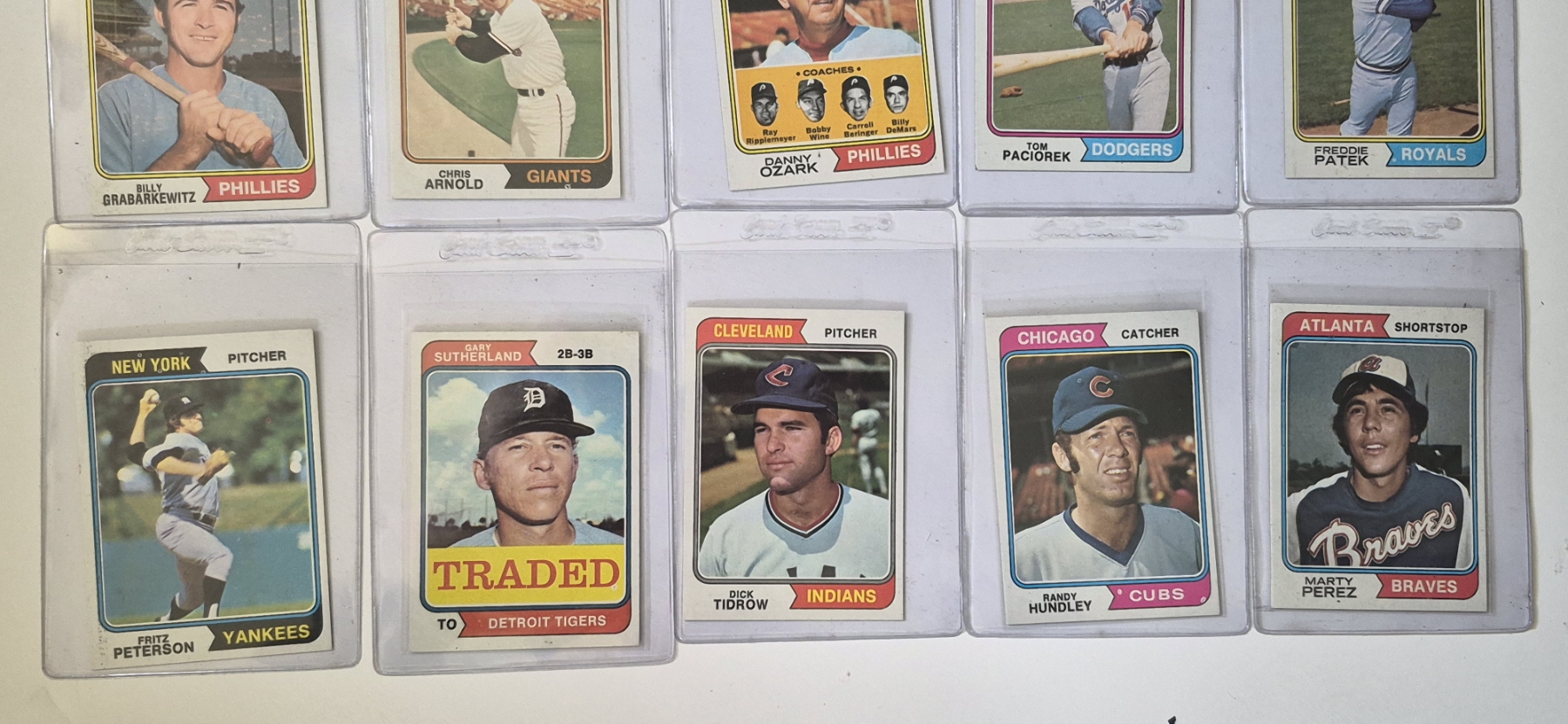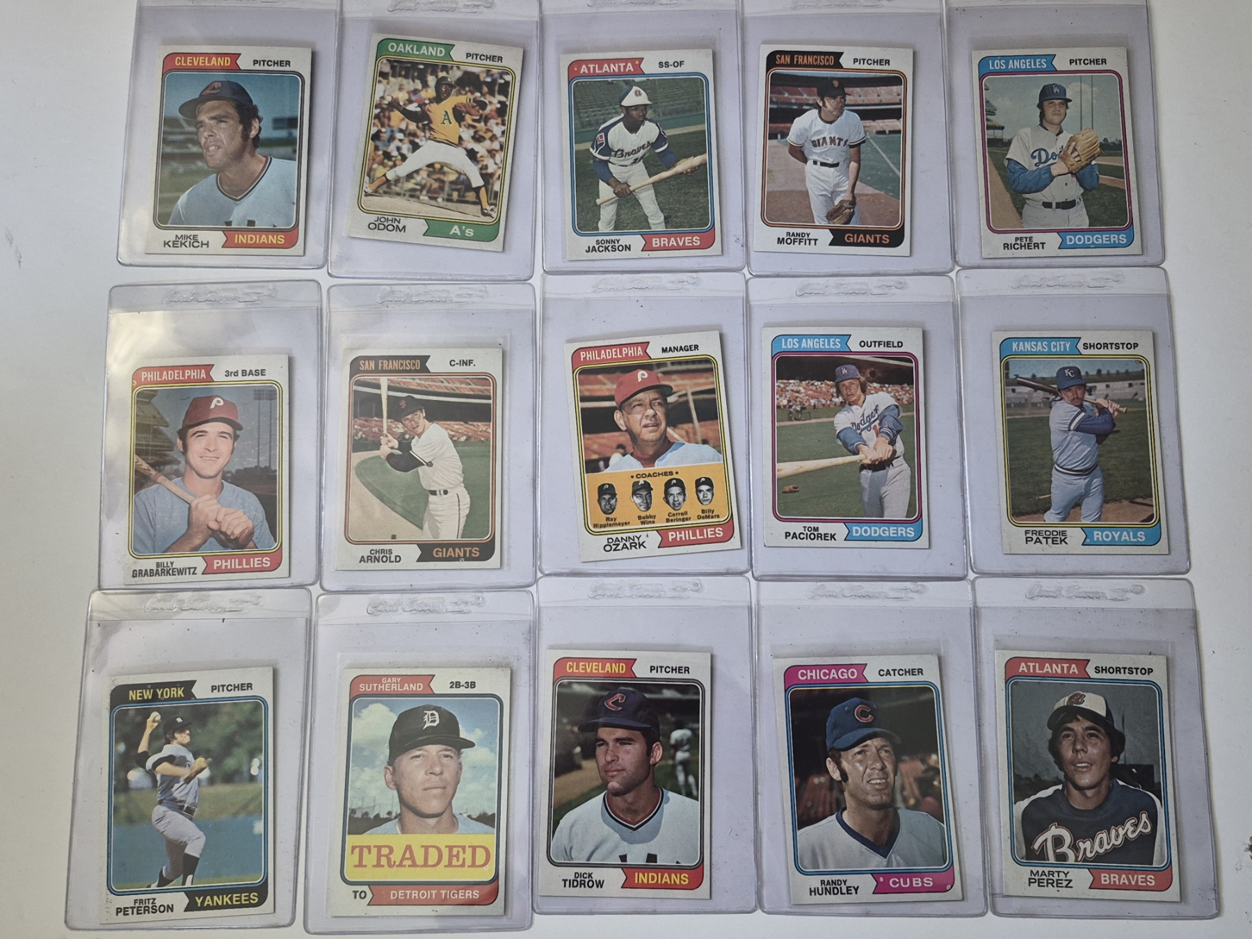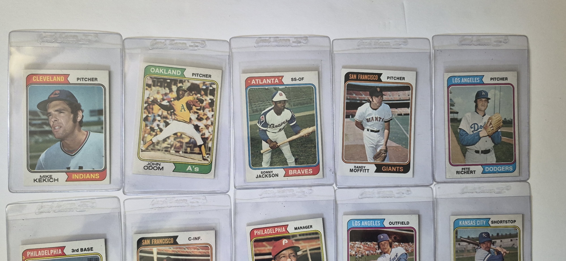 MINT 1974 TOPPS BASEBALL CARDS - 15 ASSORTED SLEEVED CARDS IN NEVER TOUCHED CONDITION - The cards seen in these photos are set break singles placed in sleeves and protectors fresh out of the wax packs. AND THEY ARE GEMS!