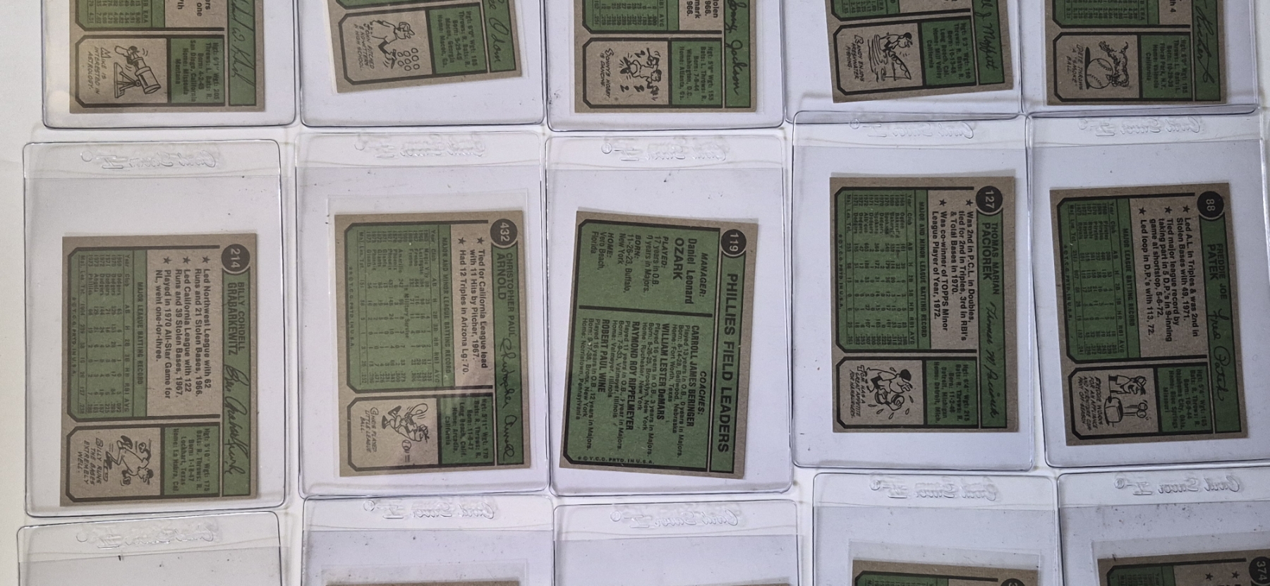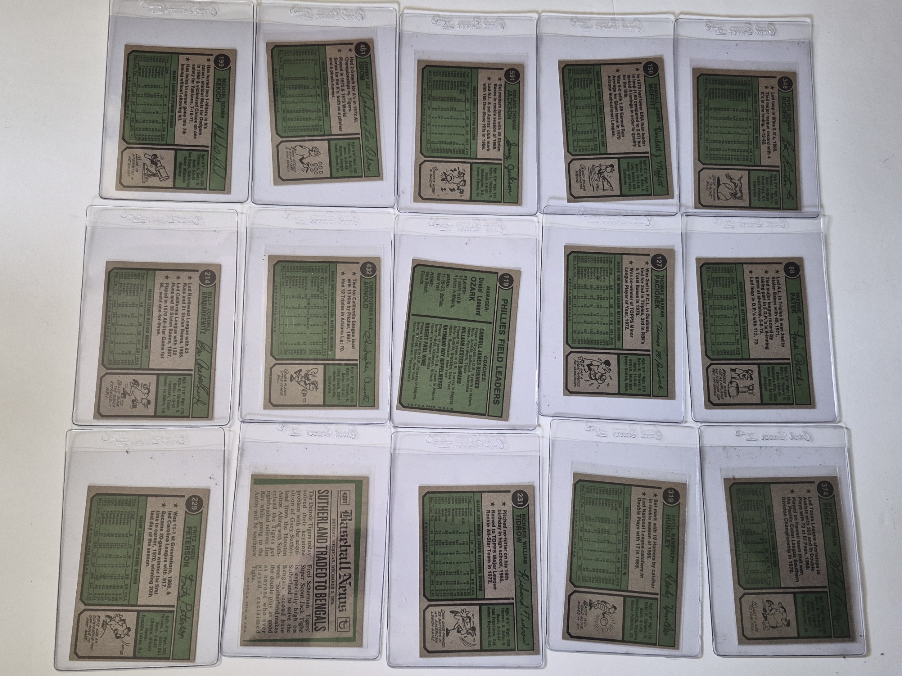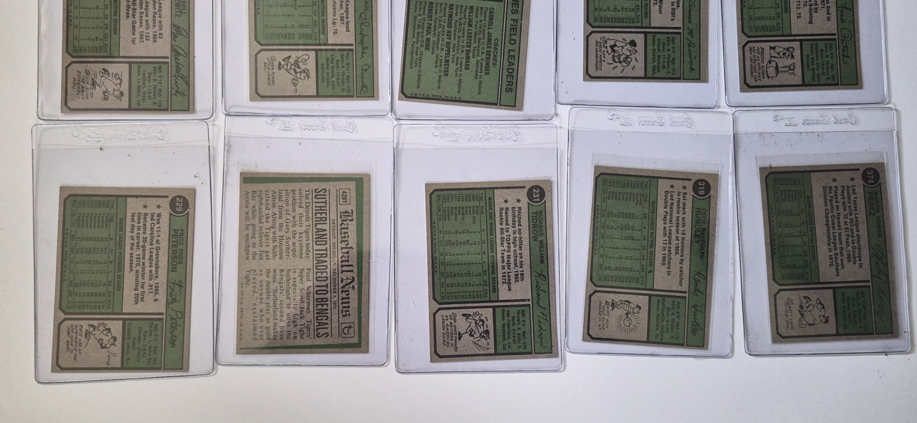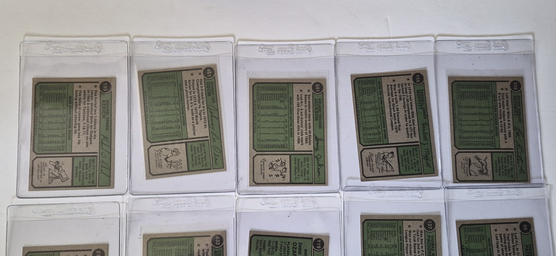 MINT 1974 TOPPS BASEBALL CARDS - 15 ASSORTED SLEEVED CARDS IN NEVER TOUCHED CONDITION - The cards seen in these photos are set break singles placed in sleeves and protectors fresh out of the wax packs. AND THEY ARE GEMS!