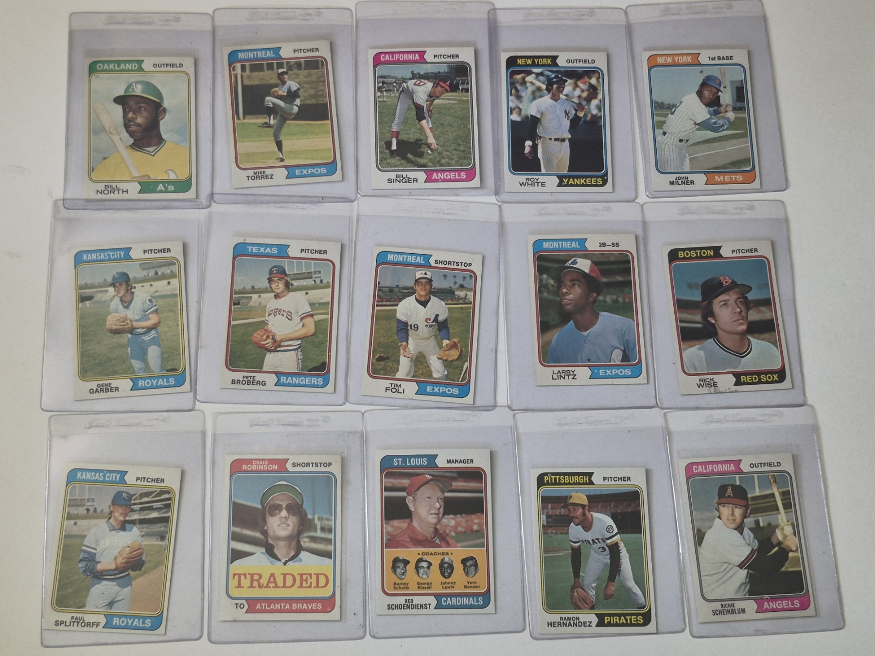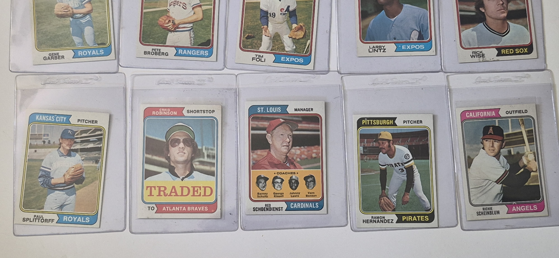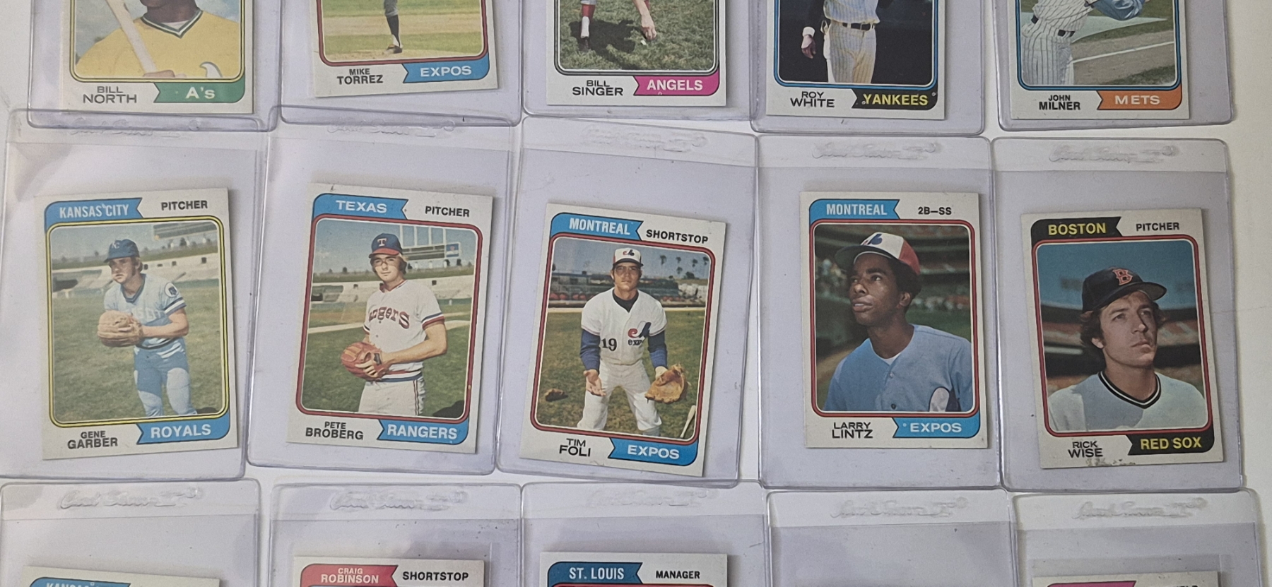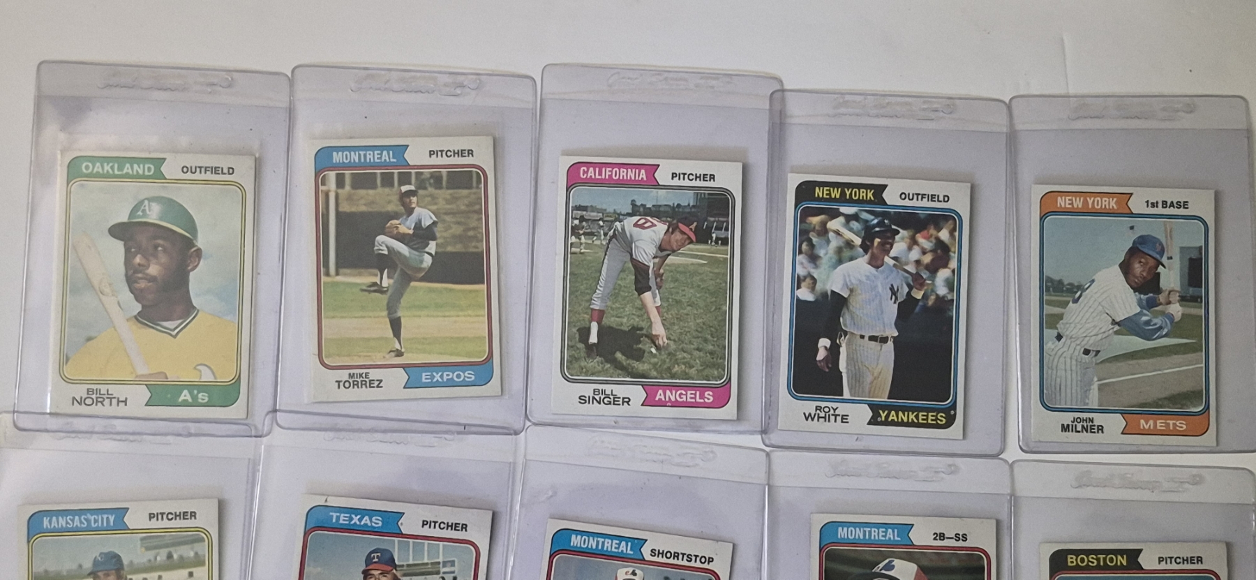 MINT 1974 TOPPS BASEBALL CARDS - 15 ASSORTED SLEEVED CARDS IN NEVER TOUCHED CONDITION - The cards seen in these photos are set break singles placed in sleeves and protectors fresh out of the wax packs. AND THEY ARE GEMS!