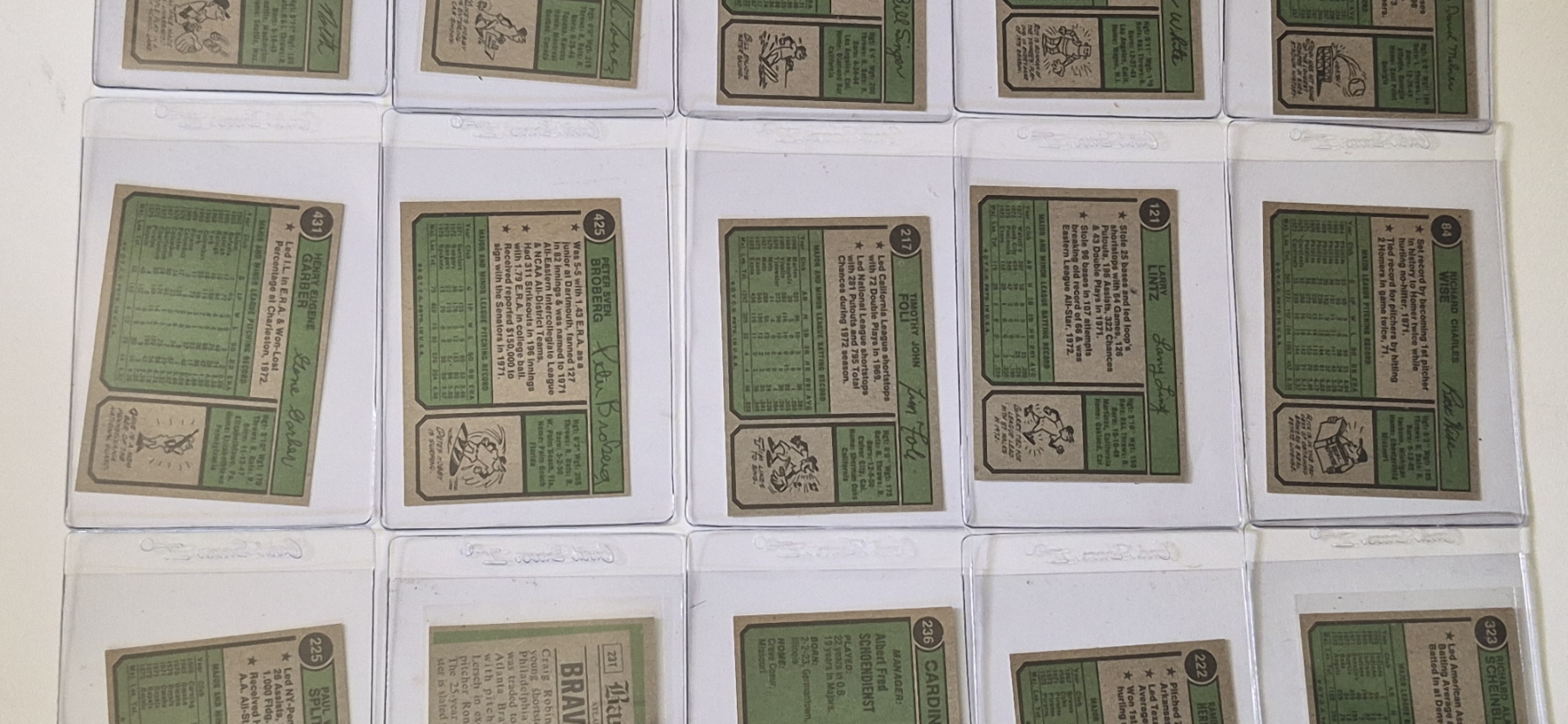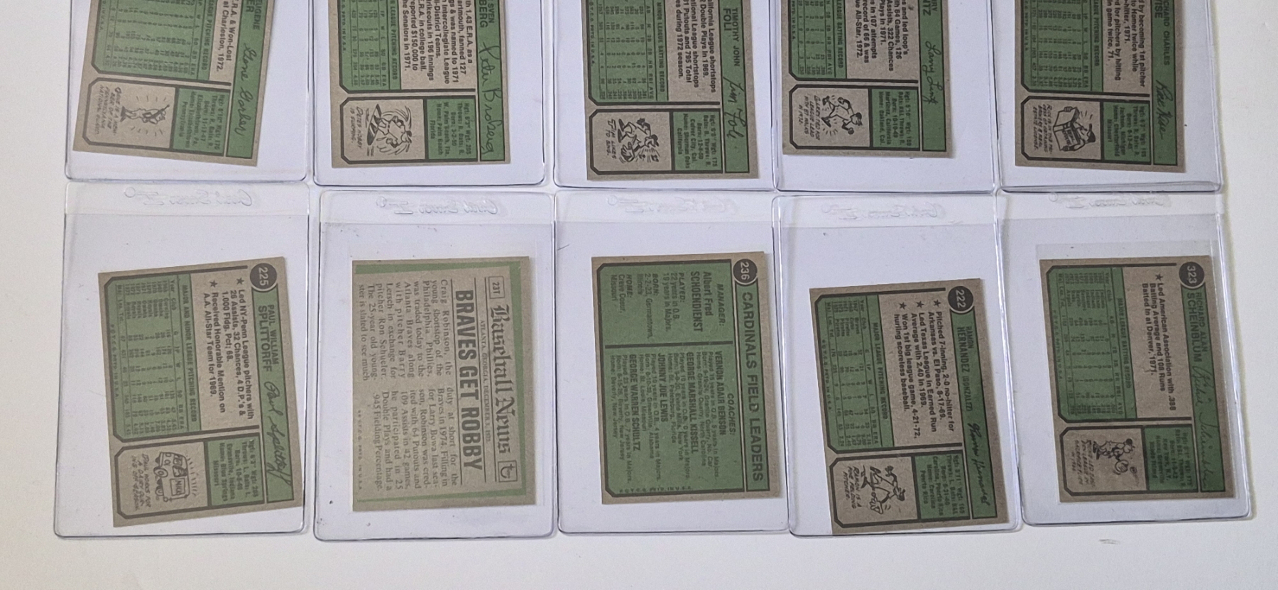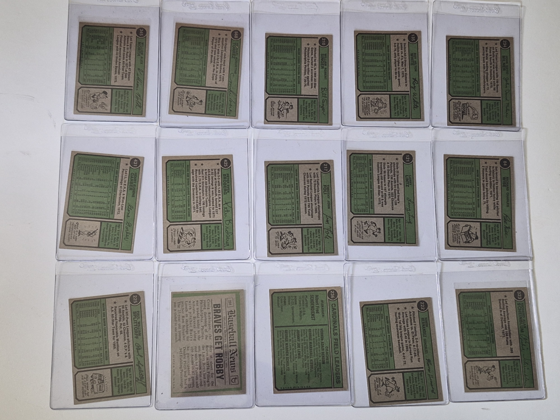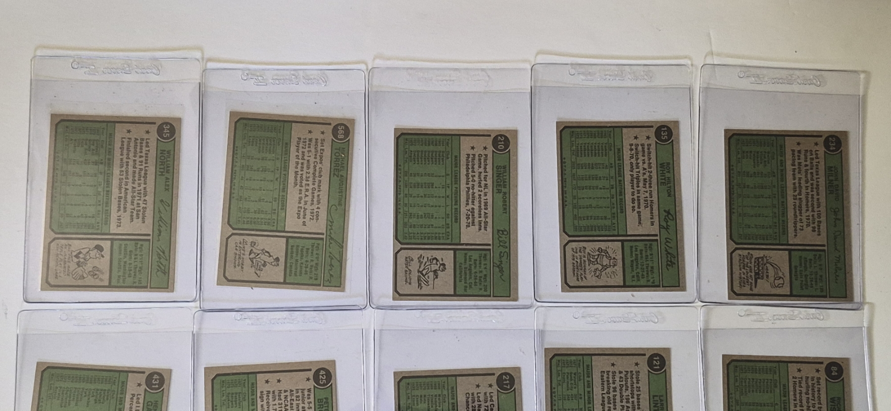MINT 1974 TOPPS BASEBALL CARDS - 15 ASSORTED SLEEVED CARDS IN NEVER TOUCHED CONDITION - The cards seen in these photos are set break singles placed in sleeves and protectors fresh out of the wax packs. AND THEY ARE GEMS!