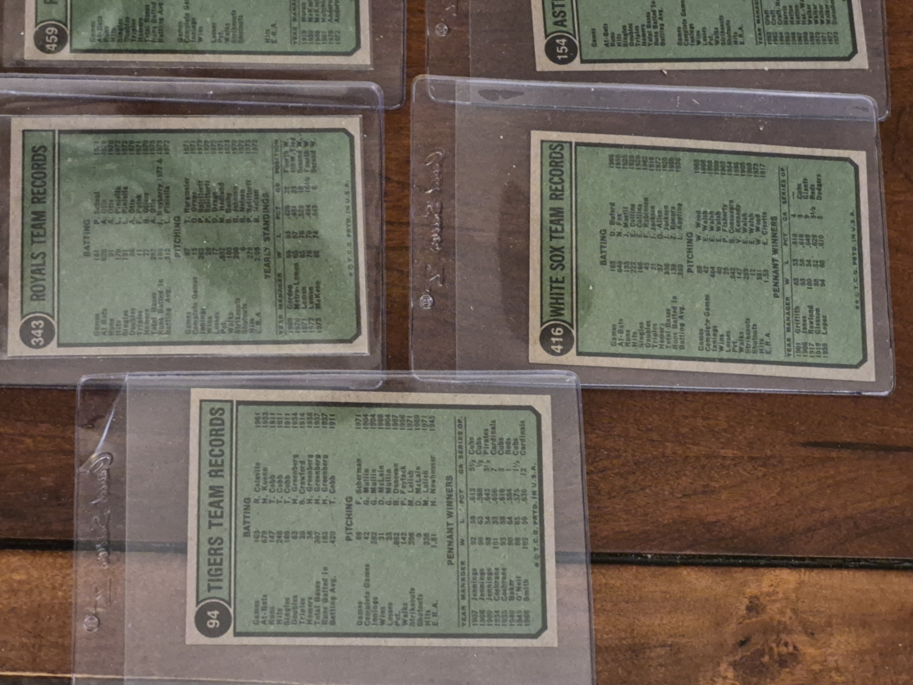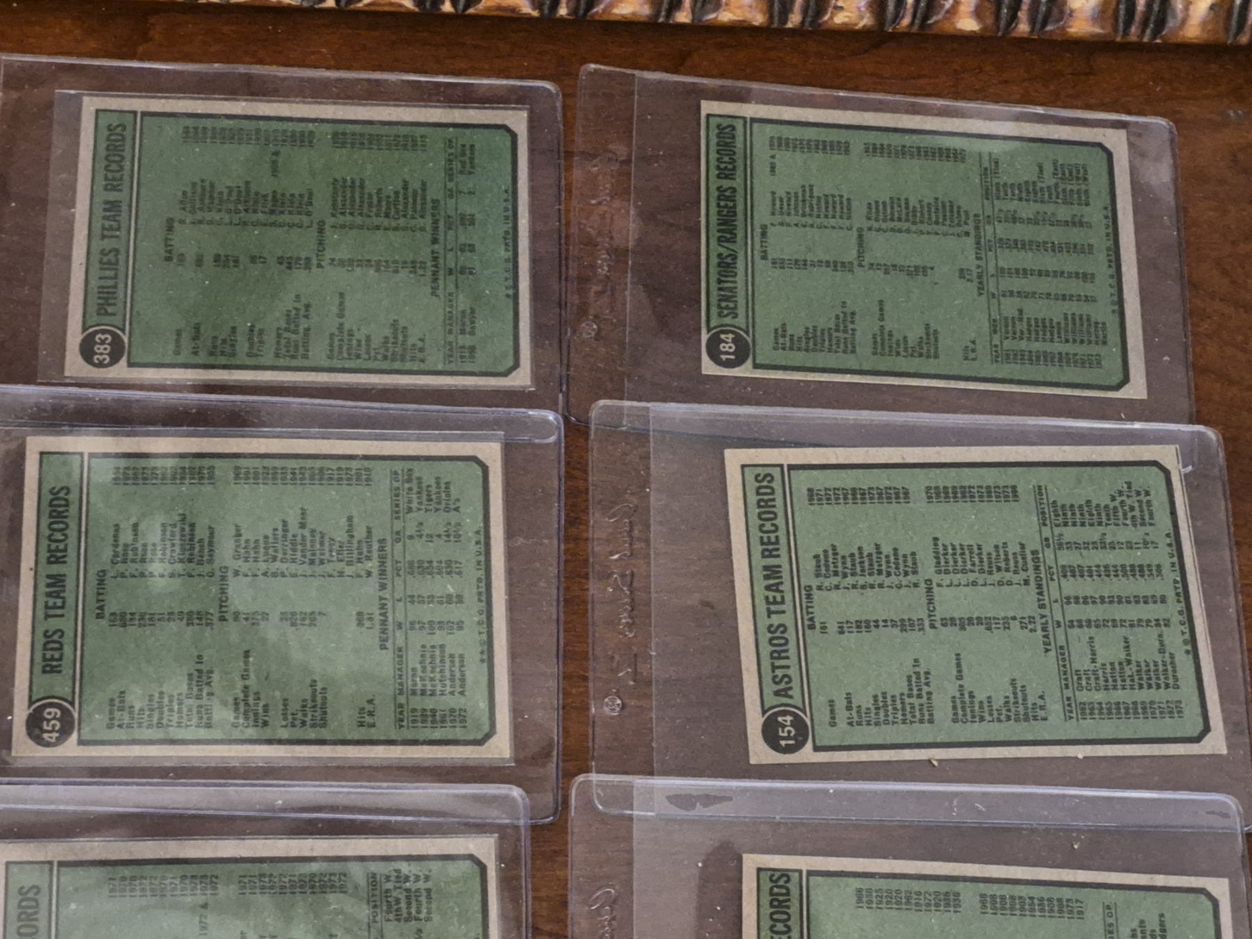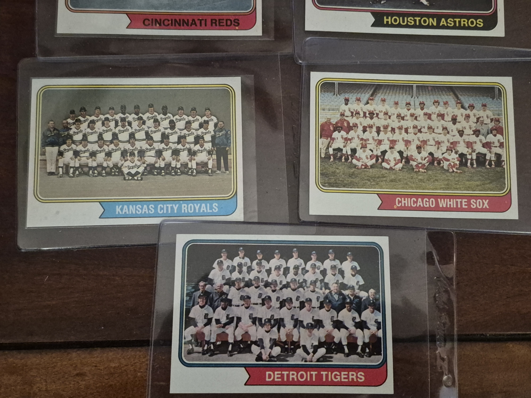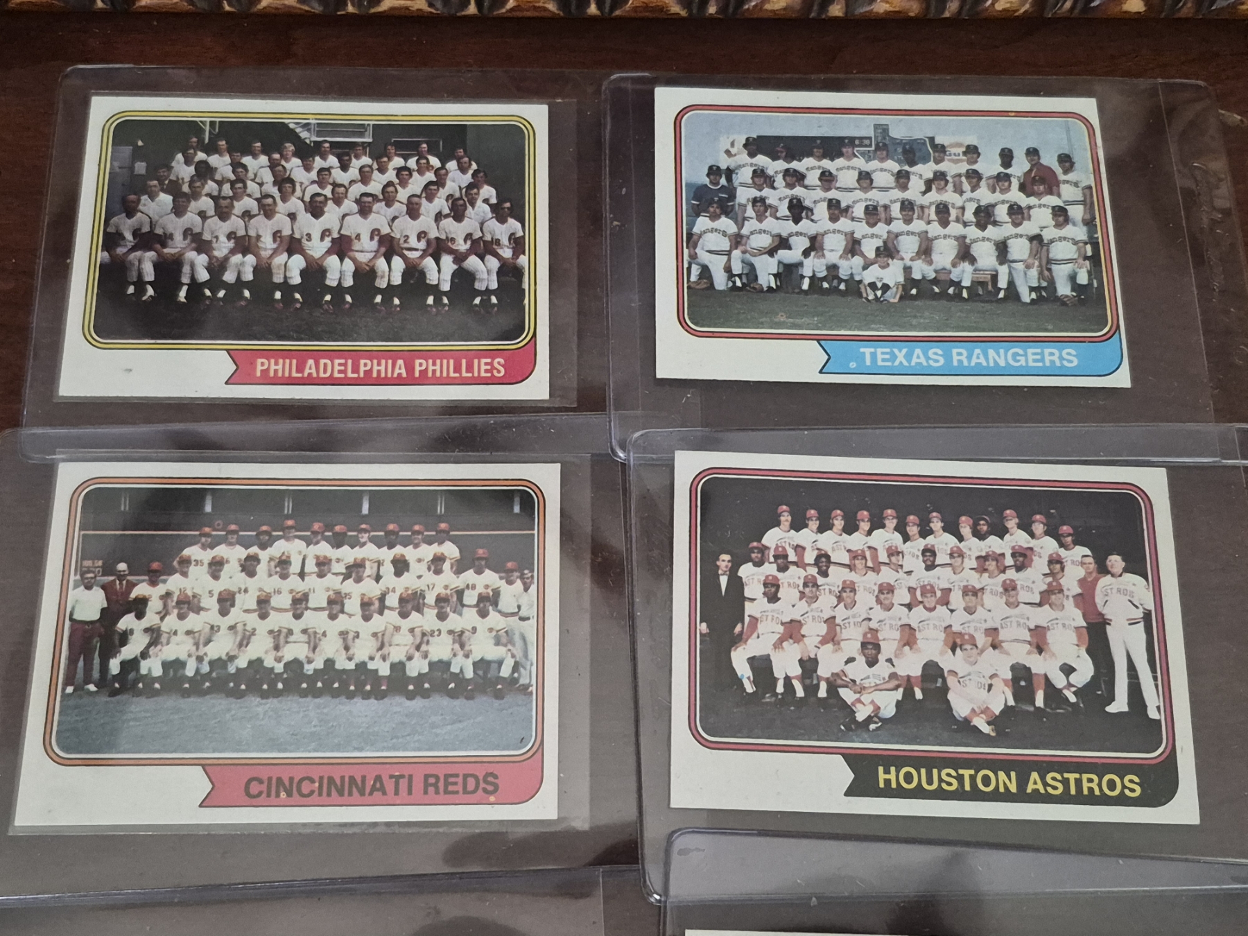 MINT 1974 TOPPS BASEBALL CARDS - 7 ASSORTED SLEEVED TEAM CARDS IN NEVER TOUCHED CONDITION - The cards seen in these photos are set break singles placed in sleeves and protectors fresh out of the wax packs. AND THEY ARE GEMS!