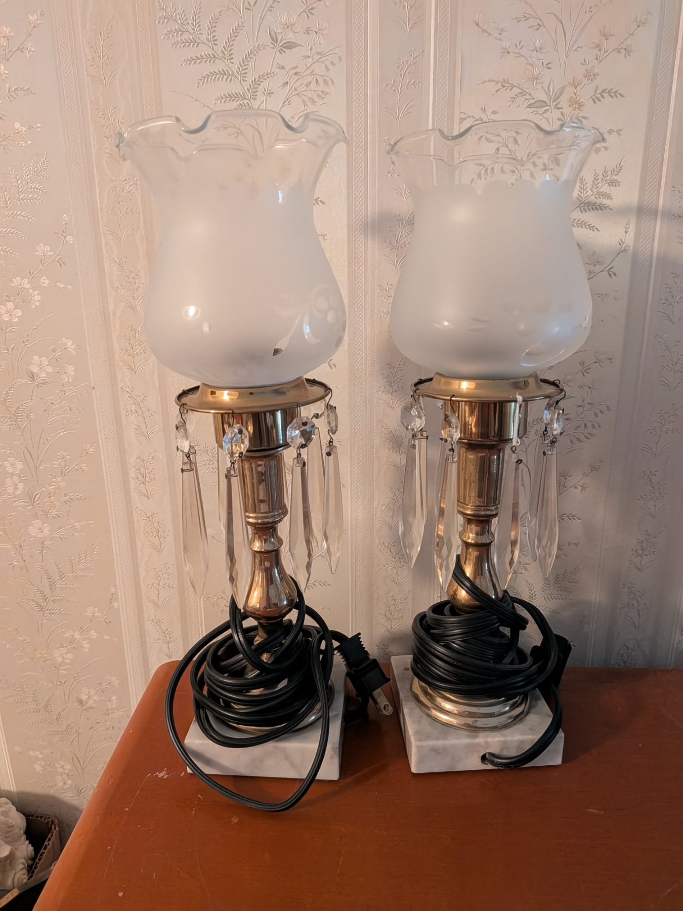 Matching Exquisite Vintage 13" Lamps With Marble And Hanging Crystals