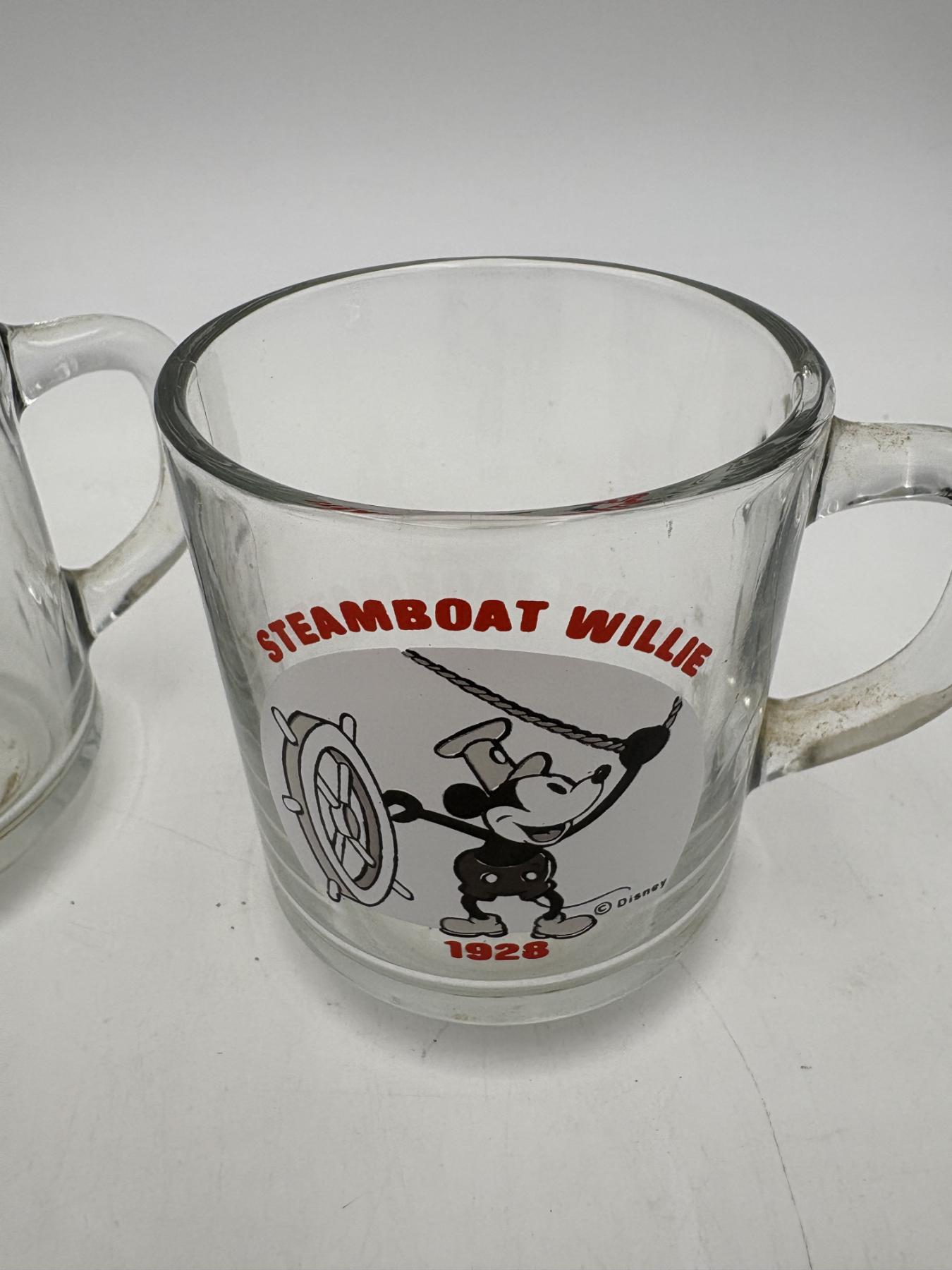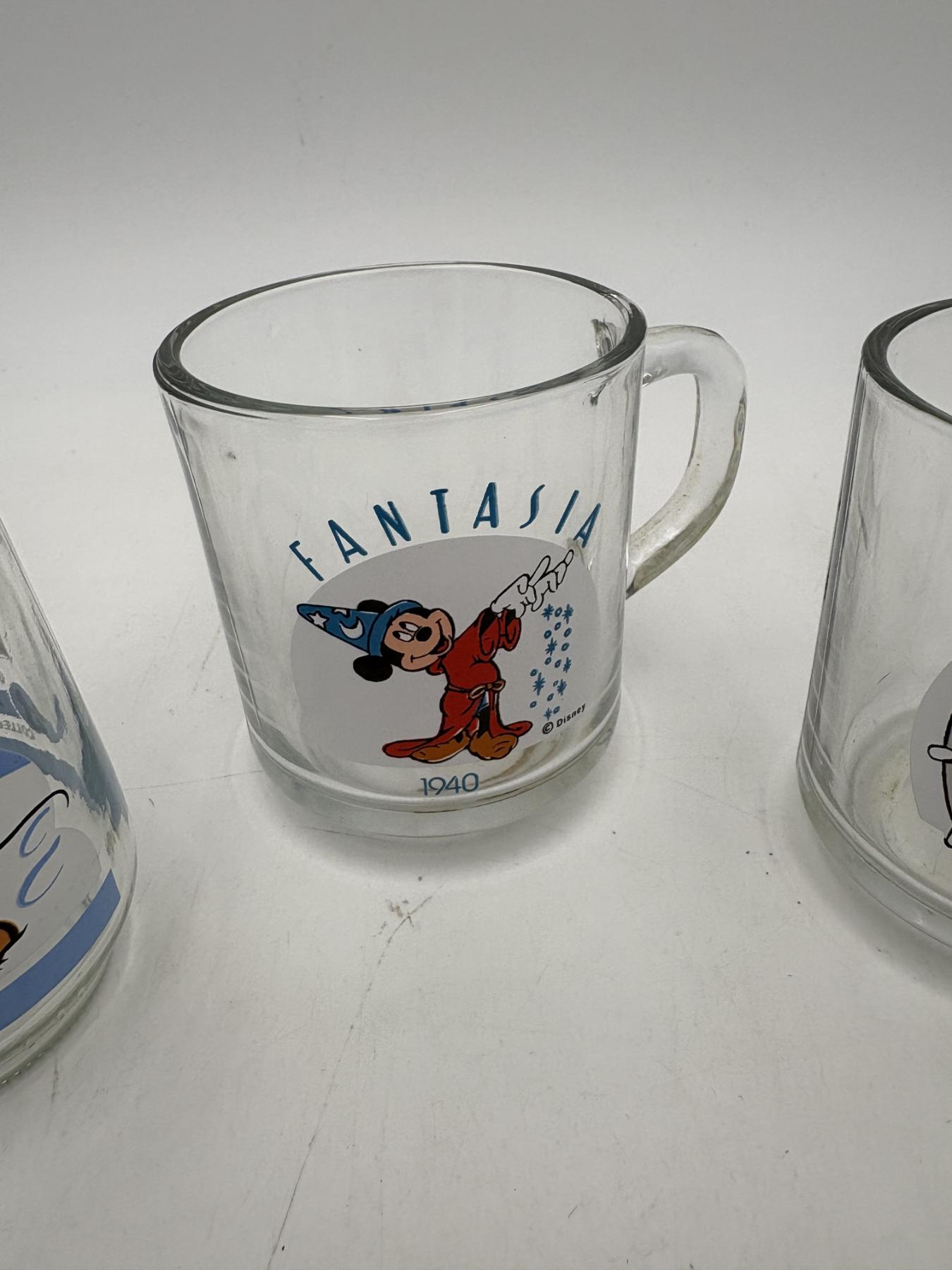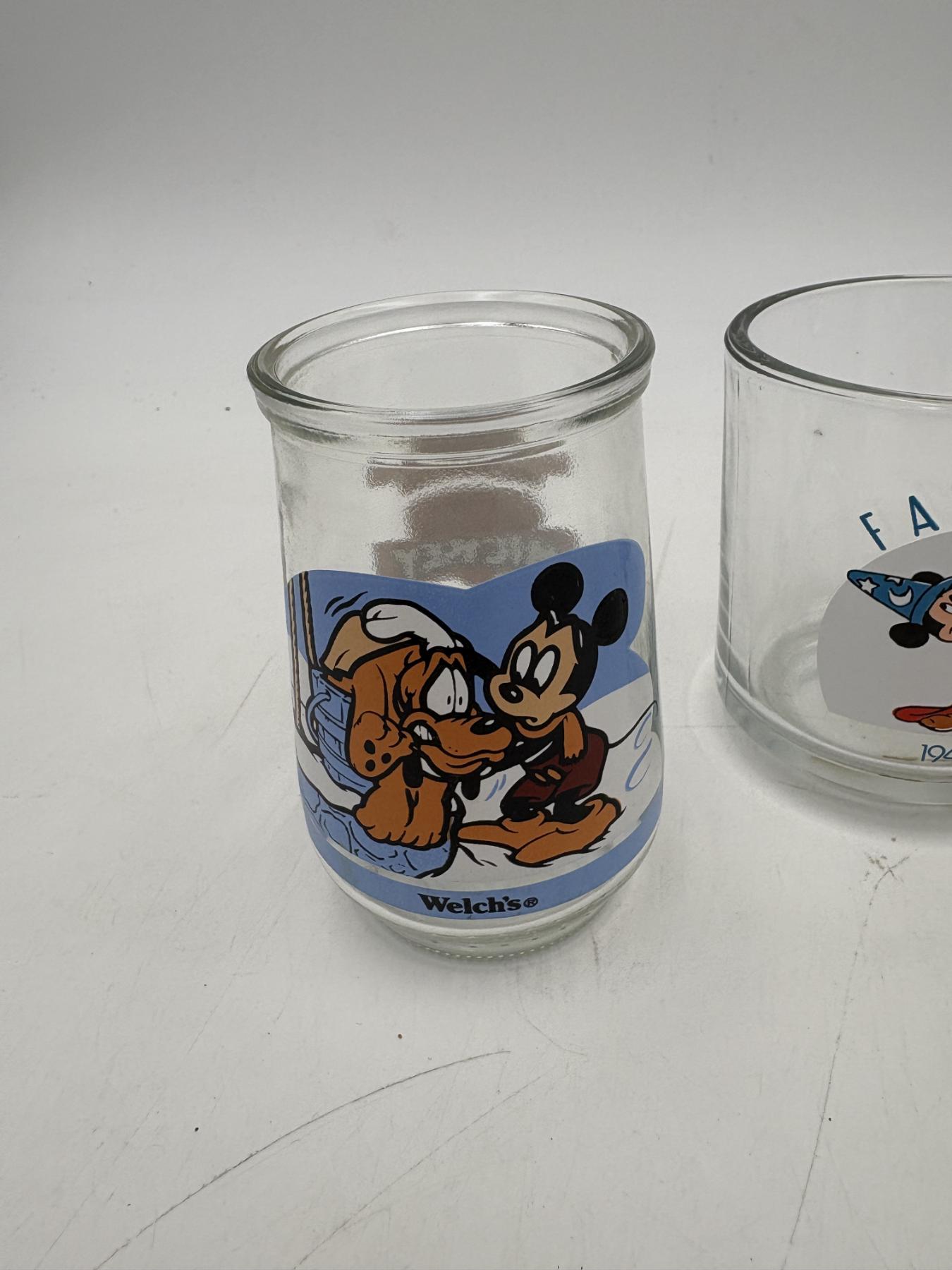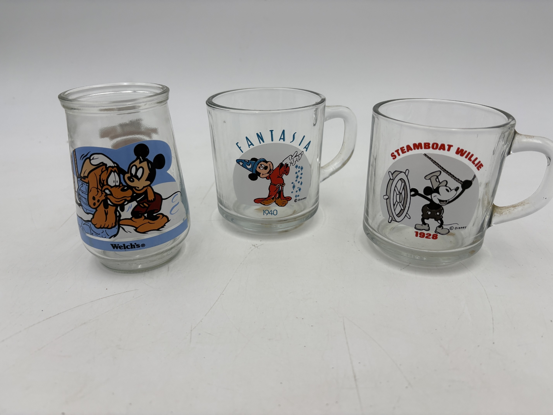 Mickey Mouse 3 Glass Mugs - Welch's Cup Mickey & Pluto - Collectible Cups - Steamboat Willie 1928 & Fantasia 1940