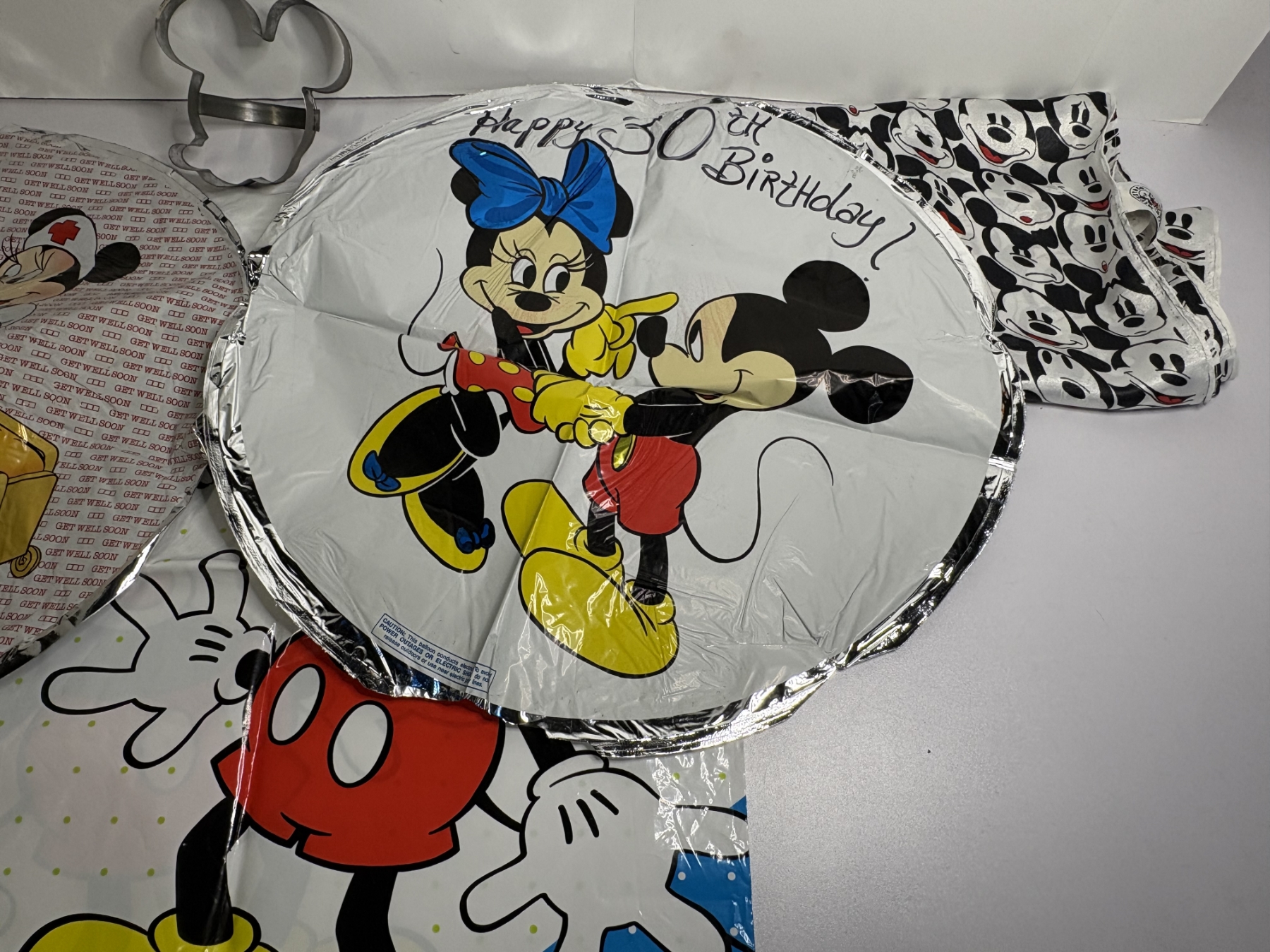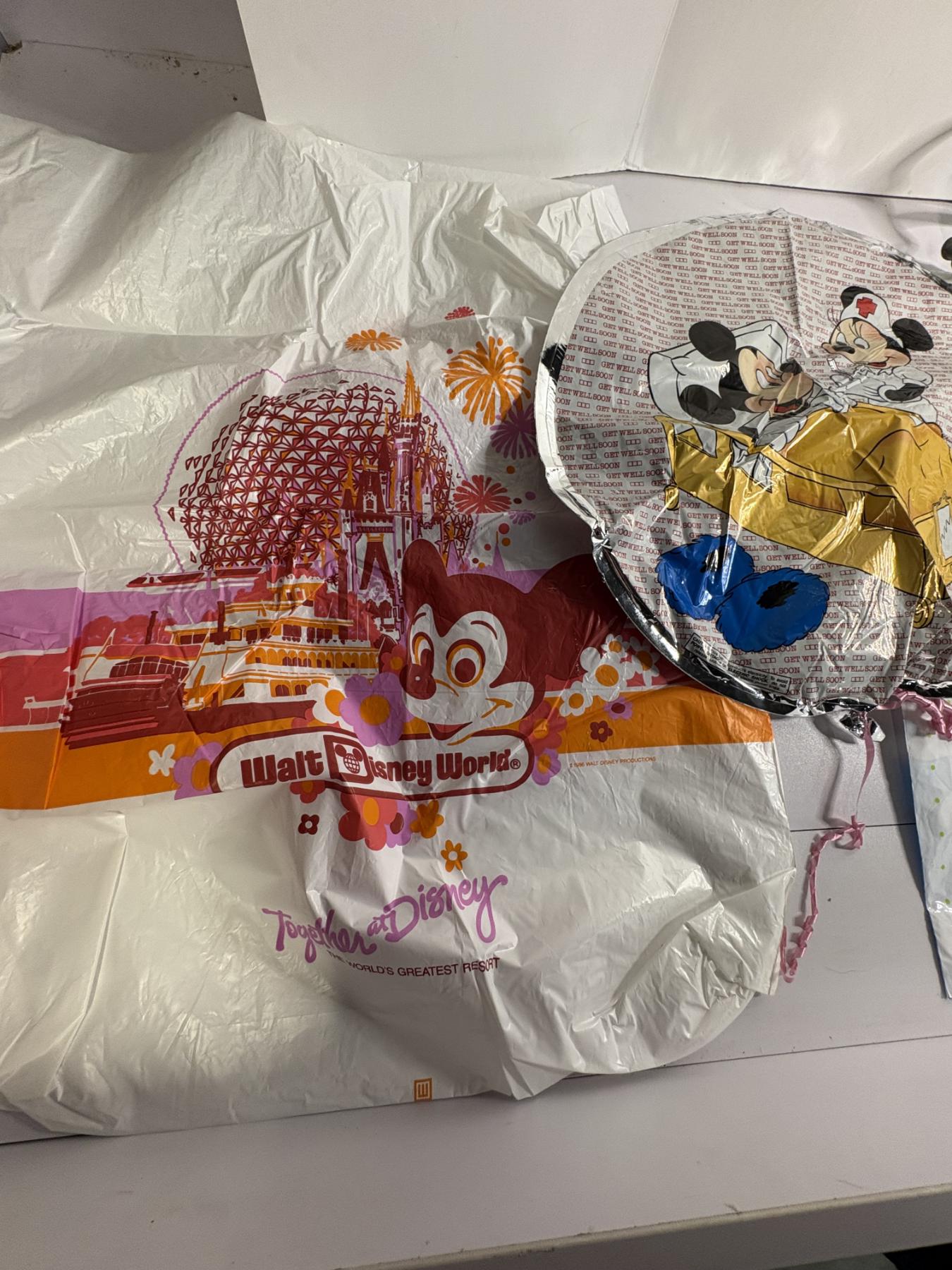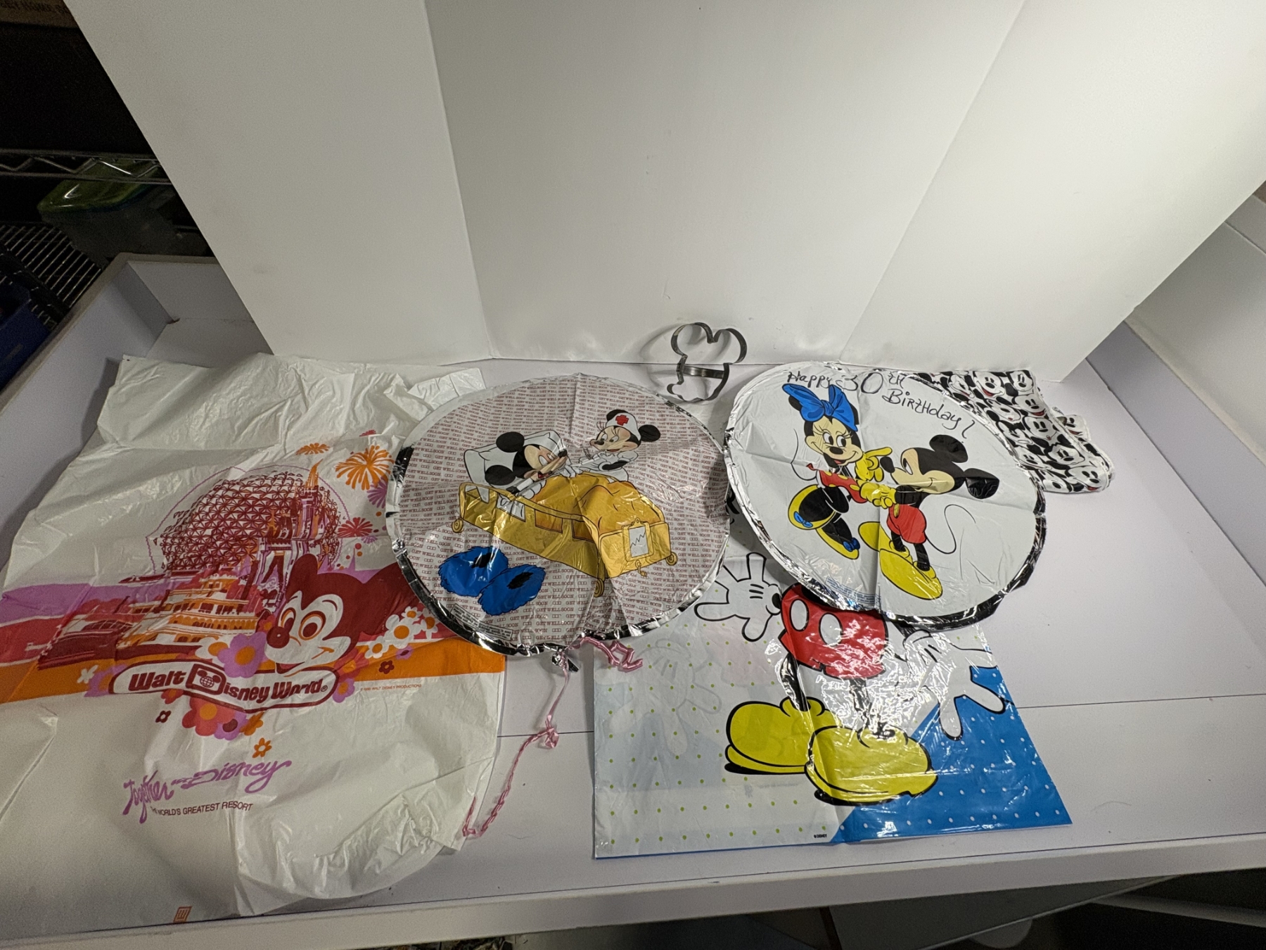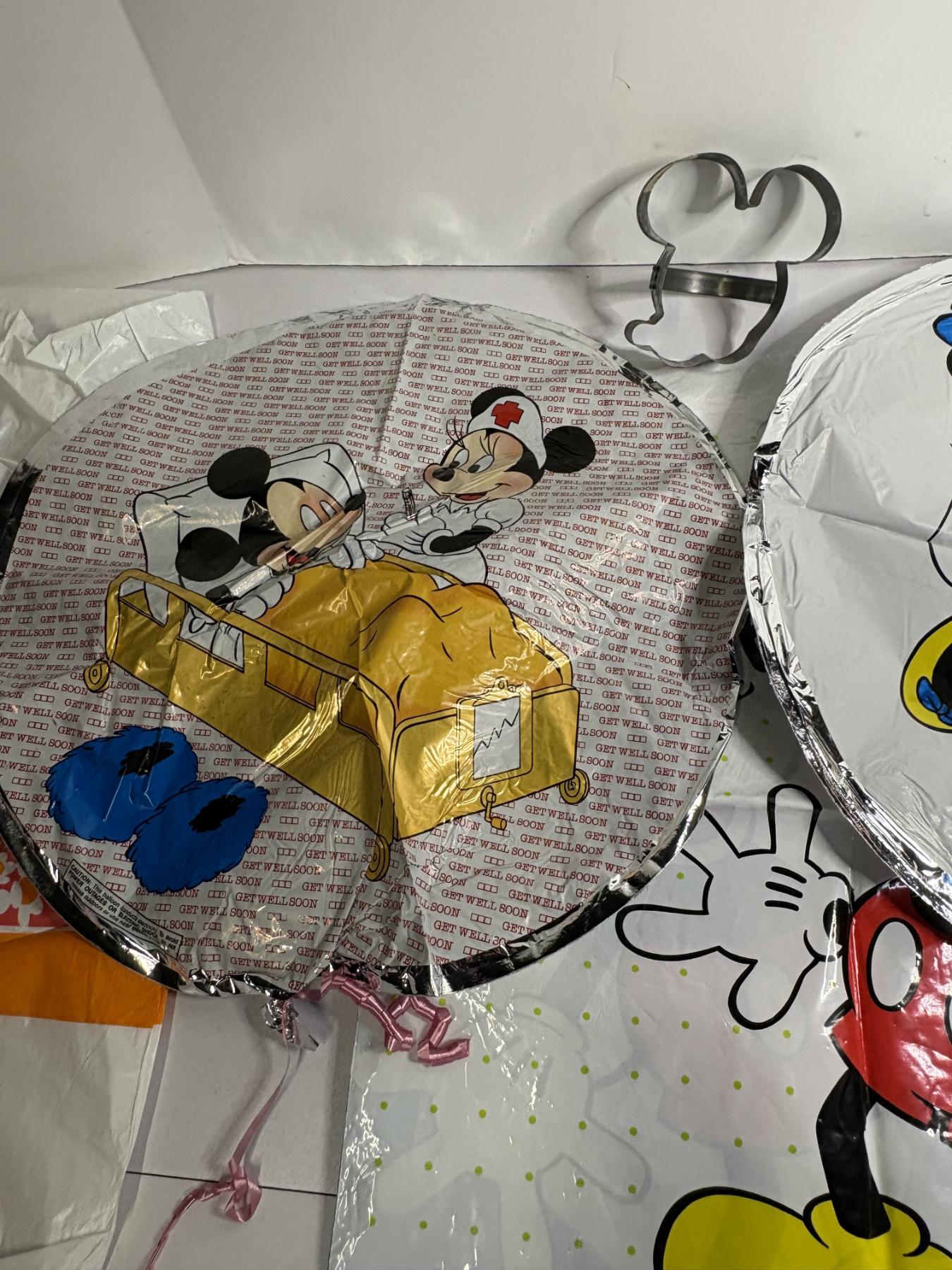 Mickey Mouse Disneyland Plastic Bag - Mickey Plastic Bag - 2 Helium Mickey Balloons - Mickey Mouse Cookie Cutter - The Disney Store - Walt Disney World - Happy 30th Bday Balloon - Mickey and Minnie Hospital/Nurse Balloon