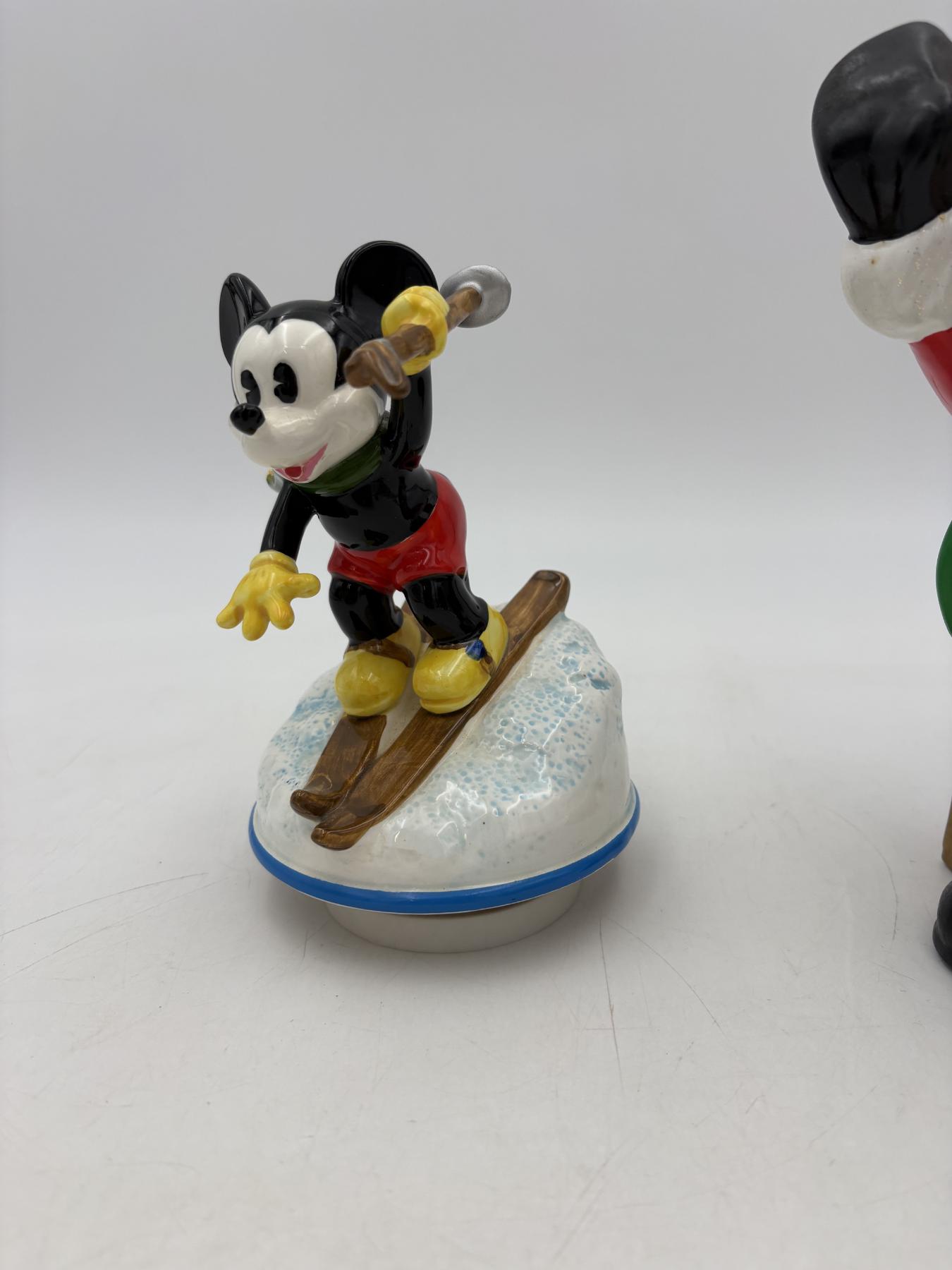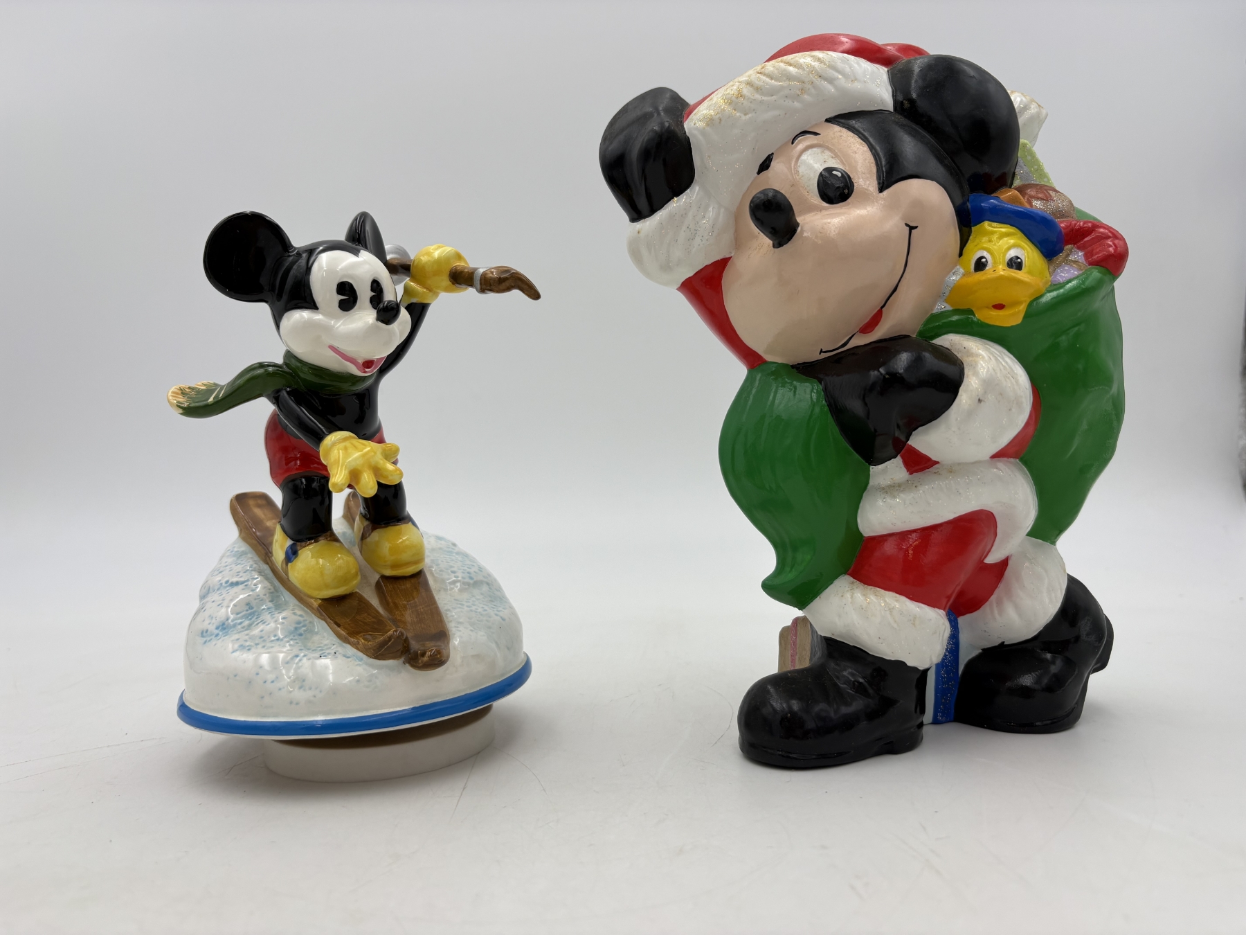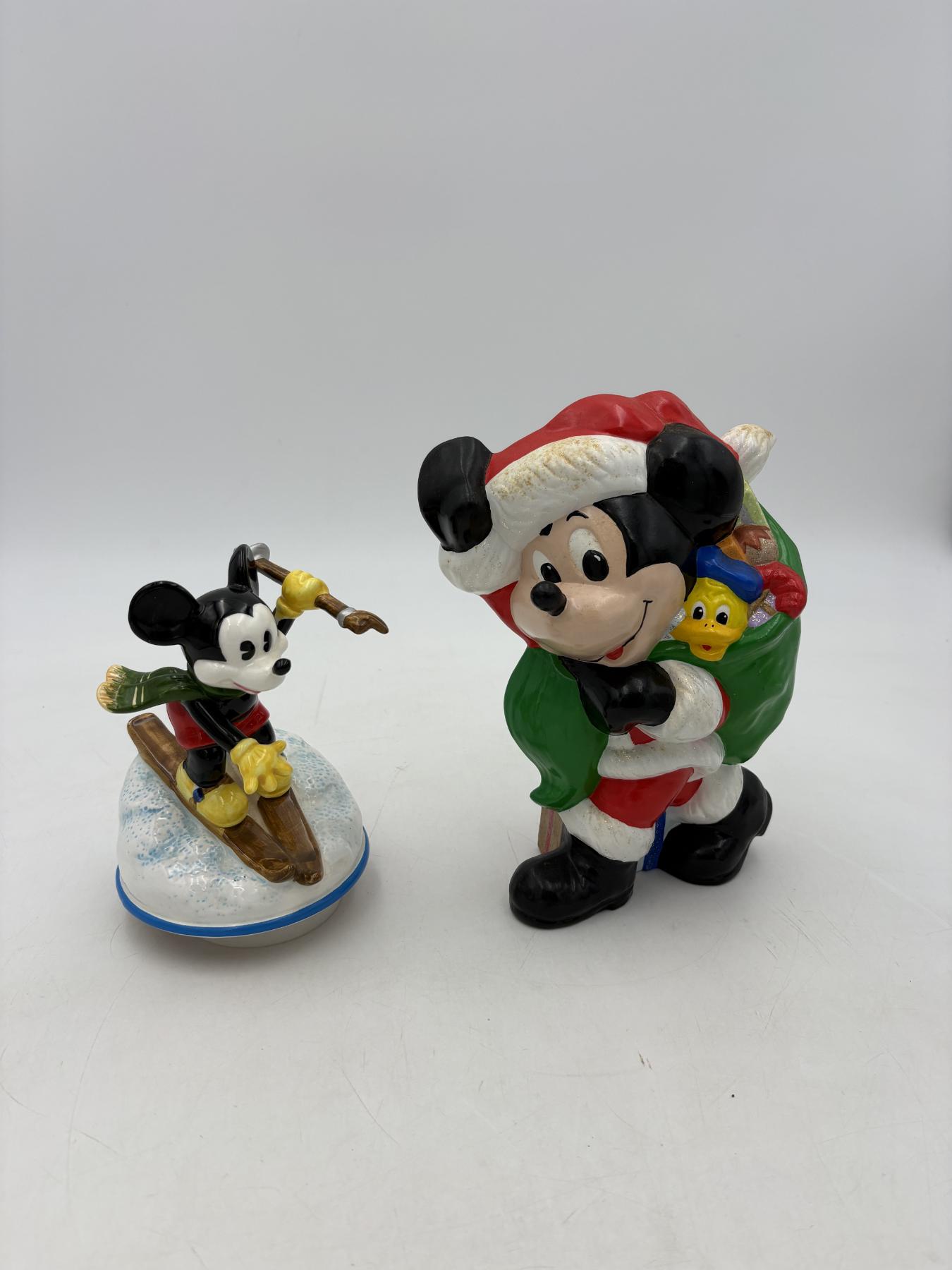 Mickey Mouse Santa with Bag of Toys with Donald Duck in it - Mickey Mouse Skiing Musical Box - Does work! - Santa = 9 inches - Skiing = 6.5 inches