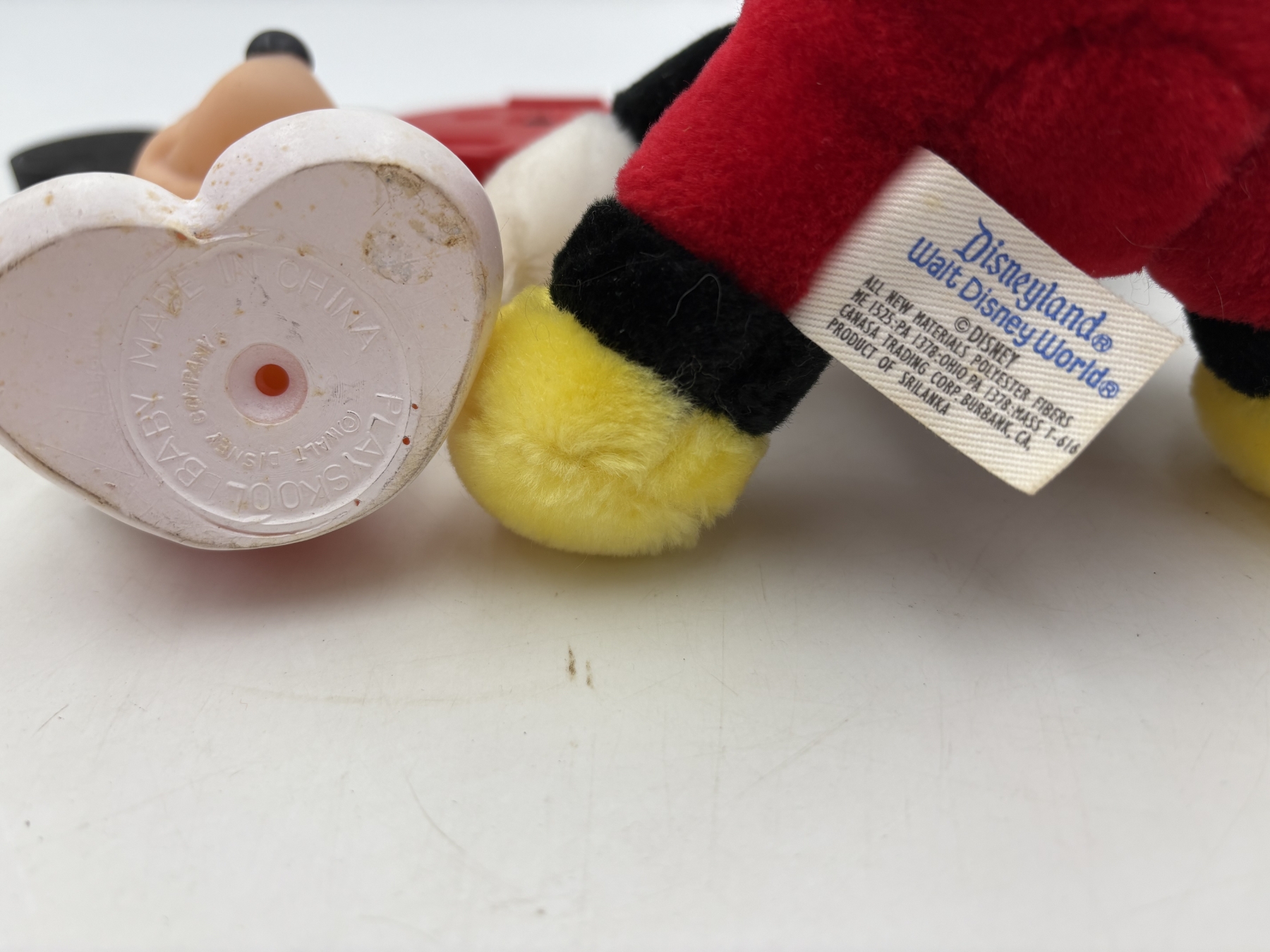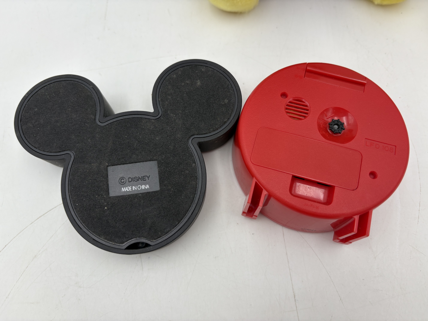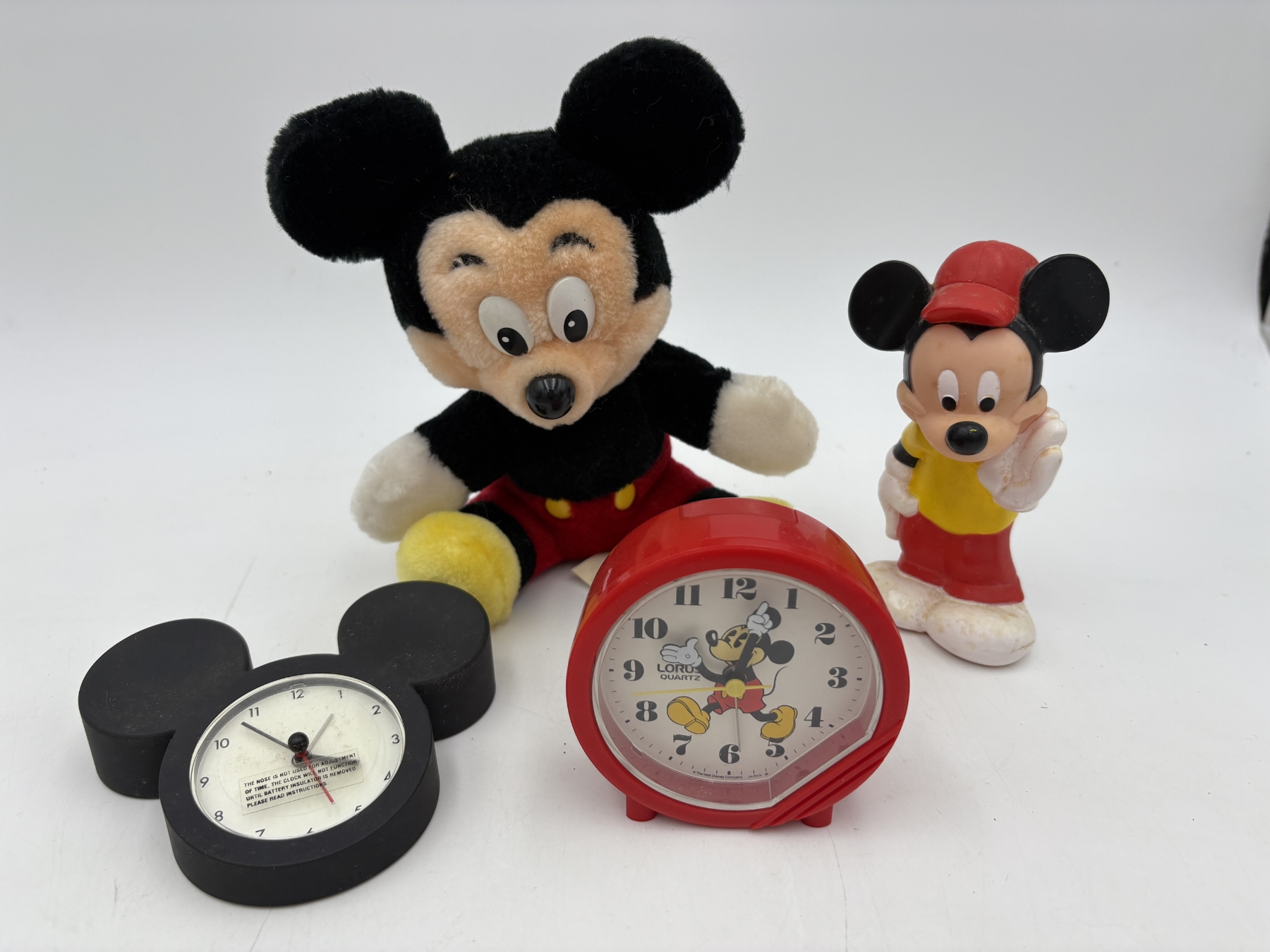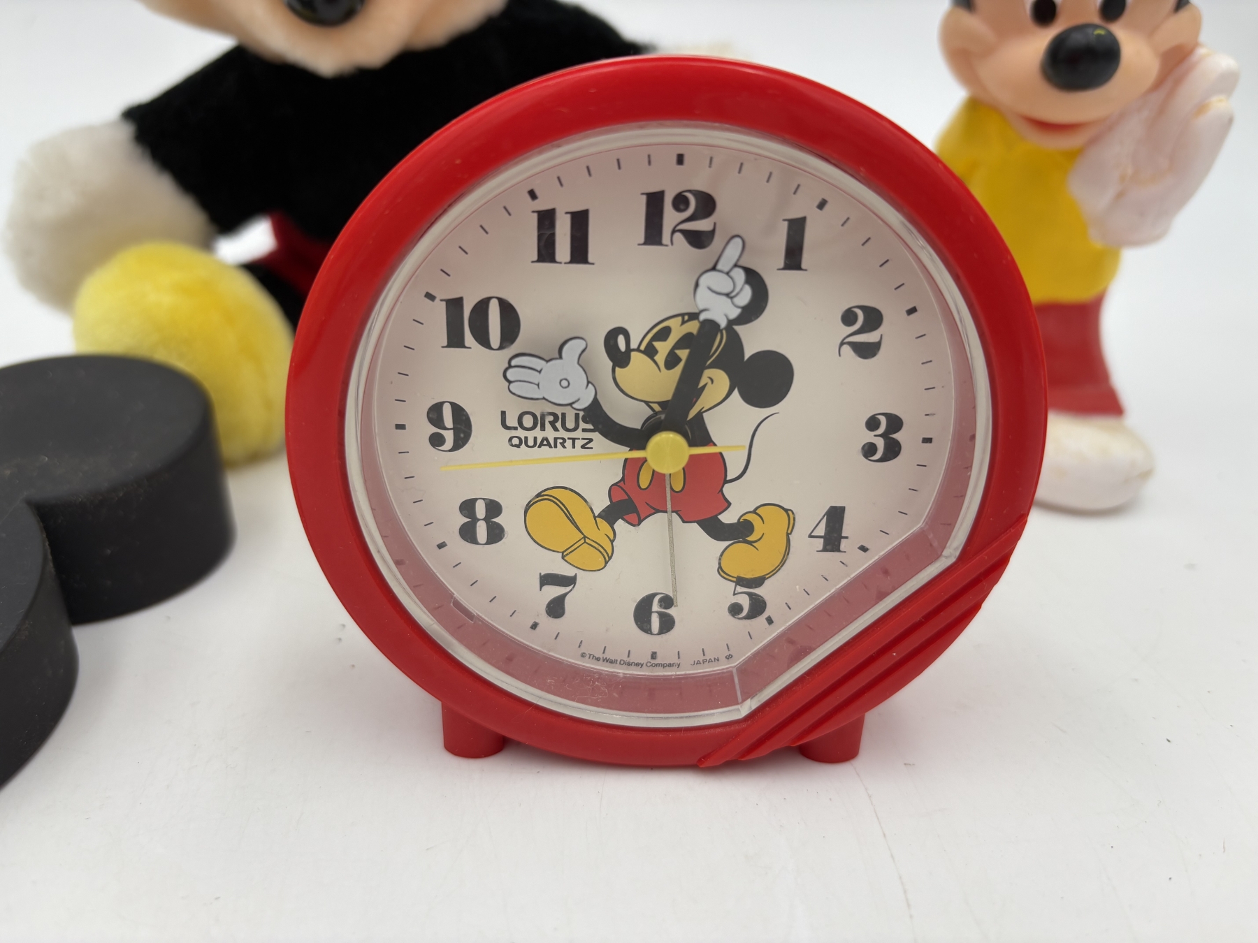 Mickey Plush - Mickey Figurine - 2 Mickey Mouse Clocks - Unknown Working Condition - Corroded Battery stuck in Red Clock - Lorus Quartz Clock - Walt Disney - Disneyland Plushie - Playskool Baby Mickey Figurine
