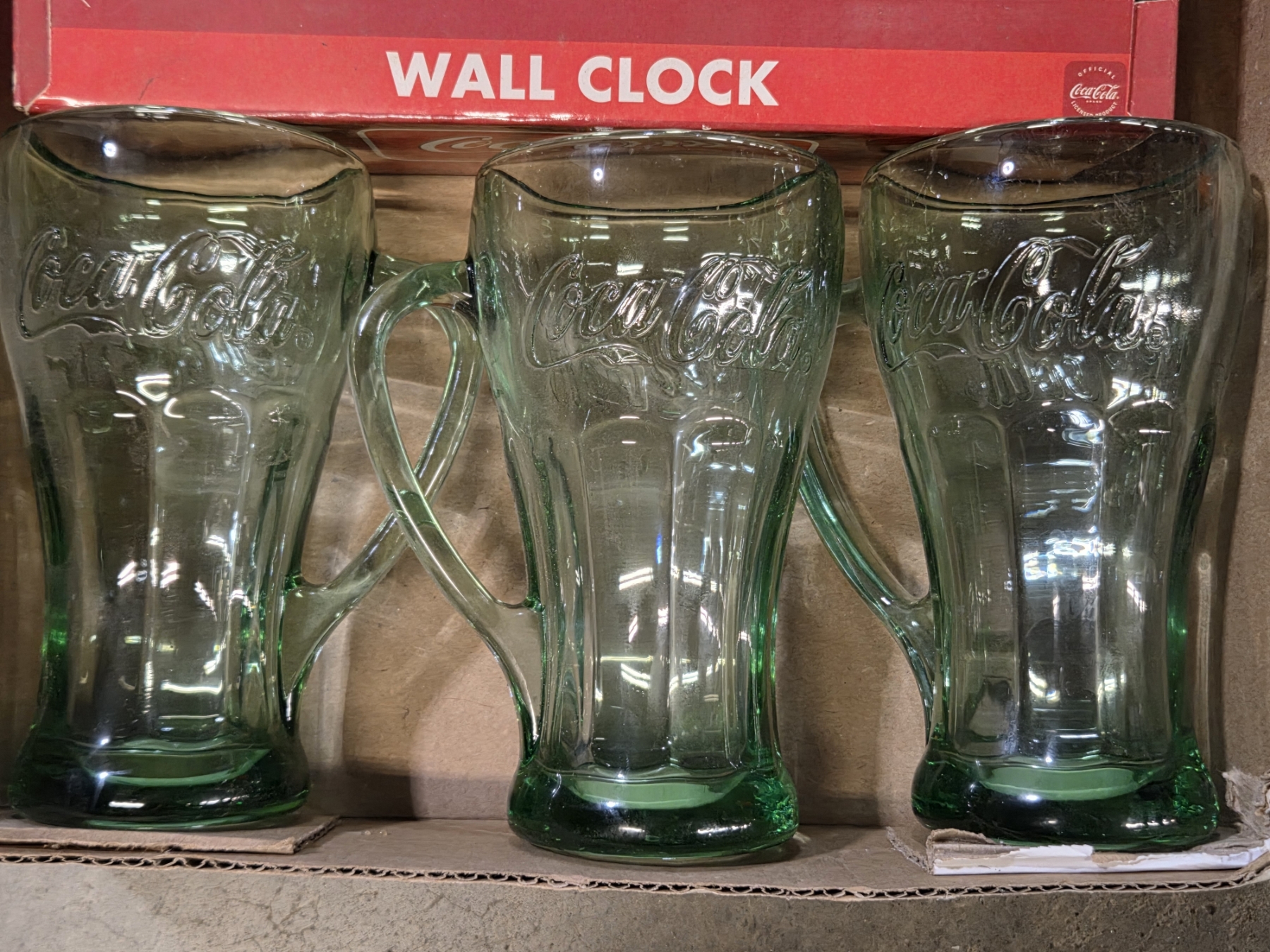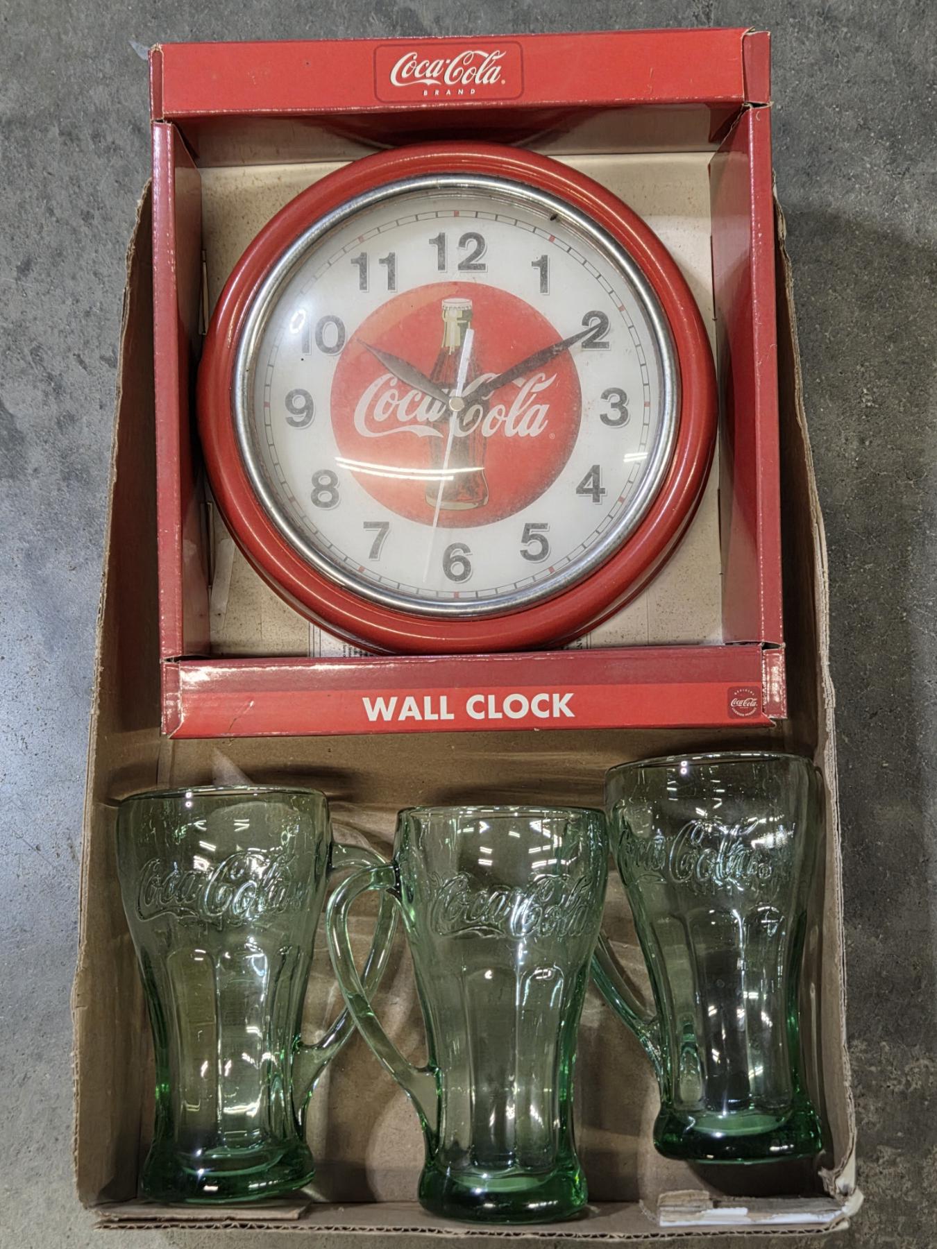 New! Coca Cola Wall Clock And Three Glass Coca Cola Mugs With Handles